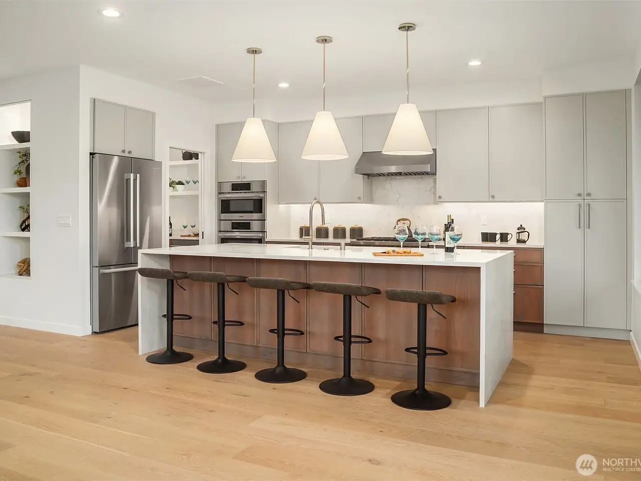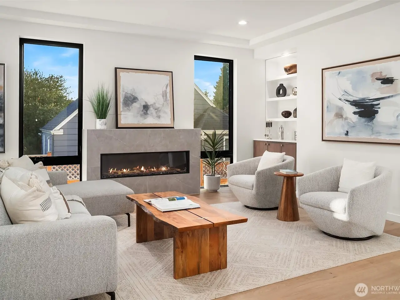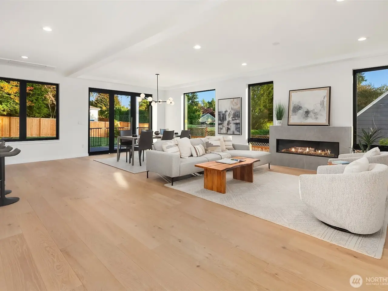 This gorgeous new NW Contemporary home has it all! Enjoy the gourmet kitchen with oversized quartz waterfall island, Bosch/Wolf appliances, and walk-in pantry. Find your focus in its sunlit office and relax in the large living room with fireplace, built-ins, and wide-plank hardwood floors. Entertain in the dining room with panoramic views and nano doors for seamless indoor/outdoor living onto the covered deck and huge backyard. Upstairs has 4 light-filled bedrooms including a primary suite with a five-piece heated-floor bath. The lower level contains a 1 bed/1 bath suite, 2nd full kitchen, living room, and separate entry, plus a rec room, 2-car garage, and mudroom. Perfectly located near Bryant Park, PCC, Seattle Children's, and U-Village.