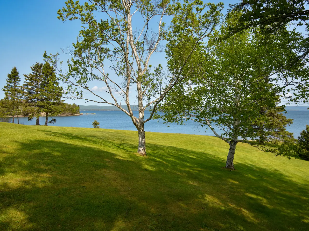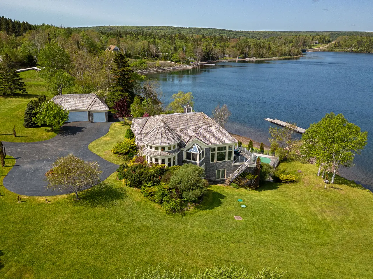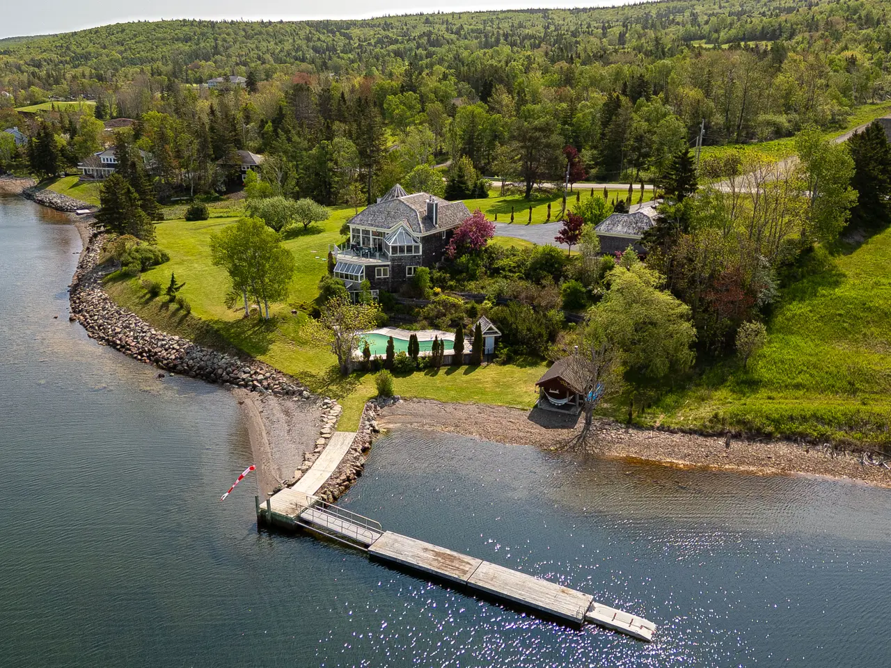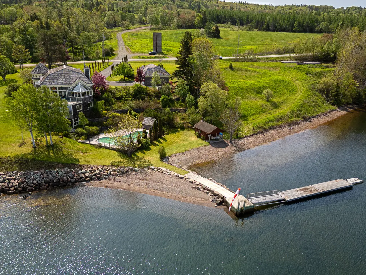 Welcome to an extraordinary waterfront estate in Dundee, Cape Breton—set on nearly three acres with close to 500 feet of shoreline on the Bras d’Or Lake, one of the world’s top island destinations. Nestled beneath the indigo hills and steps from the renowned Dundee Golf Course and Resort, this property offers a private sandy beach, deep-water access for a sailboat, and a quiet, sheltered microclimate. Cape Breton is known for golf, sailing, friendly people and natural beauty. From the road, the home appears as a charming cedar bungalow with turret, circular driveway, and landscaped grounds. But as you move toward the lake, the architecture reveals itself: three dramatic glass-fronted levels built into the hillside, capturing panoramic water and mountain views. Inside, the main level features open-concept living with a striking kitchen, wood-burning fireplace, dining area, large deck, and a generous guest suite. The lower levels include the primary suite, three additional bedrooms, and a combined games room and gym with walk-out access to the saltwater inground pool and beach. Hurricane-rated solarium windows bring the outdoors in—perfect for watching storms, stargazing, and enjoying sunsets over the lake. The detached multi-bay garage includes a workshop and a long bay for a boat, while a rustic log cabin by the shore offers extra guest space or a private retreat. Originally built by the family of Rod Bryden, former owner of the Ottawa Senators, this is a rare and elegant coastal haven in one of Nova Scotia’s most coveted locations.