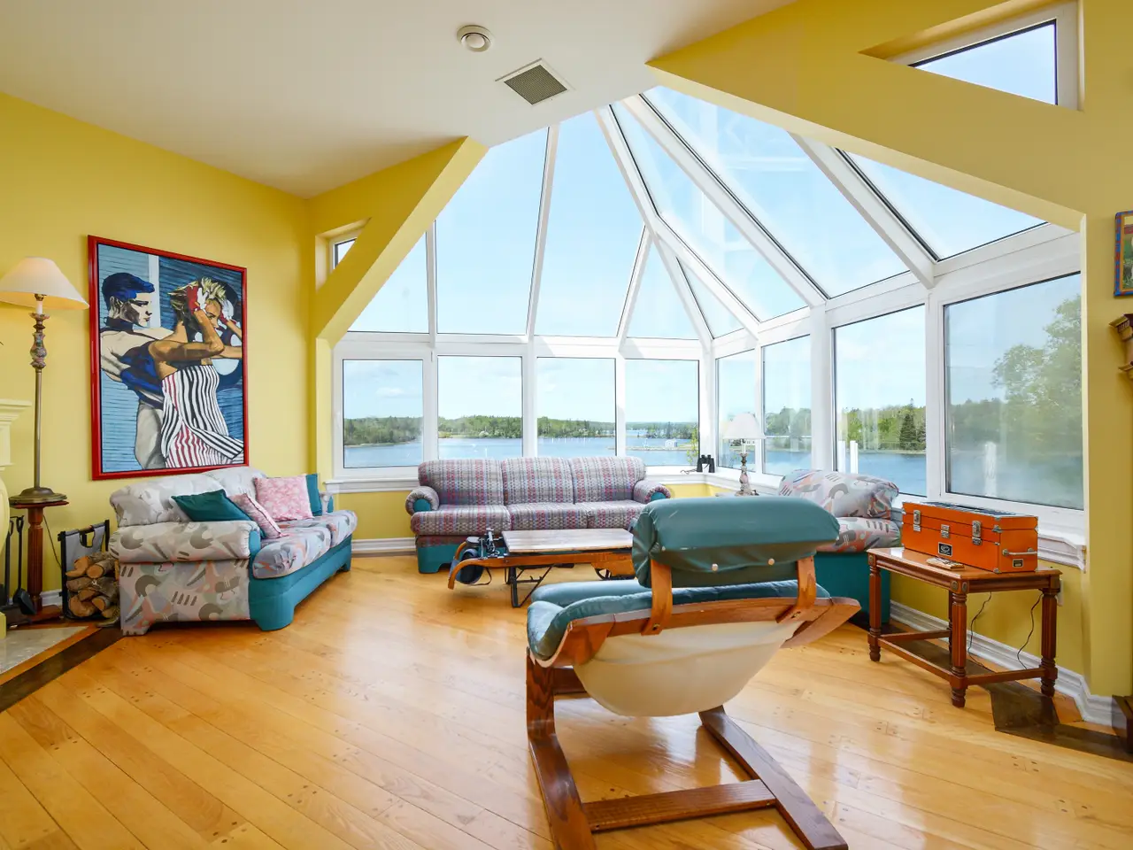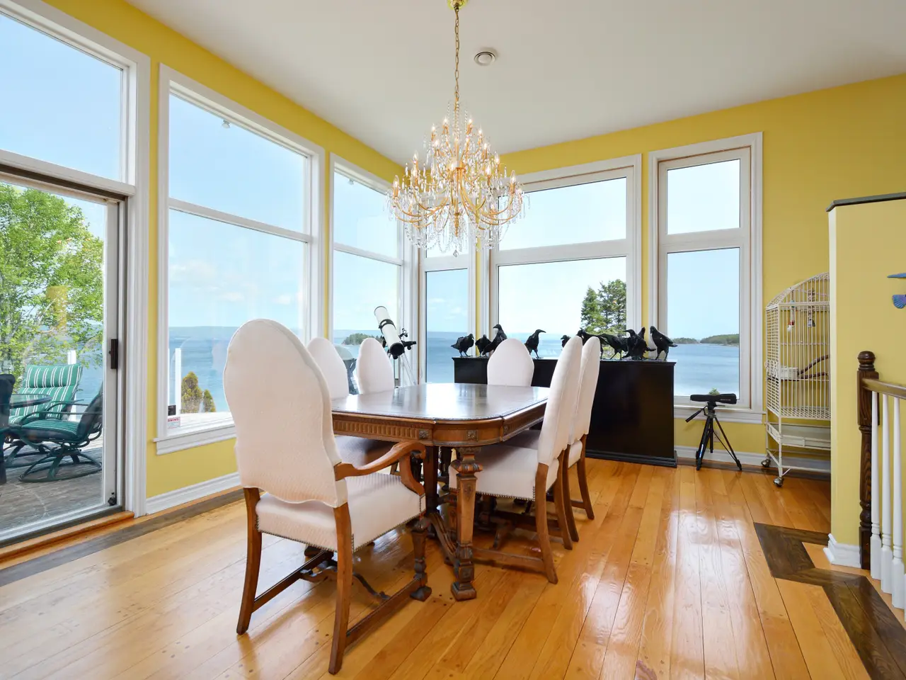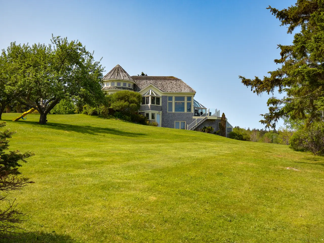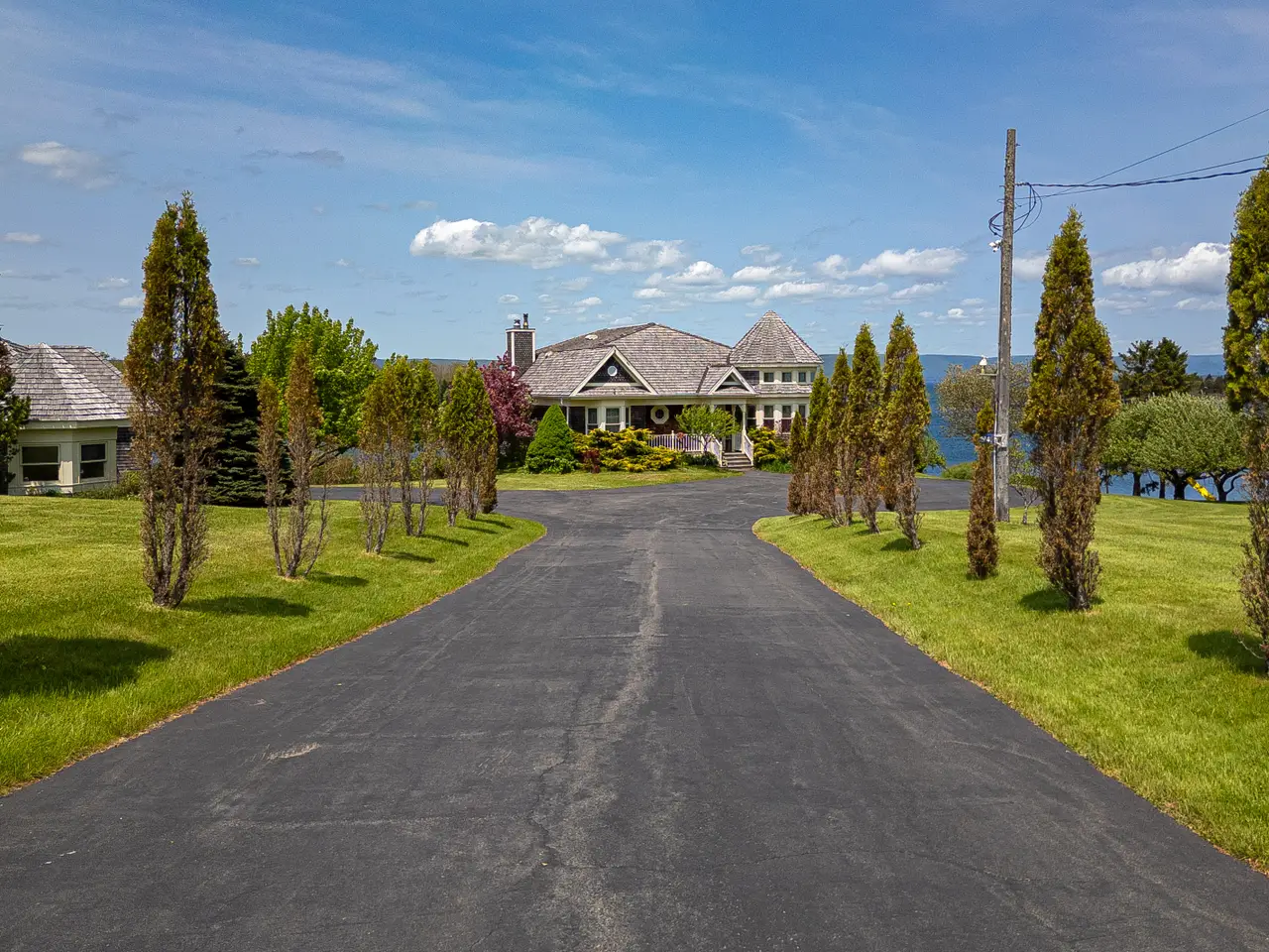 Welcome to an extraordinary waterfront estate in Dundee, Cape Breton—set on nearly three acres with close to 500 feet of shoreline on the Bras d’Or Lake, one of the world’s top island destinations. Nestled beneath the indigo hills and steps from the renowned Dundee Golf Course and Resort, this property offers a private sandy beach, deep-water access for a sailboat, and a quiet, sheltered microclimate. Cape Breton is known for golf, sailing, friendly people and natural beauty. From the road, the home appears as a charming cedar bungalow with turret, circular driveway, and landscaped grounds. But as you move toward the lake, the architecture reveals itself: three dramatic glass-fronted levels built into the hillside, capturing panoramic water and mountain views. Inside, the main level features open-concept living with a striking kitchen, wood-burning fireplace, dining area, large deck, and a generous guest suite. The lower levels include the primary suite, three additional bedrooms, and a combined games room and gym with walk-out access to the saltwater inground pool and beach. Hurricane-rated solarium windows bring the outdoors in—perfect for watching storms, stargazing, and enjoying sunsets over the lake. The detached multi-bay garage includes a workshop and a long bay for a boat, while a rustic log cabin by the shore offers extra guest space or a private retreat. Originally built by the family of Rod Bryden, former owner of the Ottawa Senators, this is a rare and elegant coastal haven in one of Nova Scotia’s most coveted locations.