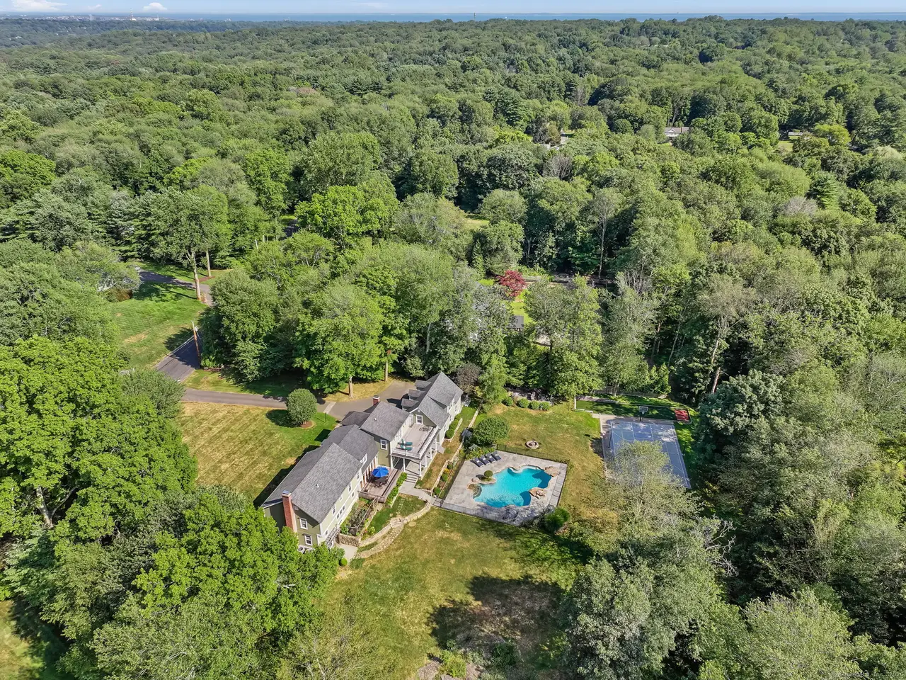 Welcome to 545 Shrub Oak Lane, an expanded Colonial on 2 private acres in Greenfield Hill. This home sits on a beautifully flat front yard that enhances its curb appeal. Fully renovated in 2012, the family room and oversized kitchen is the heart of the home. The custom designed kitchen has an 10 foot mahogany island with granite countertops, walk-in panty, and mahogany wood framed glass doors that create a seamlessly indoor-outdoor experience. The first level offers a formal living and dining room, an office and an expanded mudroom. Upstairs, the primary suite includes french doors to a private deck, a steam shower, a jacuzzi tub, walk-in closet, and a separate sitting room. Four additional bedrooms, two baths, and laundry room complete the upper level. The lower level offers a rec room, extra laundry, an office and ample storage. The oversized three-car garage with unfinished bonus space above is ideal for a in-law suite or future expansion. Outside is an entertainer's paradise, a custom designed lagoon-style pool with diving rocks, multiple bluestone patios, an elevated covered patio, two mahogany decks and an incredible recreational setup, including a full-size lighted basketball court, a turf area for bocce ball/batting cage, fire pit and more!