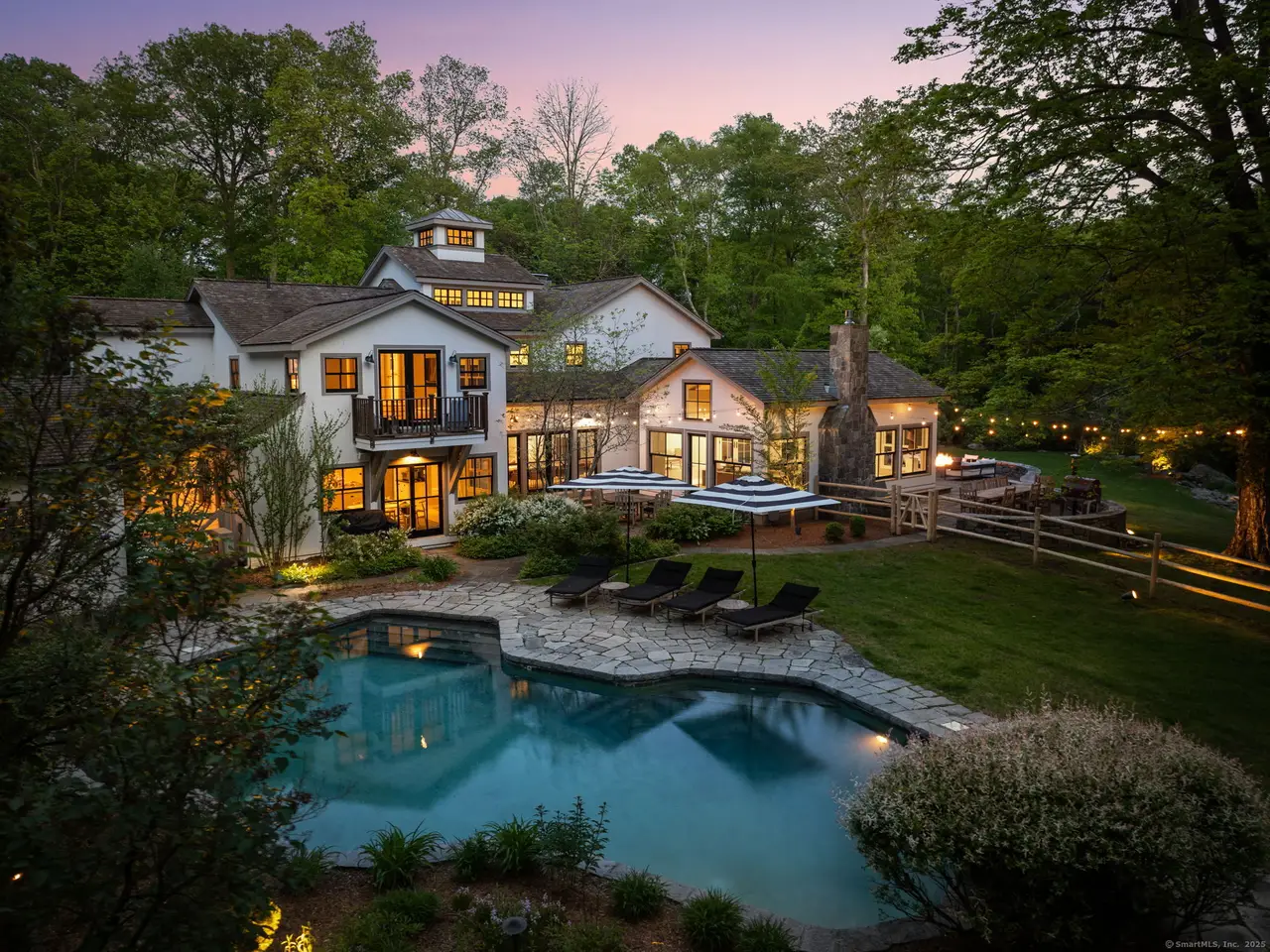 California meets New Canaan in this William Wurster inspired transitional-style masterpiece set on 2.54 private acres on New Canaan's desirable west side that's so convenient to town. This extensively renovated home has over 100 custom windows and 16 doors bringing the outside in from every room. Amazing sun-drenched living space with wonderful views from EVERYWHERE. French doors lead to expansive bluestone terraces, a beautiful gas fire pit for entertaining, meticulously manicured flower gardens, pool, spa and river. Five bedrooms, four-car garages, au pair suite and an exceptionally designed layout make this home a sensational haven with the warmth of a colonial but so fresh!