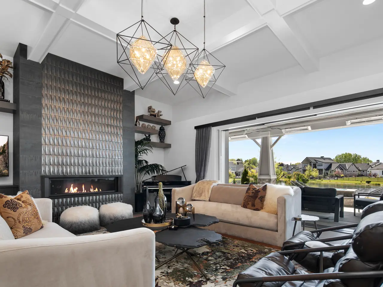 Welcome to this dazzling waterfront oasis in Eagle Idaho's Creighton Woods where luxury meets tranquility. This new, custom-designed house fuses organic modern, mid-century & glam styles seamlessly. Indulge in a chef's paradise with Thermador appliances & designer fixtures. Relax in the spa master bathroom with heated floors & automated shades throughout the home for effortless light control. Entertain in the theater room or outdoor kitchen with stunning sunsets as your backdrop. Enjoy cozy nights by the gas fire pit or in your sunken spa through a powered pocket sliding patio door. This home features designer lighting, wide plank hard wood floors, security system, & oversized bedrooms for comfort. Don't miss the gym, epoxied garage floors, and hot water recirculation. Experience luxury living with multiple hardwired patio heaters, a wet bar in the theater room, and even a dog washing station. With its stunning views, this home offers unparalleled comfort & sophistication. Welcome to your dream retreat!