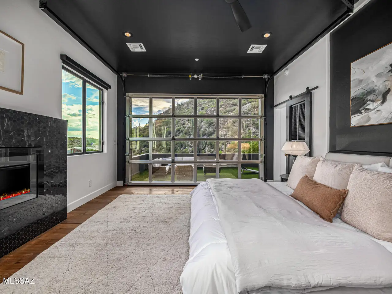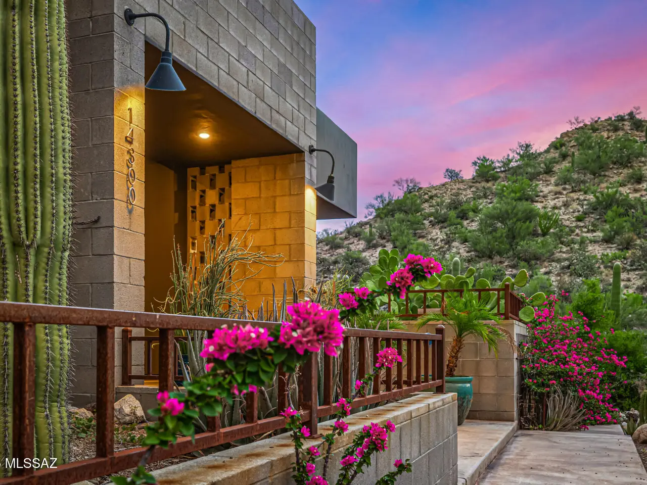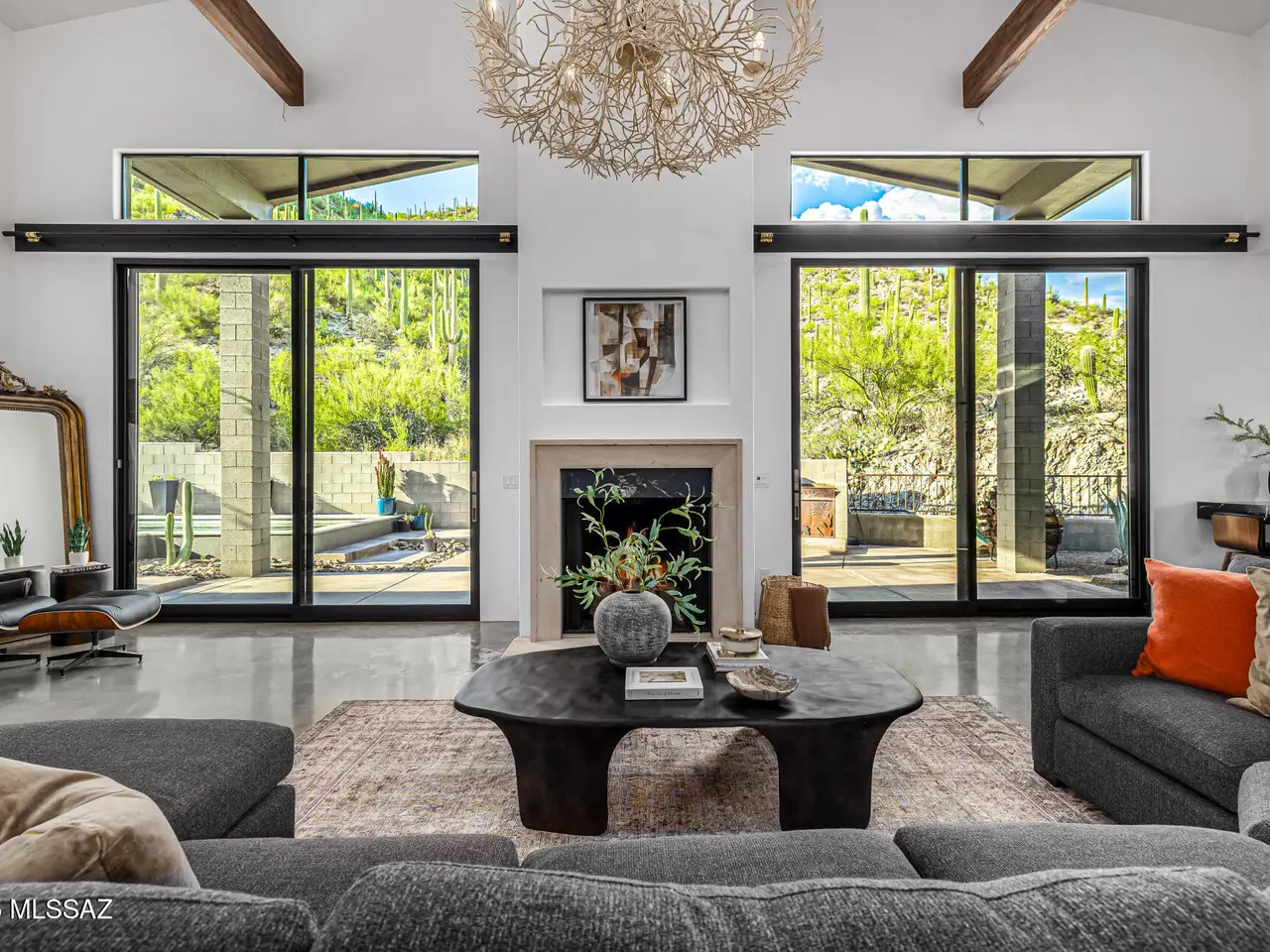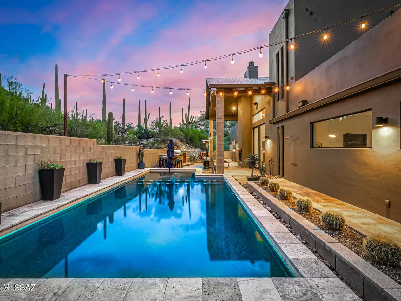 Nestled deep in the scenic Tortolita Mountains, this fully custom-built 2018 estate combines refined design with extensive upgrades inside and out. The property welcomes you with an asphalt driveway, elegant paver accents, and professionally landscaped grounds featuring outdoor lighting, solar lamps, a decorative fountain, and a custom-finished front entry. All the doors used in the home were from the historic Hotel Hidalgo! The roof has been resealed and the exteriors freshly repainted. Enjoy resort-style outdoor living with a sparkling pool (new heater), a mesquite-mantle fireplace with a custom screen, propane starter, built-in barbecue mechanics, and decorative fencing. Set against a backdrop of untouched desert beauty, the estate offers breathtaking 360-degree panoramic views of Tortolita Mountains. Expansive windows and outdoor living spaces capture glowing sunrises, dramatic sunsets, and sparkling city lights after dark. Natural desert wildlife surrounds the property, creating a private sanctuary with a front-row seat to the beauty of the Sonoran Desert. Inside, the upgrades continue with quartz kitchen countertops, a waterfall island, refinished cabinetry and hutch, and updated hardware and lighting. The great room showcases a propane fireplace setup with custom logs, while electrical dimmers and halogen bulbs create ambiance throughout. Additional features include refinished teak entry doors with glass panels, repainted interior doors and ceilings, ceiling fans in all bedrooms, a staircase runner, and polished concrete floors. Comfort is maximized with mini-splits in the master and first-floor bedrooms, as well as Tucson rolling shutter blinds in every bedroom plus electronic rolling shutter for the master suite's large glass doors and the second-floor landing. Perfectly designed for entertaining, the home is wired for interior and exterior sound, blending luxury, function, and style at every turn. This is a true desert sanctuary, offering both sophistication and serenity.