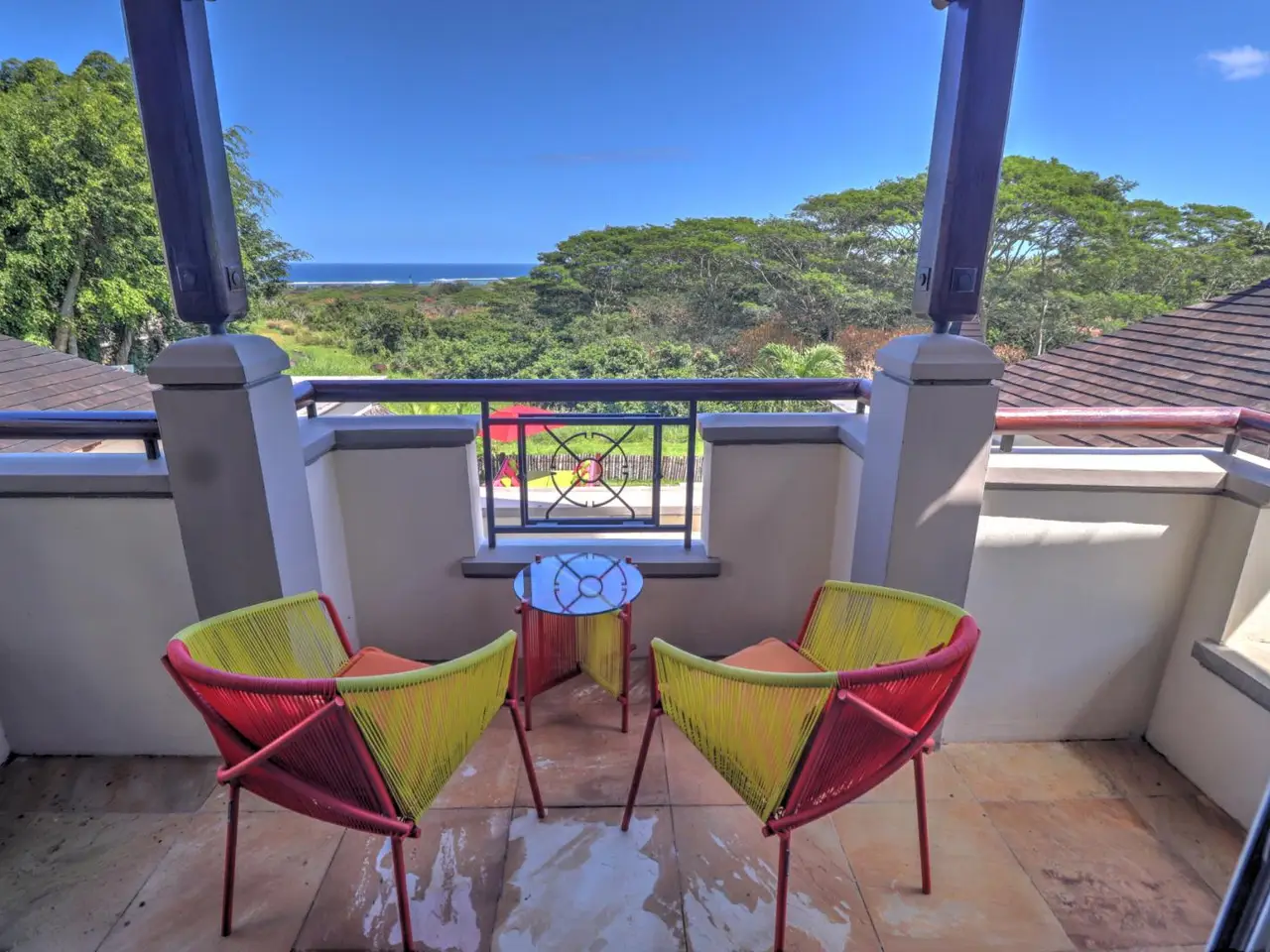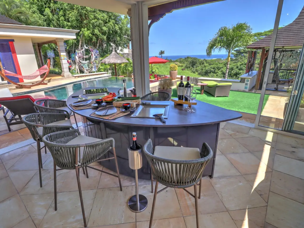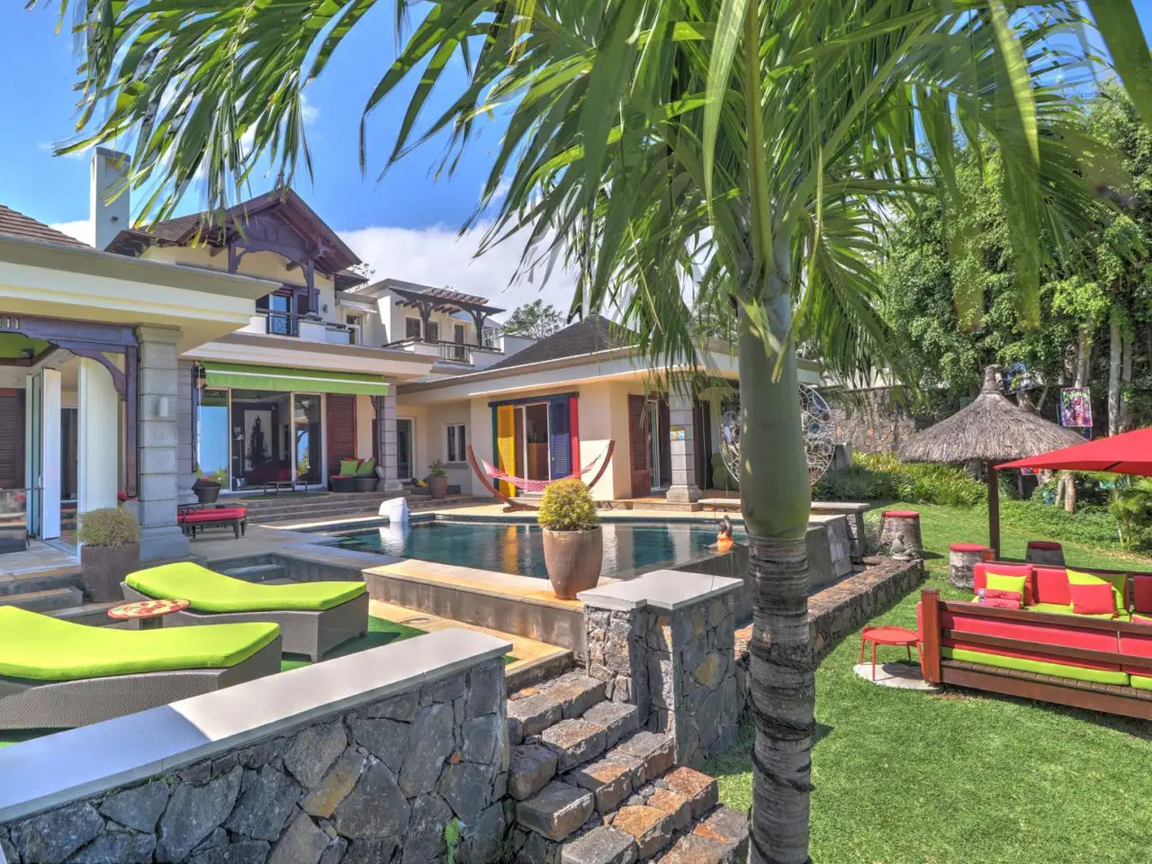 This 3-bedroom villa for sale in Heritage Villas Valriche, a reputed golf estate in the South-West of Mauritius, boasts exceptional sea views, colourful rooms and a hand-picked art collection. Known for its bold hues and personalised features, the property makes a bold statement in one of the most renowned golf estates in Mauritius. The property is situated on a spacious plot of 1350 m2, offering 2 swimming pools, a multipurpose basketball/badminton court , a private jacuzzi corner, a cinema room, an entertainment room, a covered fitness area by the main pool, 2 garages with three golf carts included in the price, and an outdoor teppanyaki bar. The 409 m2 villa, is dotted with a selection of art pieces, curated from across the world and included in the sales price. One of the bedrooms makes the ideal guest suite with its private bathroom, kitchenette, lounge and private terrasse. The spacious main bedroom is found on the first floor with lovely views of the sea. The new owner will not only benefit from the indulging lifestyle features this property has to offer, defined by statement pieces and leisure furnishing, but the latter will also be able to access the estate’s established facilities and clubs such as: the Heritage golf club, the gastronomic restaurant situated at the historic Chateau de Bel Ombre, private nature reserves, the C beach club providing residents access to the beach, as well as privileged access to the estates luxury partner hotels. With permanent residency upon purchase, and hands-on conciergerie services provided by the estate for owners looking to rent when not on Island, this is the ideal investment for those looking to have an exceptional property in a sought-after establishment where refined leisure is a at its core.
