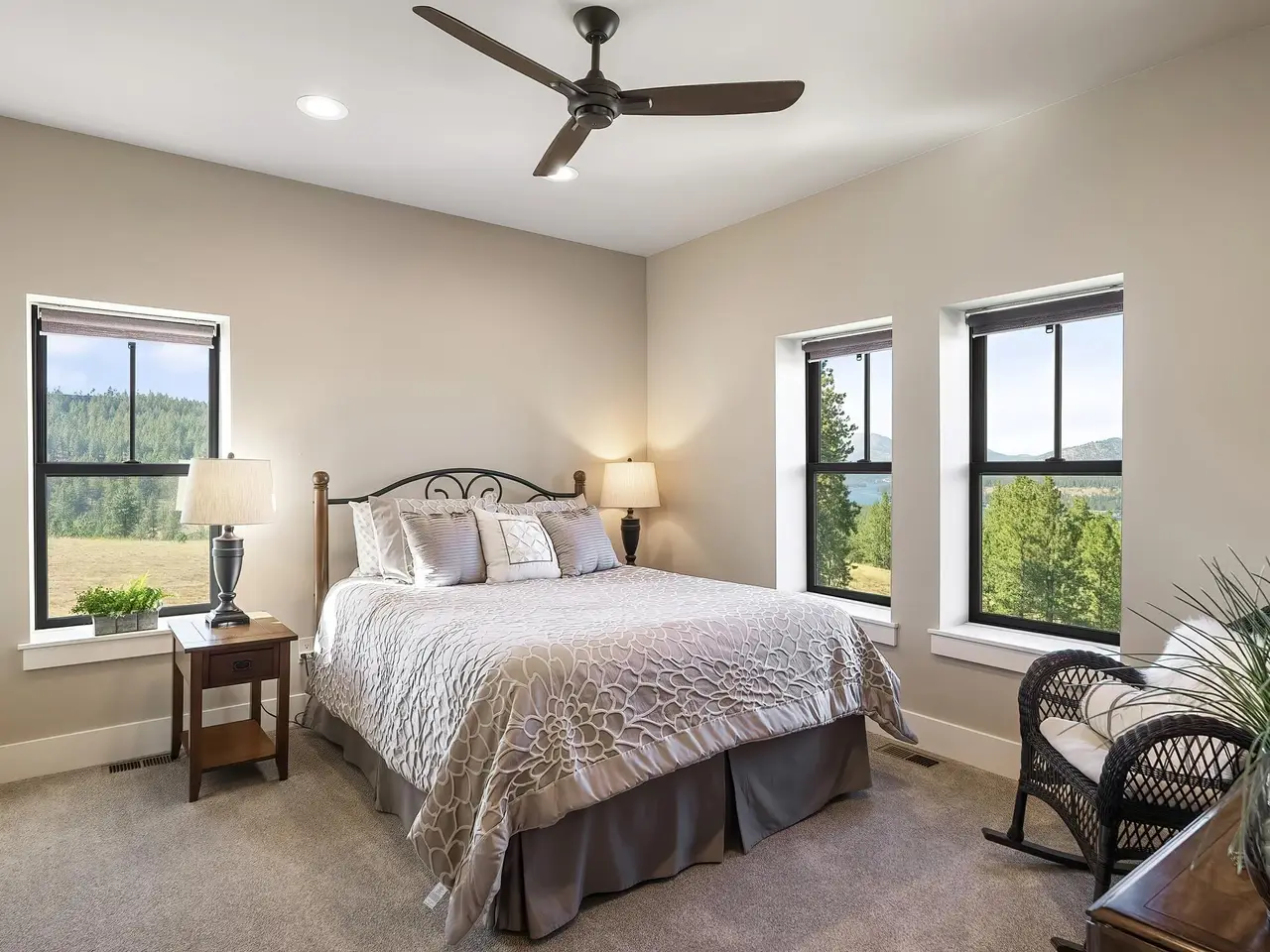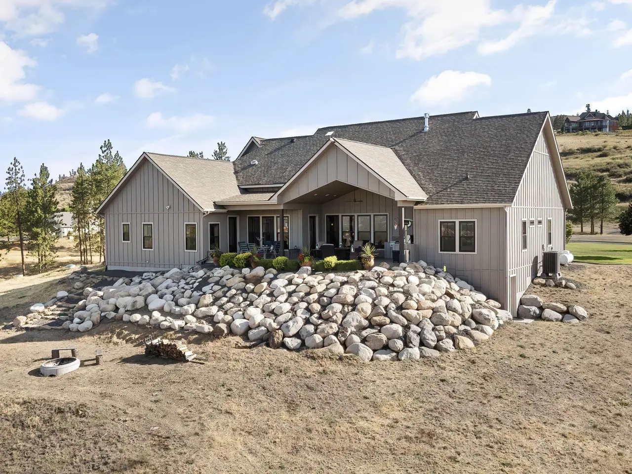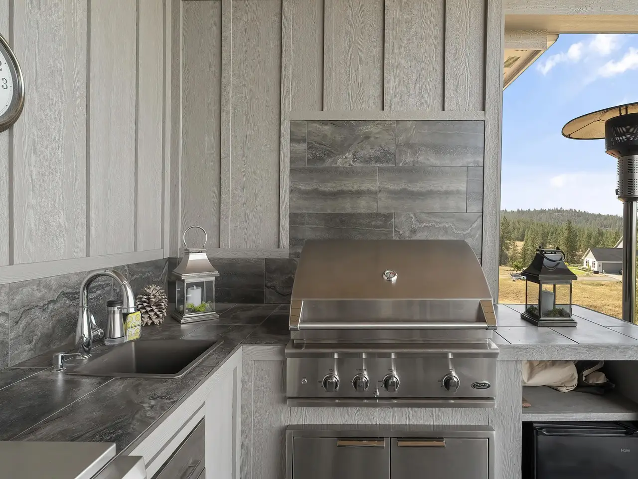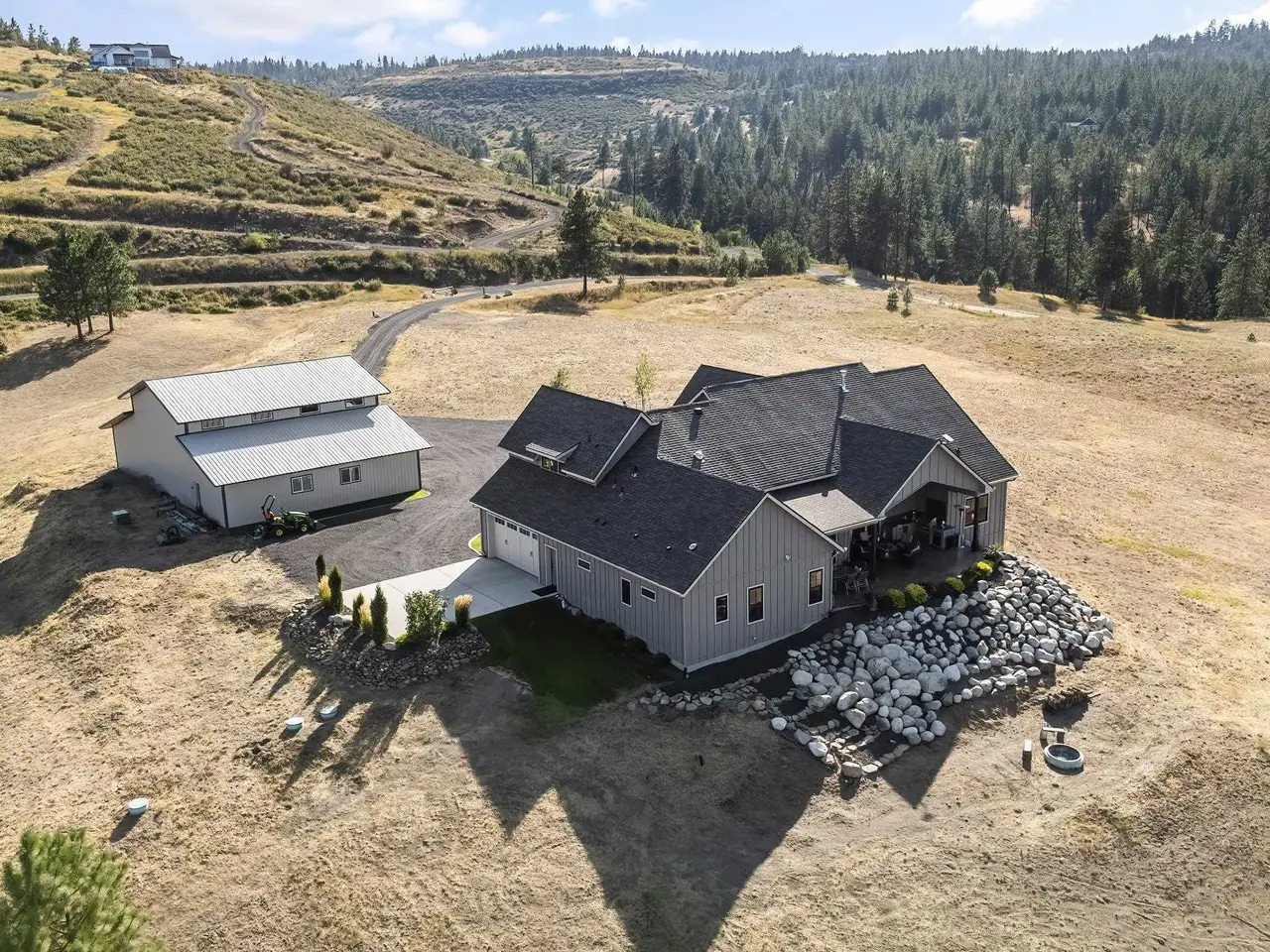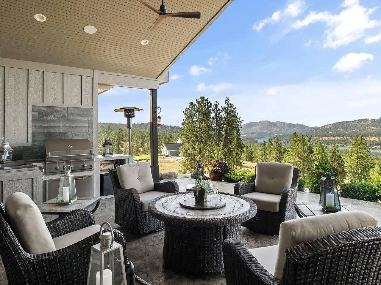 There is so much to love about this stunning property with sweeping views of Lake Spokane & Mt. Spokane. This home features the BEST of everything with 4-bedrooms and 5 bathrooms. Enjoy 1-level living in this thoughtfully designed home with the primary suite and two additional en-suite bedrooms on the main floor, plus a stylish half bath for guests. Upstairs you'll find a spacious 416 sq ft retreat with its own half bath, perfect for a home office, art space, or guest suite. Featuring engineered wood floors, 8-foot knotty alder doors, 10 ft vaulted ceilings, hard surface counters throughout and high-end appliances including a Frigidaire Professional Series refrigerator/freezer, GE Monogram induction cooktop, convection oven/microwave & warming drawer. The chef's kitchen moves outdoors with a 36' built-in DCS barbecue grill, 2-burner gas cooktop & a large covered patio with stamped concrete. An oversized 2-car attached garage is complemented by a massive 40x60 shop w/ a 14-ft center door w/ space for a 35' RV.
