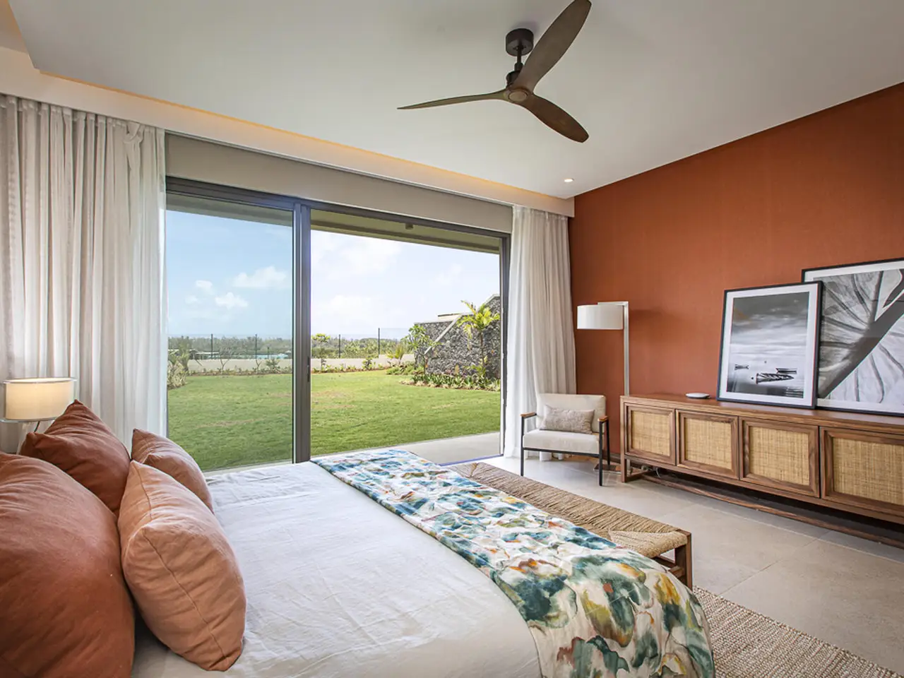 Perched gracefully on a generous 2,079 m² down-slope plot in the coveted Rive Est neighborhood of Anahita, this newly built 445 m² villa is a statement of refined island living. Nestled among the northern parcels and just moments from the lush tropical gardens of Rive Est Park, with its private pontoon offering effortless passage to the turquoise lagoon, the property embodies the very essence of exclusivity and sophistication. Every element of its architecture embraces the land’s natural contours, allowing each space to frame mesmerising vistas of the shimmering lagoon and the legendary Île aux Cerfs. On the upper level, sunlight dances across a bright, open living and dining area, where an elegant kitchen flows onto a wide terrace. Here, an infinity pool appears to melt into the horizon, while a barbecue and bar set the stage for effortless soirées. A stylish TV lounge with integrated office space and a generously proportioned en-suite bedroom complete this refined space. Descending to the garden level, three serene en-suite bedrooms open directly onto manicured tropical grounds, where the scent of frangipani drifts in the air. Discreet storage solutions ensure both practicality and elegance remain in perfect harmony. Infused with the charm of chic tropical décor and finished to the highest standards, this villa is more than a home—it is a gateway to Anahita’s celebrated coastal lifestyle, where each day is bathed in light, framed by sea, and defined by pure tranquility.
