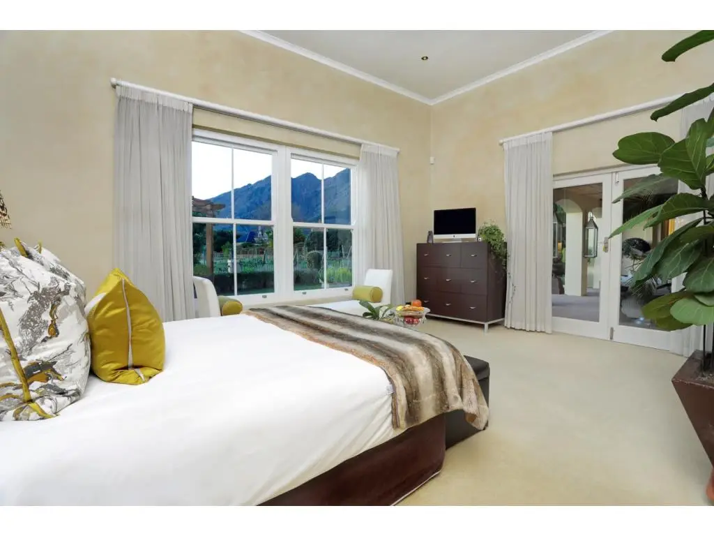 Nestled in the heart of Franschhoek Valley's picturesque Domaine Des Anges estate, this exceptional home offers a sophisticated lifestyle for discerning families. The secure estate boasts a clubhouse (available for private rentals), a tranquil pool, a fitness centre, and floodlit tennis court. The property's unique placement near vineyards creates a romantic, almost private vineyard ambiance. Serene ponds attract abundant birdlife, fostering a peaceful atmosphere. Conveniently located within walking distance of Franschhoek village, residents enjoy easy access to acclaimed restaurants, boutiques, wineries, and cultural attractions. This contemporary residence features three spacious bedrooms, each with their own luxurious en suite bathroom, as well as a well appointed guest powder room for guests.. A versatile wine cellar could easily serve as a quiet home office. The home's design flows seamlessly from the entrance hall to a cozy living area with fireplace, opening onto a covered terrace and meticulously landscaped garden. A central koi pond and water feature grace the patio, while a private hot tub spa is tucked away in a secluded garden corner. A charming conservatory, complete with seating, offers a delightful spot for outdoor dining. The double volume dining and kitchen area, located on the home's right wing, features a stunning chandelier. A double garage and guest parking are provided. The property also includes a 5kW battery and inverter system, with solar panel installation potential. Every detail reflects meticulous craftsmanship, creating a space that is both beautiful and functional. Breathtaking panoramic mountain views, visible from the master bedroom deck and lower garden, are a truly exceptional feature. These vistas, combined with the nearby vineyards, create a daily spectacle of natural beauty.