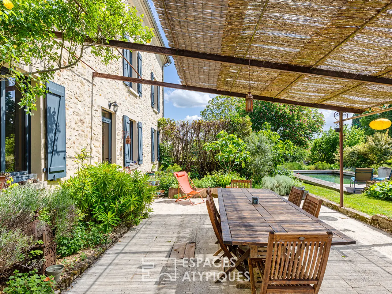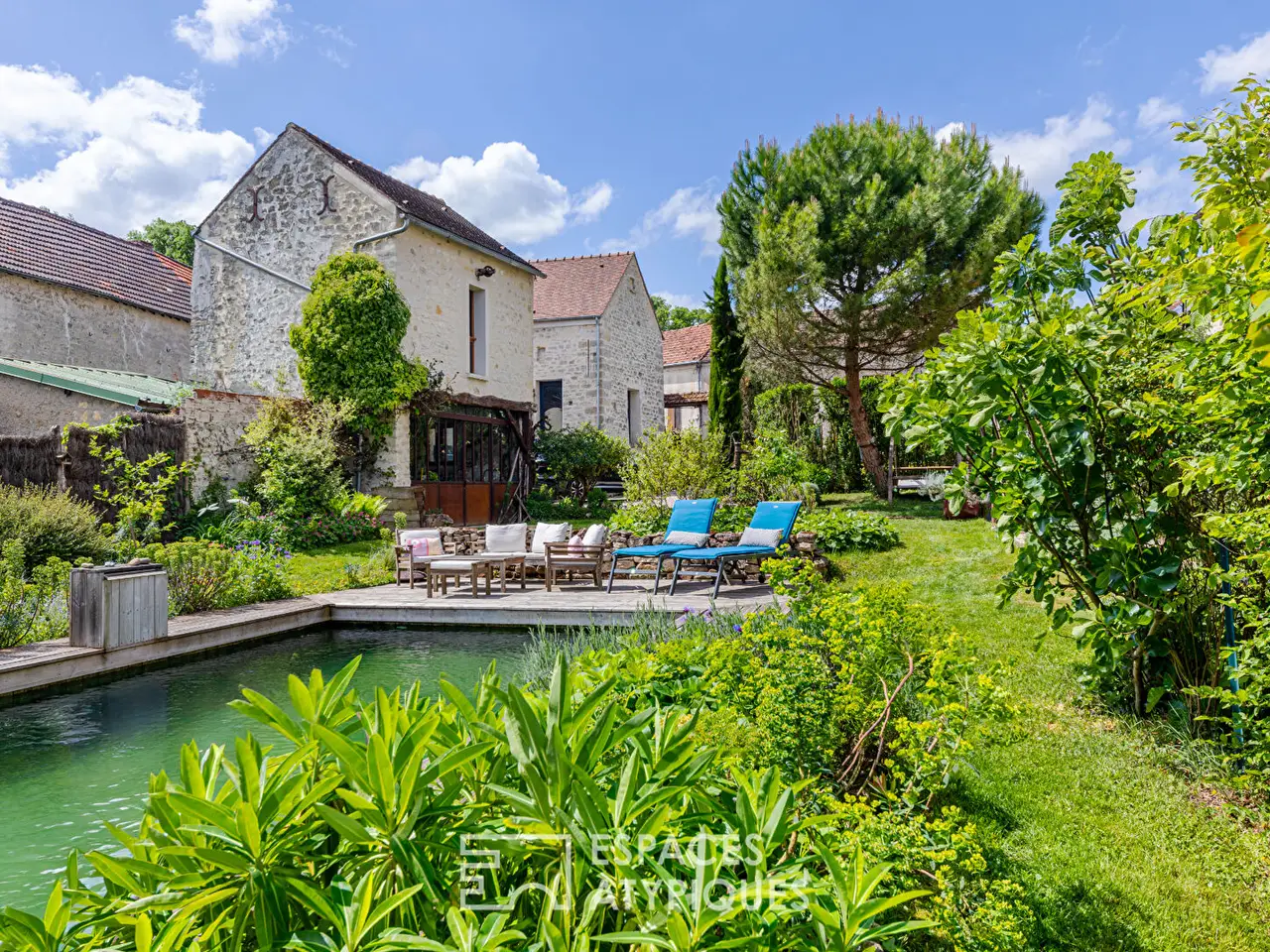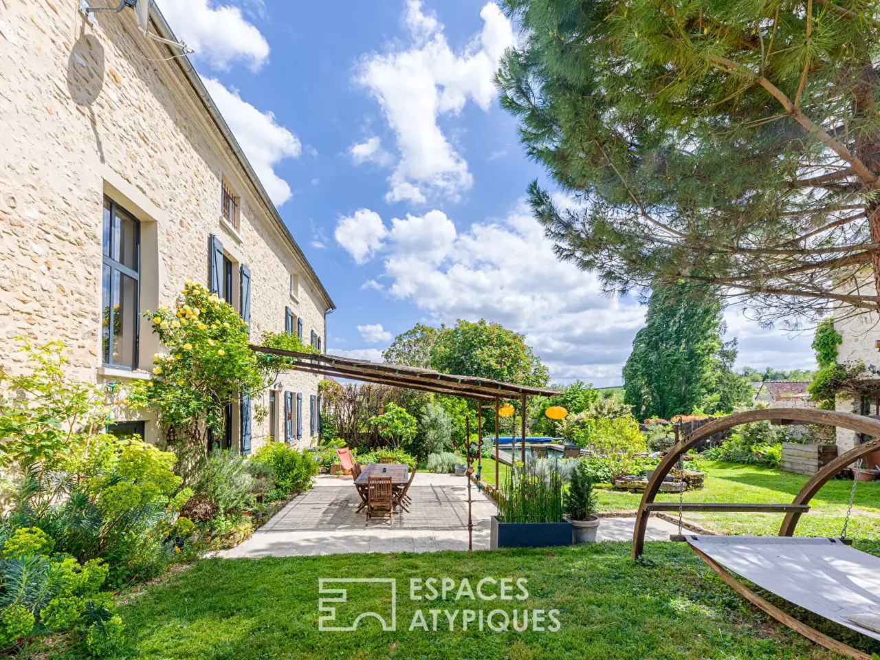 Just 45 minutes from Paris, in the heart of the French Vexin Regional Natural Park, this authentic 276 sqm stone house (427 sqm floor area) welcomes you in a green setting with an intact soul. Located in the charming village of Oinville-sur-Montcient, this rare property is set back from the street, protected by a beautiful old gate.From the entrance, the tone is set: the gaze embraces a vast landscaped garden of more than 1,000 sqm, punctuated by large trees, stone walls, and local species. A rural and soothing atmosphere, where time seems to stand still. Natural springs, nestled in the garden and one of the barns, bring precious freshness and unexpected poetry to the landscape.A swimming pool with simple lines completes this exceptional picture: perfectly integrated into the environment, it offers a relaxation space in total harmony with the surrounding nature.In front of the main house, two stone barns await reinvention. One could accommodate an artist's studio or a reception area, the other would readily lend itself to a guest house, a gite or a place of well-being thanks to the spring. The potential is immense and the volumes, striking.Between nature and character, this property seduces with its authenticity, its absolute calm, and the inspiration it arouses with each step.The ground floor is organized around a vast living room area, characterized by a majestic period fireplace and an exposed brick ceiling that gives a warm loft spirit that opens onto a spectacular veranda of nearly 30 sqm, with a metal frame and glass roof along its entire length. A warm kitchen in natural wood, a turquoise green wall and a convivial dining area with a view of the 'priest's' garden at the back create a perfect picture for living in harmony with light and nature.A few steps lead to the office with a cabinet of curiosities spirit, between classic elegance and woody warmth. A cozy atmosphere conducive to concentration and reverie. This space evokes the old libraries and study rooms of bourgeois homes of yesteryear.In the center, an antique solid wood desk sits majestically. In the background, a sculpted marble fireplace with a trumeau and mirror adds an extra touch of nobility. Glass-fronted oak bookcases run along the walls, filled with antique books, works of art, and curiosities. A spiral staircase in varnished wood completes this unique setting.Upstairs, a relaxation area with a billiard table adorns the walls in aubergine hues and showcases vintage posters, collectibles, and beautiful light. It showcases a taste for detail and a distinct aesthetic.The visual and emotional heart of the house, the cathedral-height second living room impresses with its spectacular volume and decidedly warm atmosphere. Upon entering this room, one is struck by the double height ceiling, highlighted by elegant exposed beams in old wood which naturally punctuate the space.A central black cast iron wood stove sits at the foot of a vertical flue crossing the entire height, bringing warmth and verticality to this open space. The lower layout allows for fluid circulation to the other living rooms, the veranda or even the mezzanine.The house offers five ideally distributed bedrooms. On the top floor, located under a beautiful old frame, the master suite reveals more than 30 sqm with a shower room open to the bedroom as well as a large office of almost 20 sqm. On the 1st floor, a sleeping area leads to three bedrooms with bathroom and on the ground floor, a guest area with bedroom and private shower room and WC.On the outbuildings side, wine lovers will be delighted by an exceptional vaulted cellar, dug into the rock, which preciously preserves several hundred bottles in a raw and mineral setting. In its extension, a laundry room and cellar complete this rare property resolutely focused on the art of living!Outside, several parking spaces, an independent vaulted