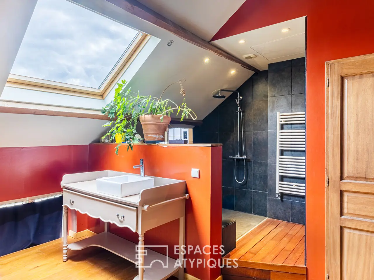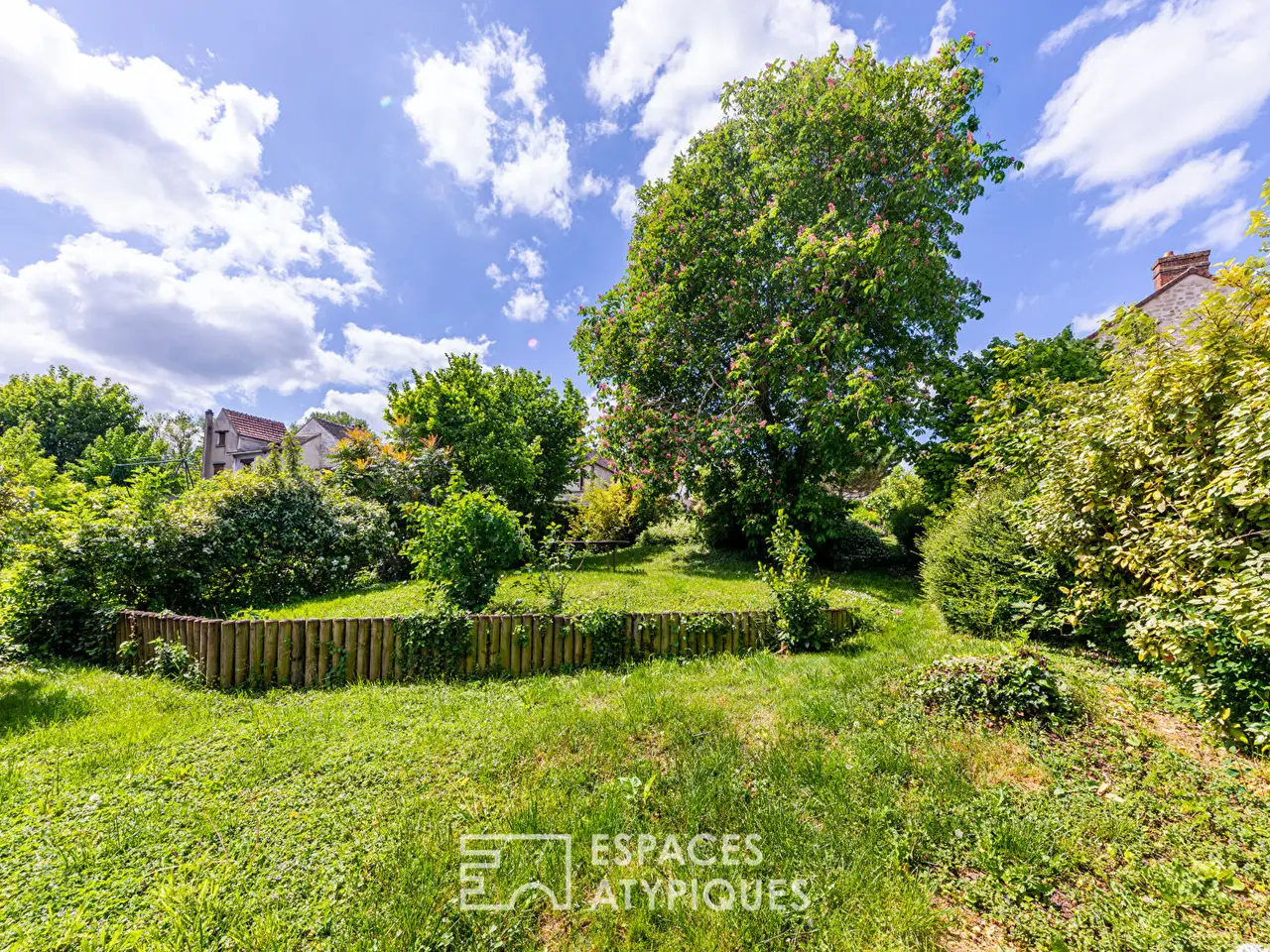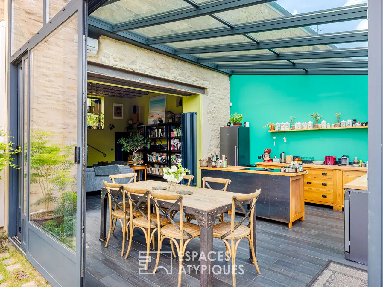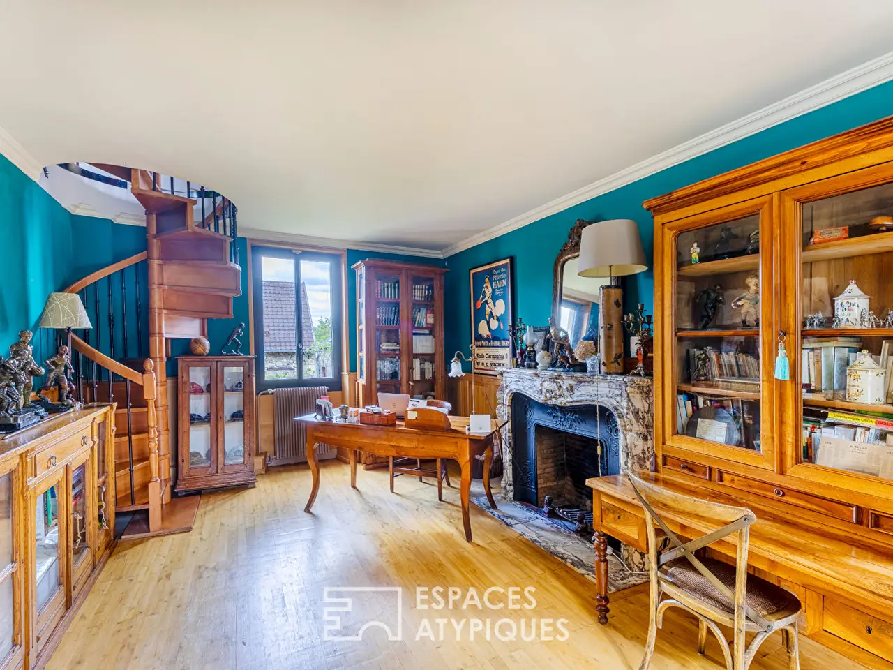 Just 45 minutes from Paris, in the heart of the French Vexin Regional Natural Park, this authentic 276 sqm stone house (427 sqm floor area) welcomes you in a green setting with an intact soul. Located in the charming village of Oinville-sur-Montcient, this rare property is set back from the street, protected by a beautiful old gate.From the entrance, the tone is set: the gaze embraces a vast landscaped garden of more than 1,000 sqm, punctuated by large trees, stone walls, and local species. A rural and soothing atmosphere, where time seems to stand still. Natural springs, nestled in the garden and one of the barns, bring precious freshness and unexpected poetry to the landscape.A swimming pool with simple lines completes this exceptional picture: perfectly integrated into the environment, it offers a relaxation space in total harmony with the surrounding nature.In front of the main house, two stone barns await reinvention. One could accommodate an artist's studio or a reception area, the other would readily lend itself to a guest house, a gite or a place of well-being thanks to the spring. The potential is immense and the volumes, striking.Between nature and character, this property seduces with its authenticity, its absolute calm, and the inspiration it arouses with each step.The ground floor is organized around a vast living room area, characterized by a majestic period fireplace and an exposed brick ceiling that gives a warm loft spirit that opens onto a spectacular veranda of nearly 30 sqm, with a metal frame and glass roof along its entire length. A warm kitchen in natural wood, a turquoise green wall and a convivial dining area with a view of the 'priest's' garden at the back create a perfect picture for living in harmony with light and nature.A few steps lead to the office with a cabinet of curiosities spirit, between classic elegance and woody warmth. A cozy atmosphere conducive to concentration and reverie. This space evokes the old libraries and study rooms of bourgeois homes of yesteryear.In the center, an antique solid wood desk sits majestically. In the background, a sculpted marble fireplace with a trumeau and mirror adds an extra touch of nobility. Glass-fronted oak bookcases run along the walls, filled with antique books, works of art, and curiosities. A spiral staircase in varnished wood completes this unique setting.Upstairs, a relaxation area with a billiard table adorns the walls in aubergine hues and showcases vintage posters, collectibles, and beautiful light. It showcases a taste for detail and a distinct aesthetic.The visual and emotional heart of the house, the cathedral-height second living room impresses with its spectacular volume and decidedly warm atmosphere. Upon entering this room, one is struck by the double height ceiling, highlighted by elegant exposed beams in old wood which naturally punctuate the space.A central black cast iron wood stove sits at the foot of a vertical flue crossing the entire height, bringing warmth and verticality to this open space. The lower layout allows for fluid circulation to the other living rooms, the veranda or even the mezzanine.The house offers five ideally distributed bedrooms. On the top floor, located under a beautiful old frame, the master suite reveals more than 30 sqm with a shower room open to the bedroom as well as a large office of almost 20 sqm. On the 1st floor, a sleeping area leads to three bedrooms with bathroom and on the ground floor, a guest area with bedroom and private shower room and WC.On the outbuildings side, wine lovers will be delighted by an exceptional vaulted cellar, dug into the rock, which preciously preserves several hundred bottles in a raw and mineral setting. In its extension, a laundry room and cellar complete this rare property resolutely focused on the art of living!Outside, several parking spaces, an independent vaulted