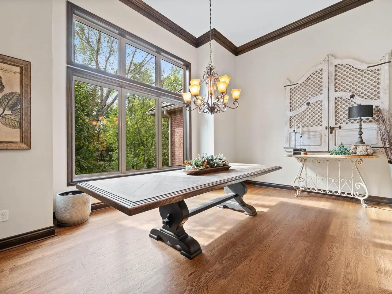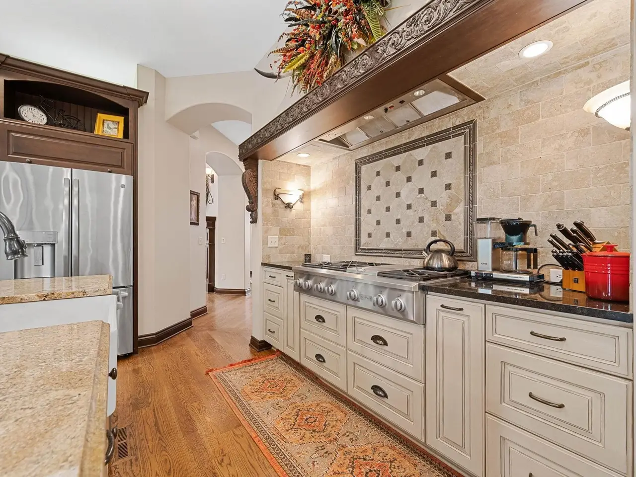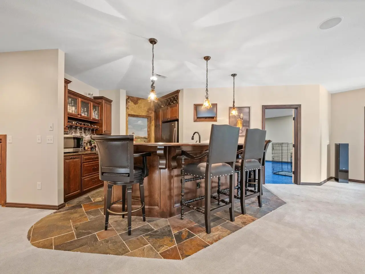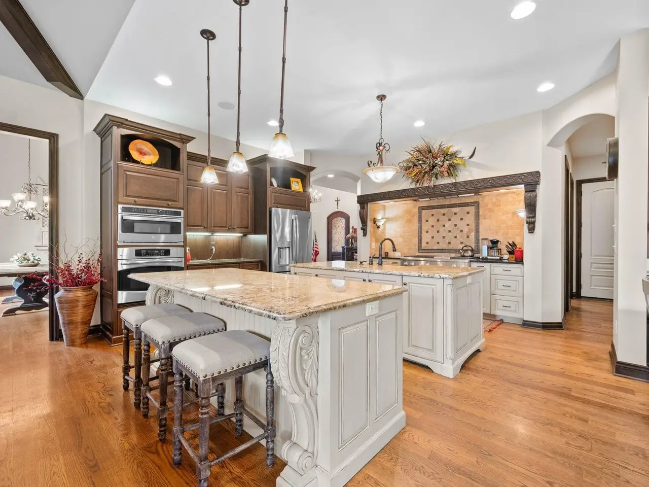 Welcome Home to 8219 W. Meadow Park, located in the sought-after gated Fossil Rim Estates neighborhood of west Wichita. This full brick and stone residence combines craftsmanship, comfort, and natural beauty on nearly one acre backing to mature trees. Designed for everyday living and memorable entertaining, the home offers 6 bedrooms, 4.5 baths, and approximately 6,082 sq ft of finely finished space. Step inside to find architectural detail at every turnarched entries, custom millwork, crown moulding, and gleaming hardwood floors. The open main level showcases a formal living and dining area with built-ins, gas fireplace, and tall windows that frame peaceful tree views. The adjoining hearth room features a stone fireplace with beam accents, creating a warm gathering space connected to the gourmet kitchen. Well-appointed for cooks and hosts alike, the kitchen includes granite countertops, double ovens, gas cooktop, stainless appliances, two large islands, and a walk-in pantry with prep sink. A main-floor office provides an ideal workspace, while the laundry room offers built-in cabinetry, sink, and drop-zone bench. The spacious primary suite is a private retreat with a coved, lighted ceiling and a wall of windows overlooking the wooded yard. The spa-style bath offers dual vanities, jetted tub, custom tile shower, and an impressive walk-in closet with built-ins. Two additional bedrooms and a full bath complete the main level. The finished walk-out basement extends the living space with a large family room centered around a stone fireplace, full wet bar with granite counters and slate flooring, billiards area, exercise room, two bedrooms, concrete safe room, and abundant storage. Natural light and patio access make the lower level ideal for entertaining or relaxation. Outdoor living shines here with a covered composite deck featuring a stone fireplace, perfect for year-round enjoyment, and a lower brick patio surrounded by landscaped beds. The expansive yard includes fencing, fire pit, and a private well and sprinkler system. The side-load three-car garage offers epoxy flooring and extra workspace. A concrete tile roof and full masonry exterior provide exceptional durability and timeless curb appeal. Located in Maize School District 266, within minutes of Sedgwick County Park, NewMarket Square shopping and dining, Ridge Road corridor amenities, and the Northwest YMCA, this property delivers the perfect balance of privacy and convenience. Experience refined living in Fossil Rim Estateswhere design, setting, and quality craftsmanship come together in one remarkable west-side Wichita address.