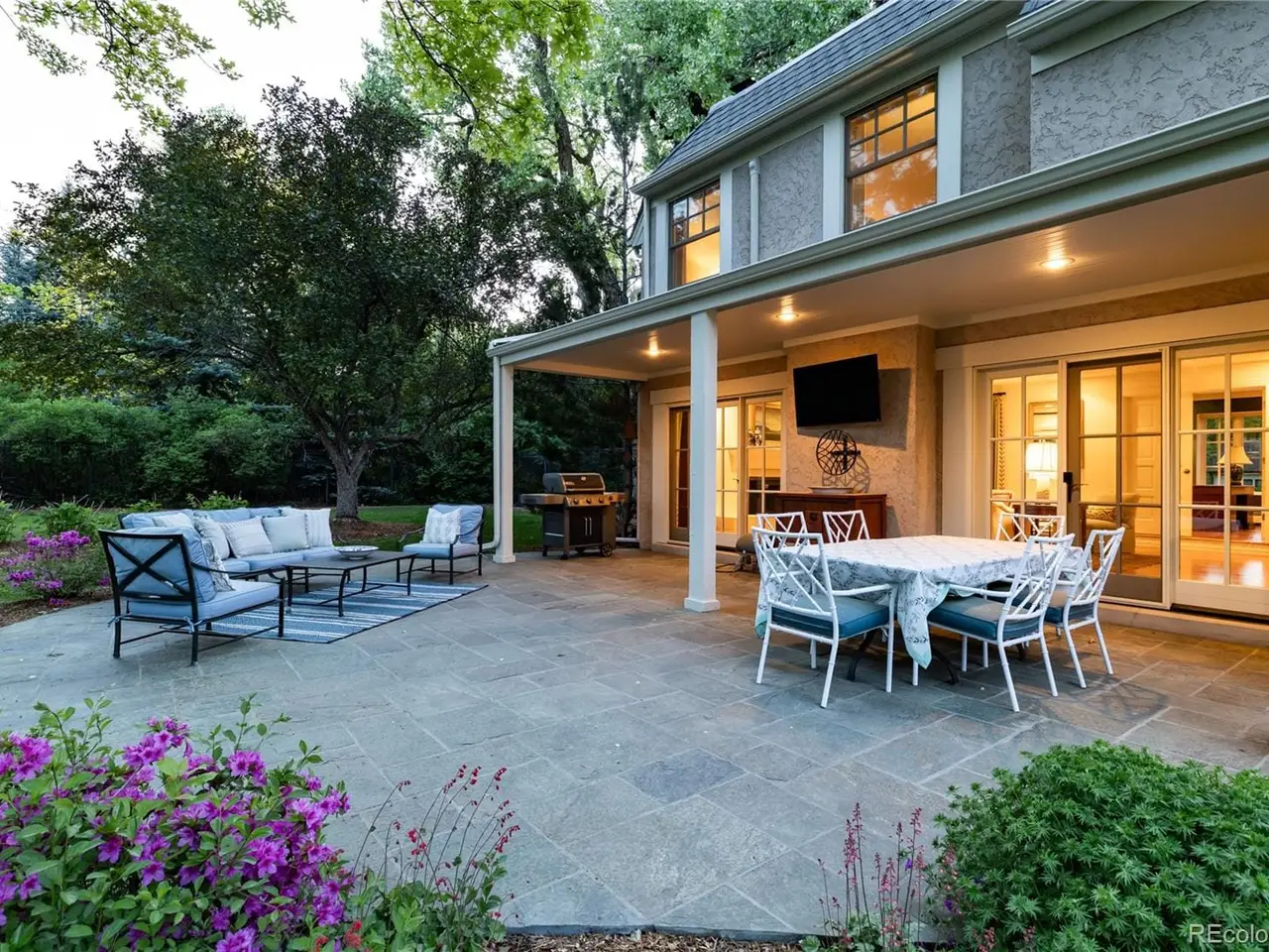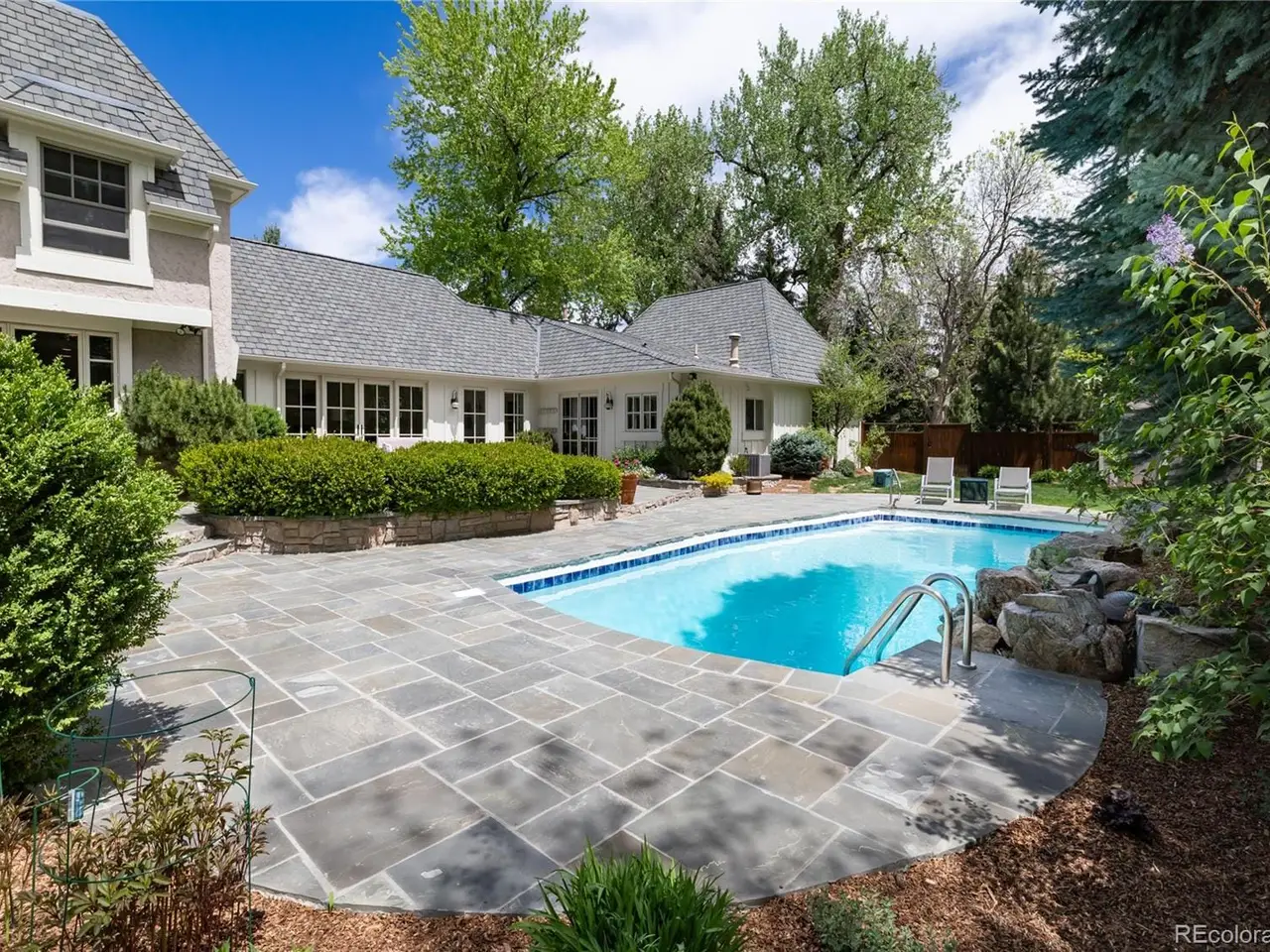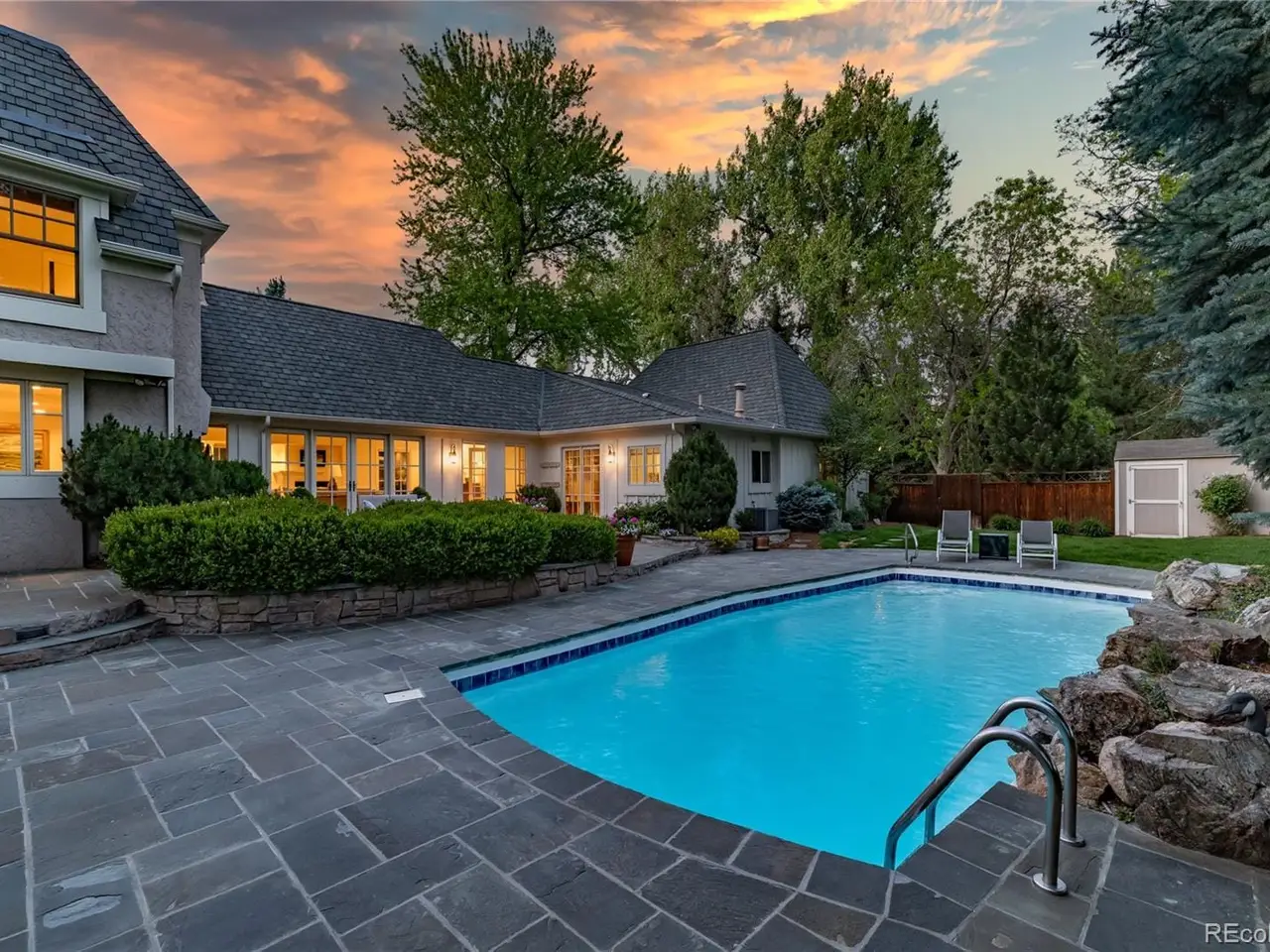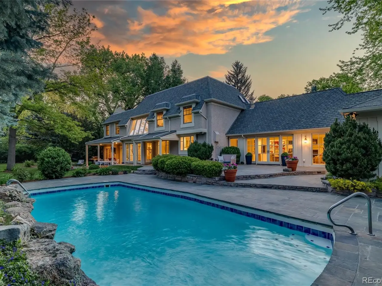 Located on an expansive, verdant one-acre lot, this sophisticated residence offers complete privacy on exclusive Cottonwood Lane. A thoughtful layout enables easy entertaining and great family space. The interior is illuminated by natural light and features hardwood floors, beamed ceilings, plus numerous windows and French doors throughout. A handsome study is found through custom French doors just off the entry foyer, including floor-to-ceiling bookshelves. The spacious country kitchen is equipped with stainless steel Viking and Sub-Zero appliances, catering to culinary enthusiasts. The kitchen opens to a large breakfast room, walk-in pantry, and expansive living room boasting a beautiful fireplace and built-ins. The opposite side of the kitchen adjoins a huge, beamed family room with fireplace, built-in bench and bookshelves. This central area of the home accommodates both casual and formal gatherings seamlessly. Both main living areas feature French doors leading outside to a covered stone patio, providing a tranquil view of the sparkling pool, meticulously maintained lawn and beautifully landscaped gardens. The main floor is completed by a large laundry/mud room, three-quarter bath with easy access to the pool area, and 3-car attached garage. The upper level comprises a private primary suite with luxurious five-piece bath and large walk-in closet, along with an en suite bedroom with three-quarter bath, plus two bedrooms, a three-quarter bath and loft area. Retreat to the lower level with rec room, bedroom, three-quarter bath and storage/mechanical room. This property is the perfect mix of modern comfort and traditional elegance, situated on the High Line Canal and within the Cherry Creek School District, offering a prime location for exceptional Colorado living.