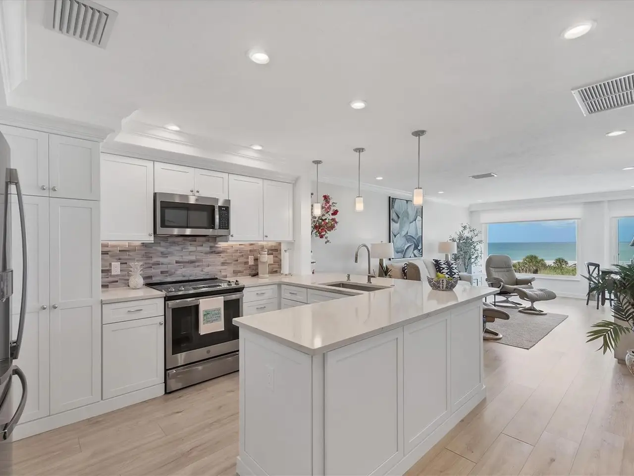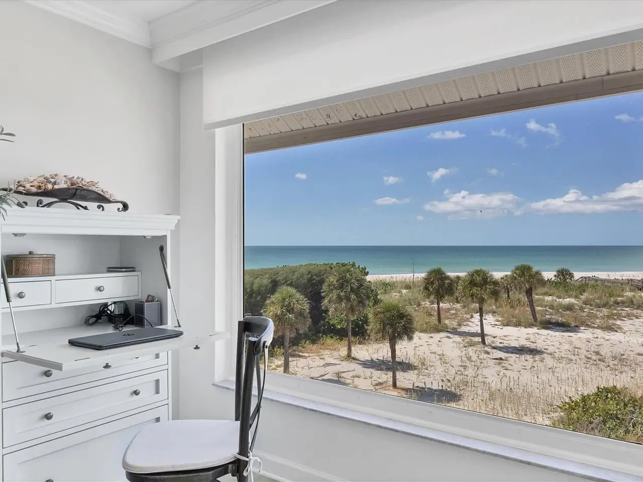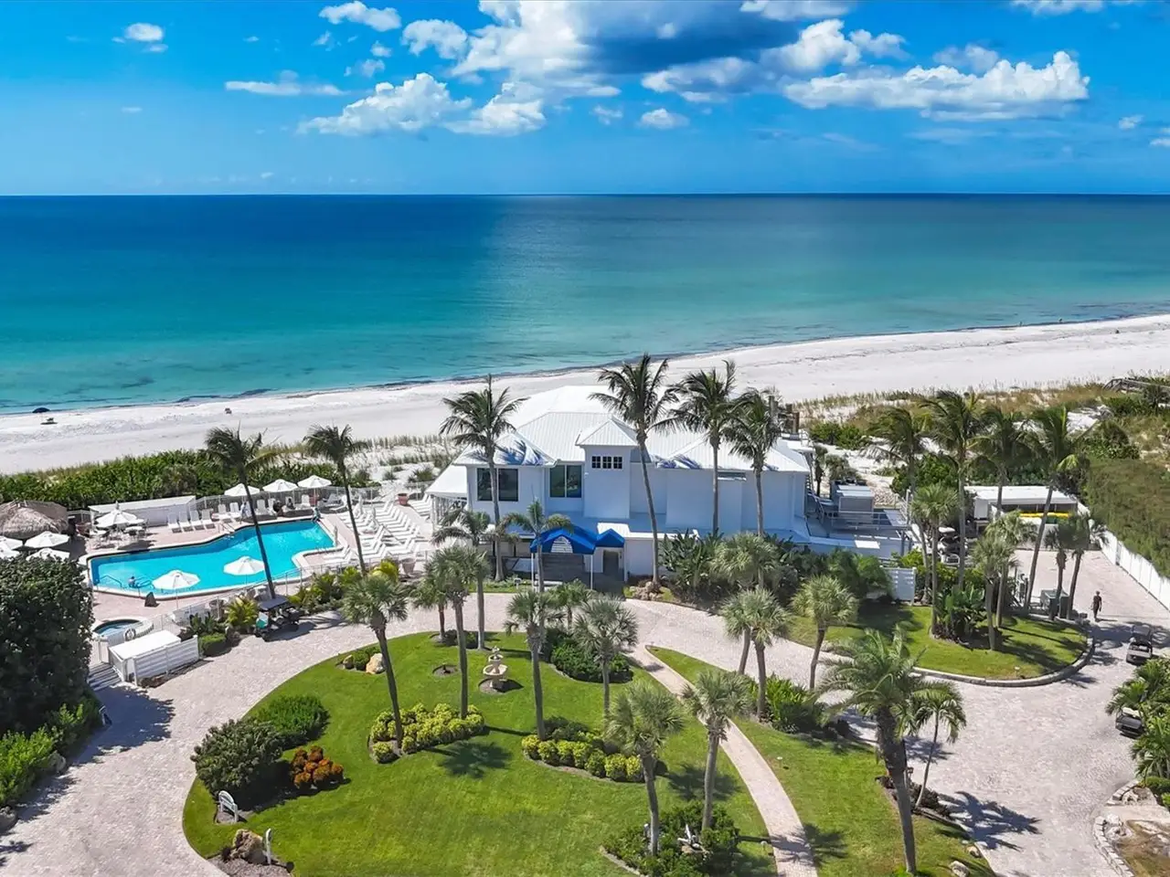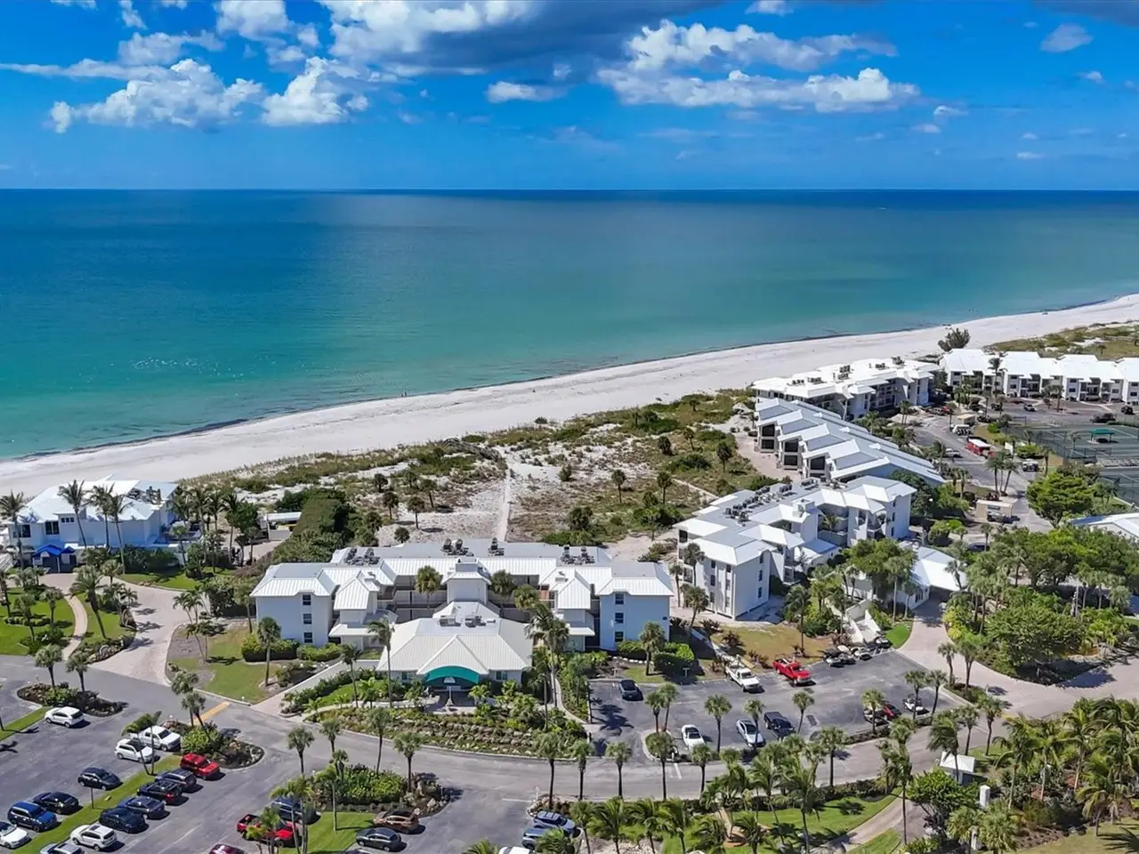 Experience unparalleled coastal living in this stunning top-floor condo with sweeping Gulf views and convenient elevator access. The fully renovated kitchen boasts a breakfast bar, custom soft-close cabinetry, white quartz countertops, and stainless steel appliances. The Gulf-front bedroom includes a walk-in closet with a custom organization system, while the primary bath offers double sinks and expansive countertop space. Additional upgrades include wide-plank luxury vinyl flooring, motorized Somfy shades, impact-resistant windows/doors, crown molding, and a full-size washer/dryer. Enjoy beachfront resort-style amenities: a renovated Gulf-front restaurant, tiki bar, three pools, eight Har-Tru tennis courts, pro shop, and fitness center. Fully furnished and ready to enjoy, this residence is a rare Boca Grande retreat.