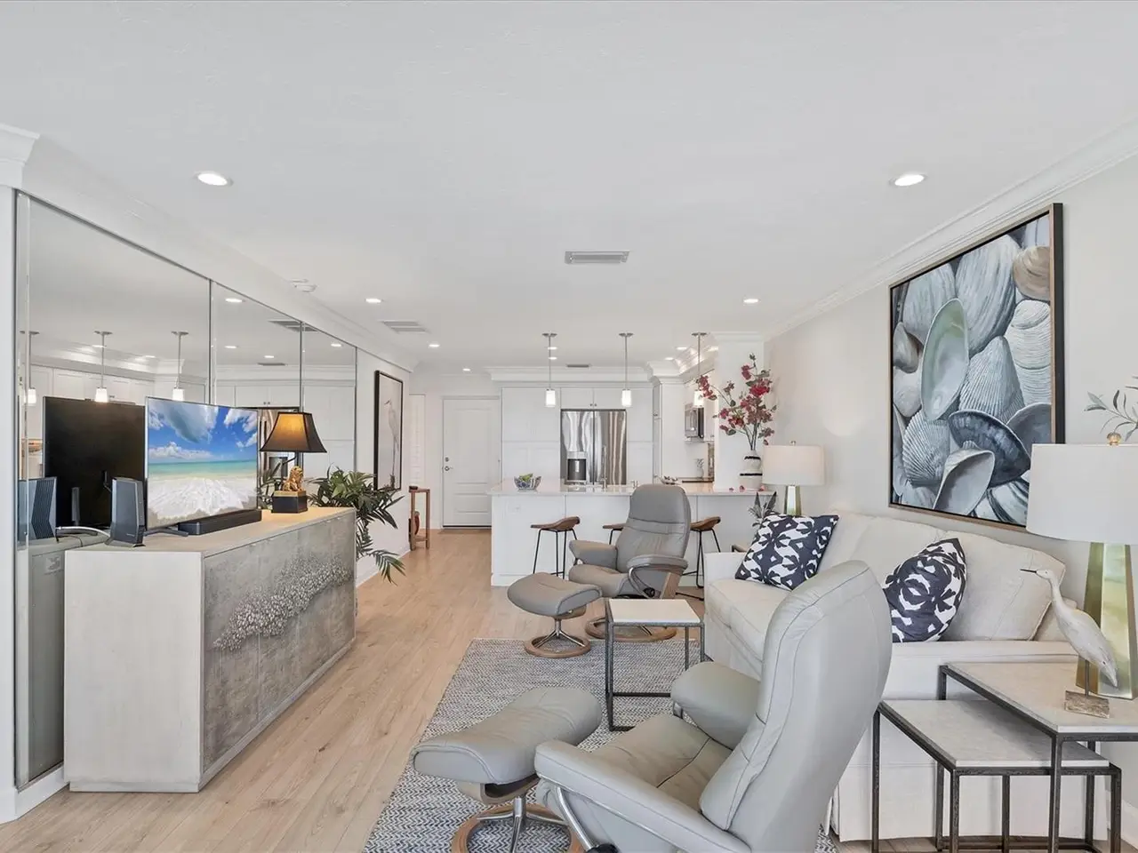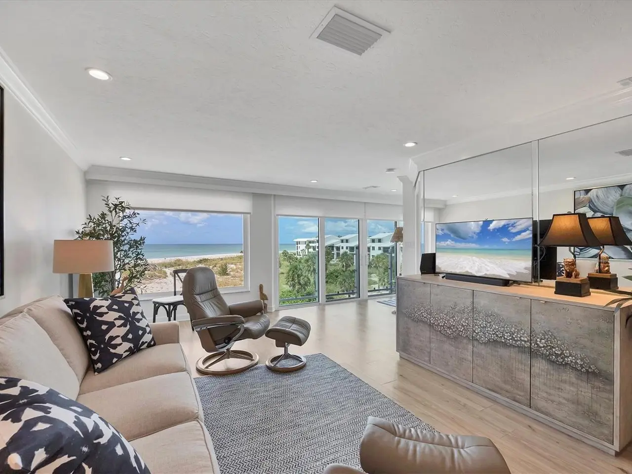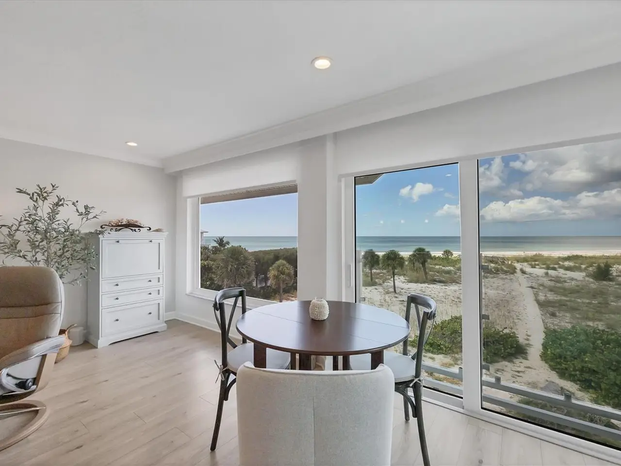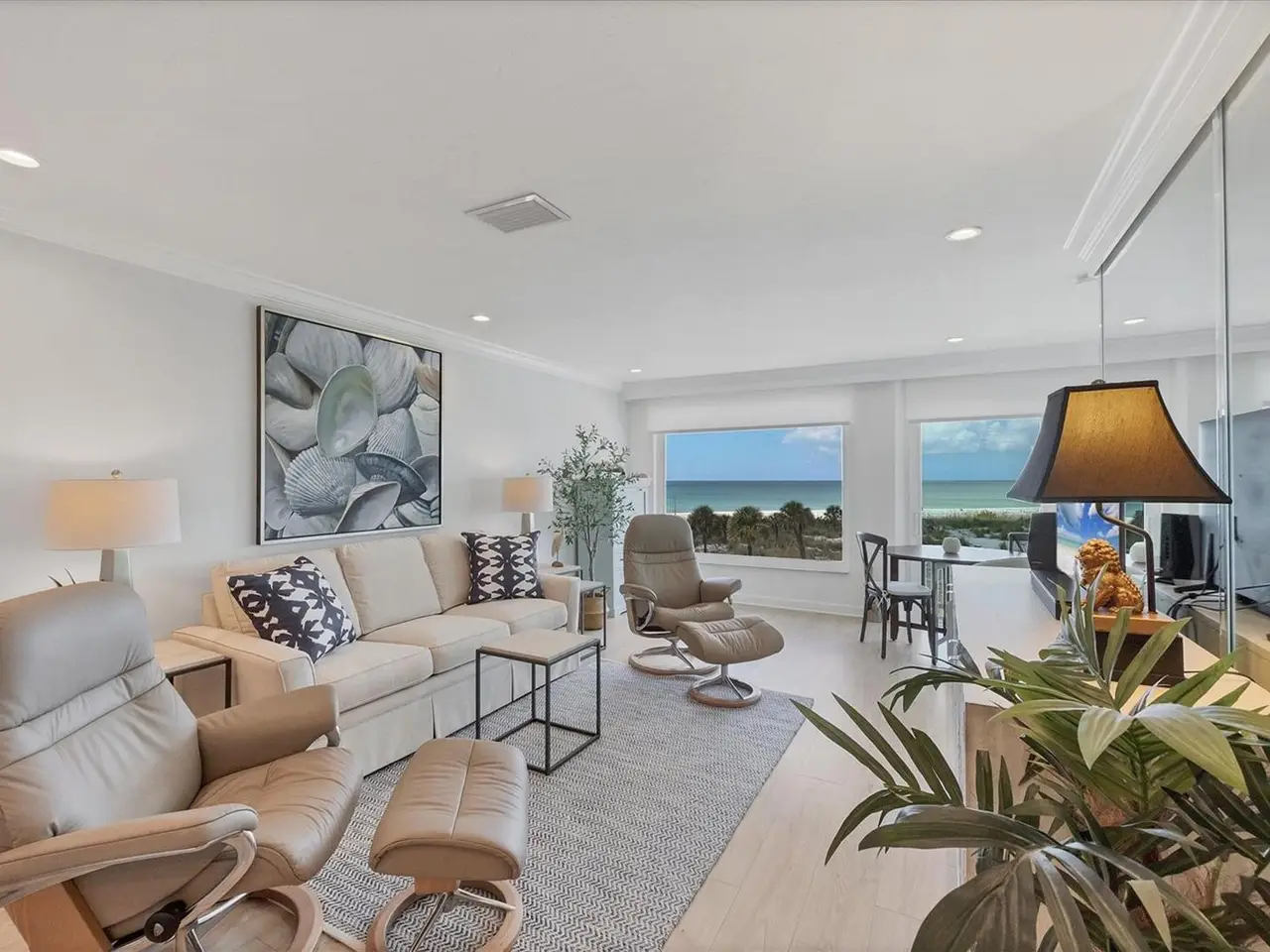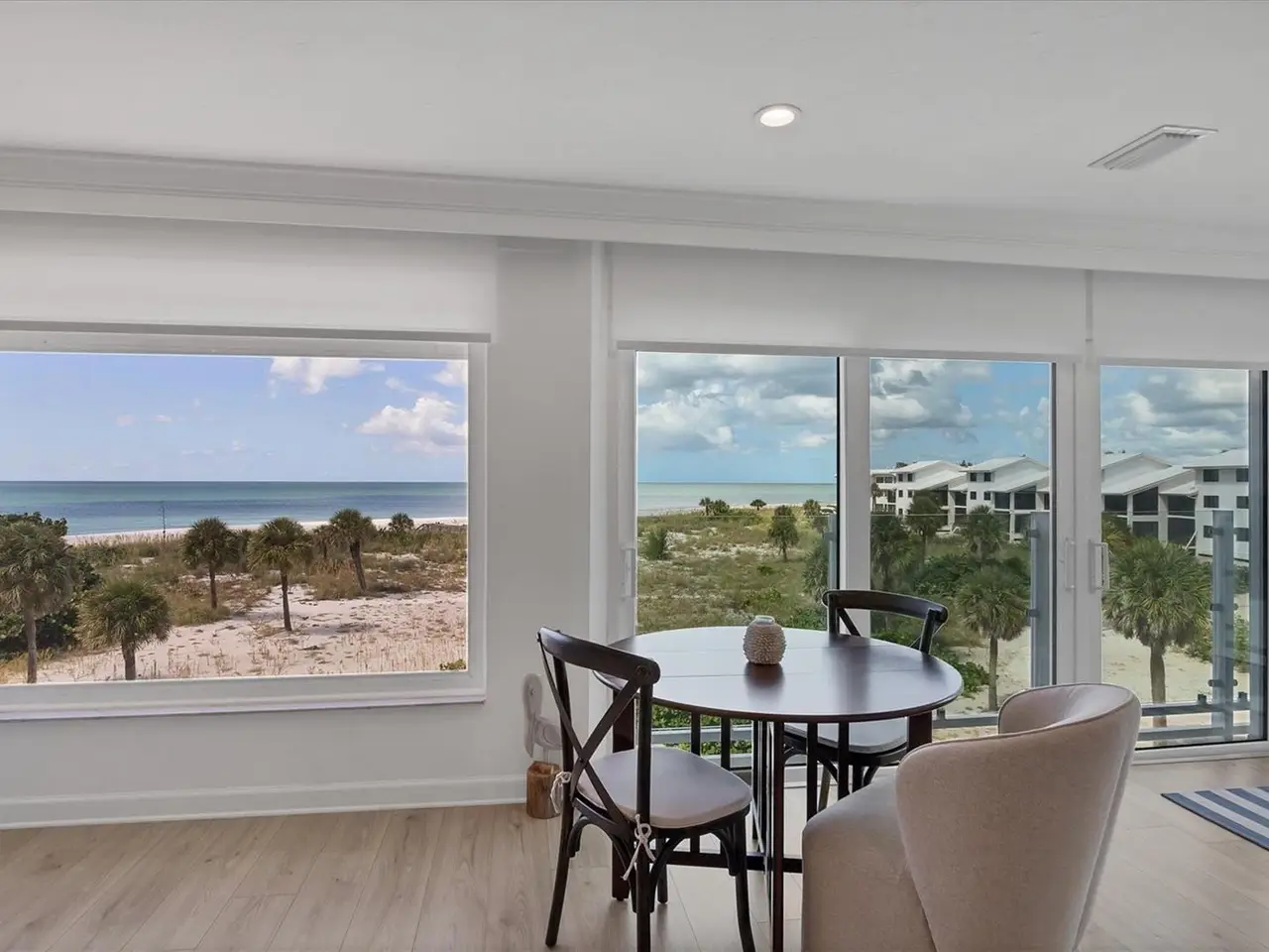 Experience unparalleled coastal living in this stunning top-floor condo with sweeping Gulf views and convenient elevator access. The fully renovated kitchen boasts a breakfast bar, custom soft-close cabinetry, white quartz countertops, and stainless steel appliances. The Gulf-front bedroom includes a walk-in closet with a custom organization system, while the primary bath offers double sinks and expansive countertop space. Additional upgrades include wide-plank luxury vinyl flooring, motorized Somfy shades, impact-resistant windows/doors, crown molding, and a full-size washer/dryer. Enjoy beachfront resort-style amenities: a renovated Gulf-front restaurant, tiki bar, three pools, eight Har-Tru tennis courts, pro shop, and fitness center. Fully furnished and ready to enjoy, this residence is a rare Boca Grande retreat.