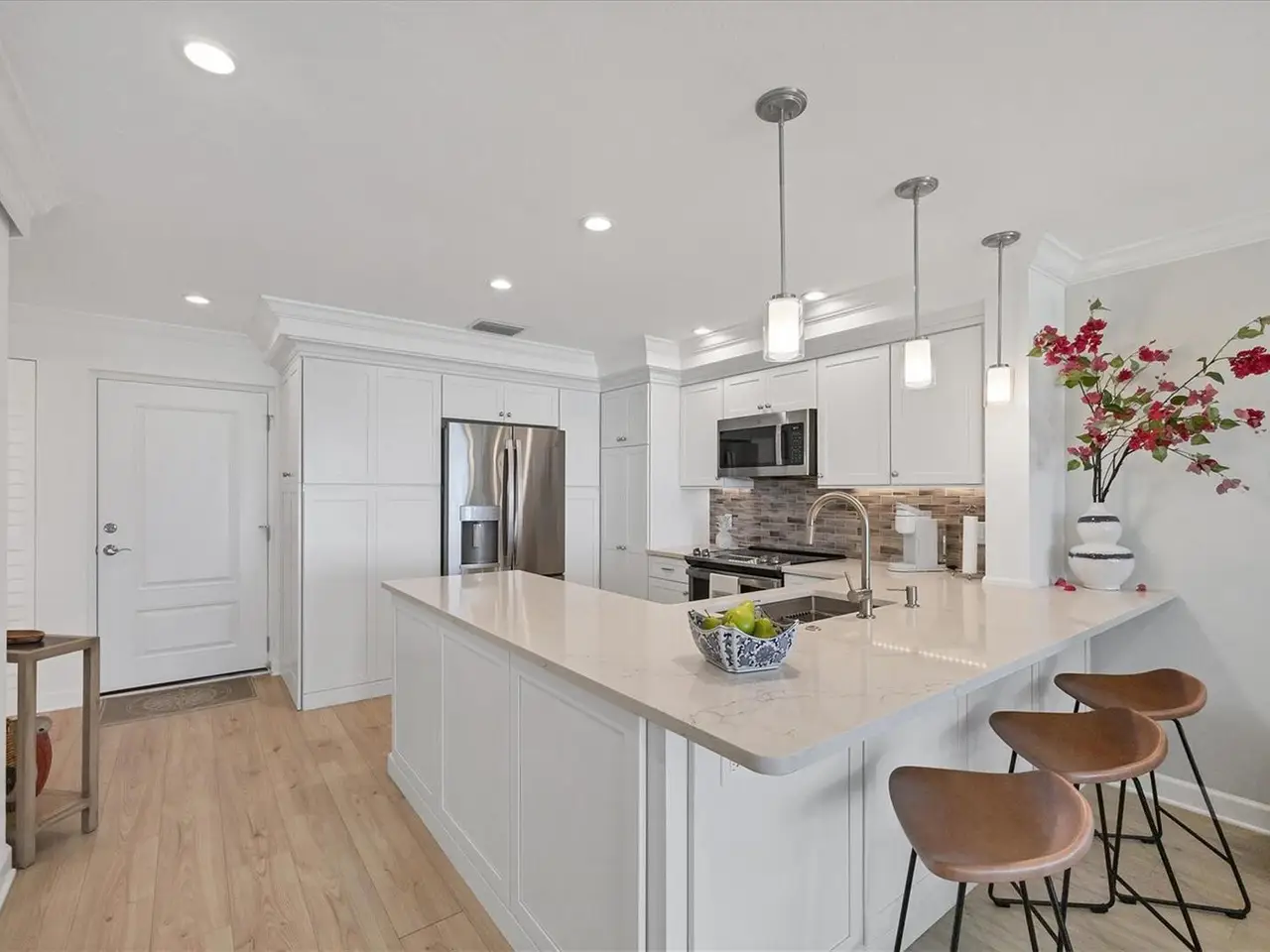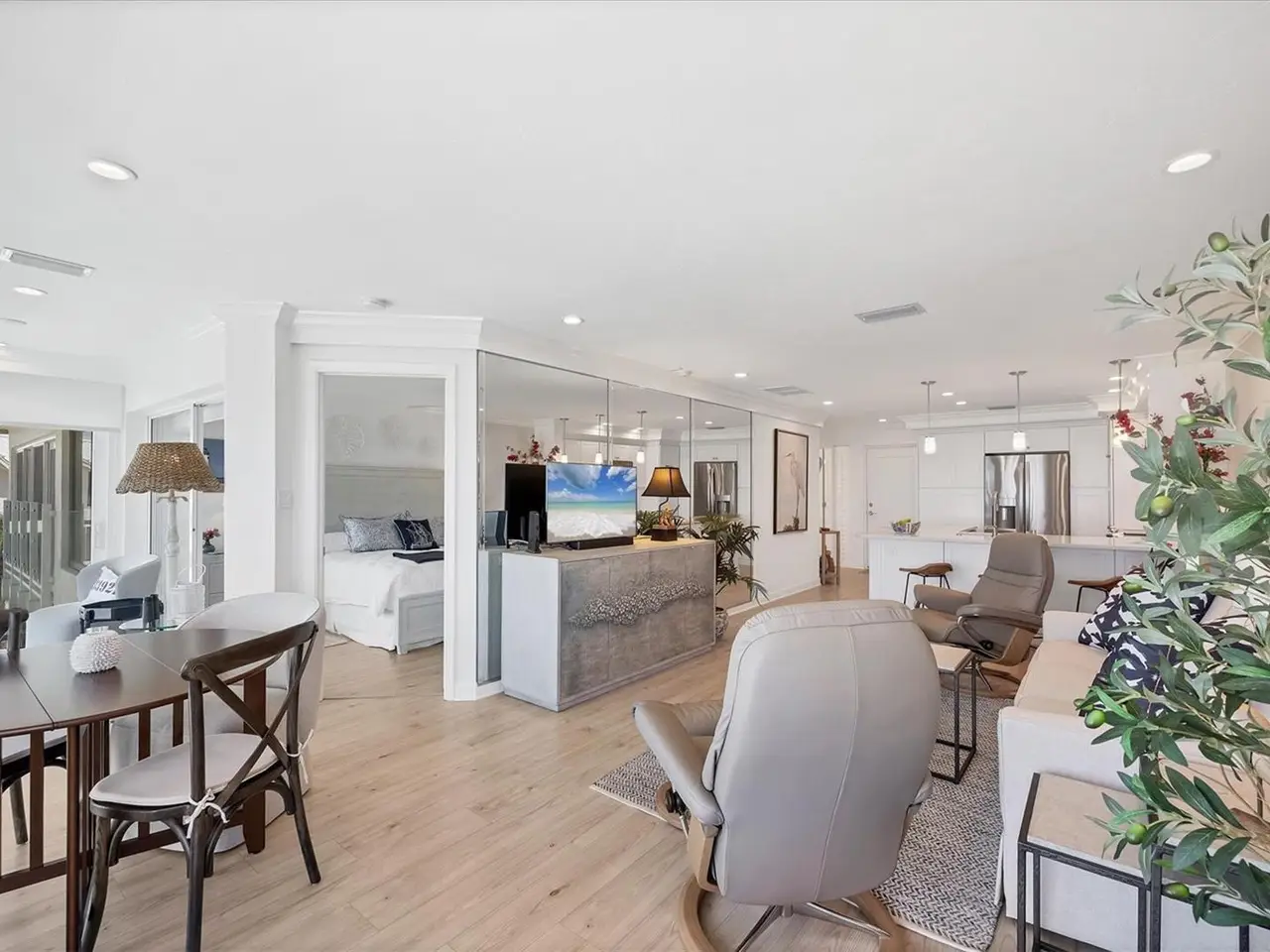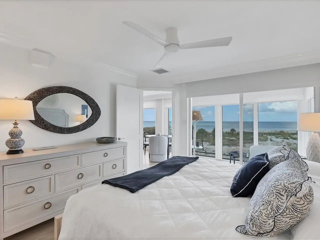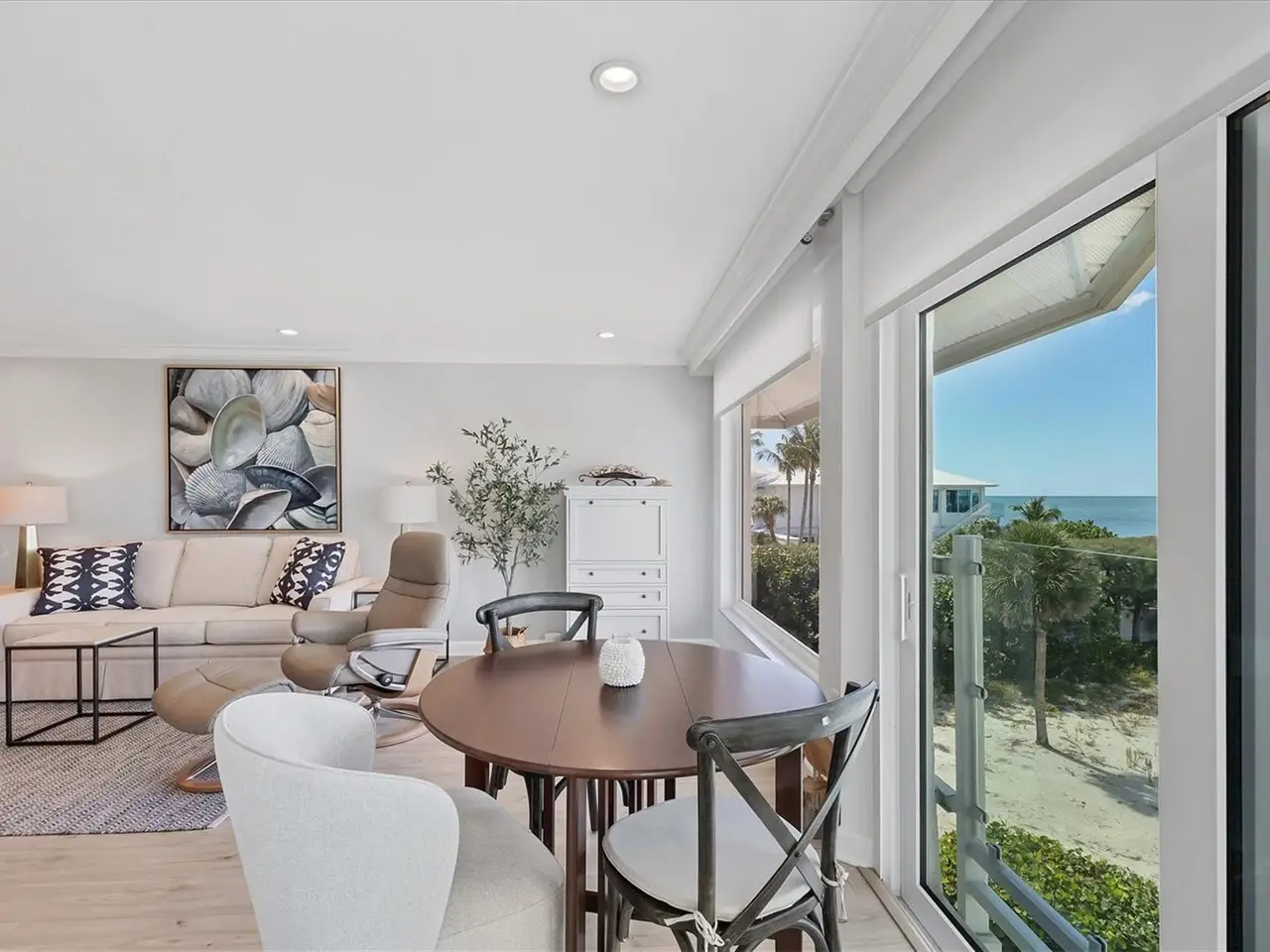 Experience unparalleled coastal living in this stunning top-floor condo with sweeping Gulf views and convenient elevator access. The fully renovated kitchen boasts a breakfast bar, custom soft-close cabinetry, white quartz countertops, and stainless steel appliances. The Gulf-front bedroom includes a walk-in closet with a custom organization system, while the primary bath offers double sinks and expansive countertop space. Additional upgrades include wide-plank luxury vinyl flooring, motorized Somfy shades, impact-resistant windows/doors, crown molding, and a full-size washer/dryer. Enjoy beachfront resort-style amenities: a renovated Gulf-front restaurant, tiki bar, three pools, eight Har-Tru tennis courts, pro shop, and fitness center. Fully furnished and ready to enjoy, this residence is a rare Boca Grande retreat.