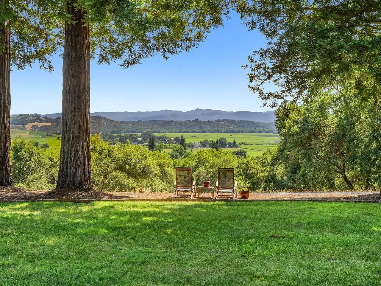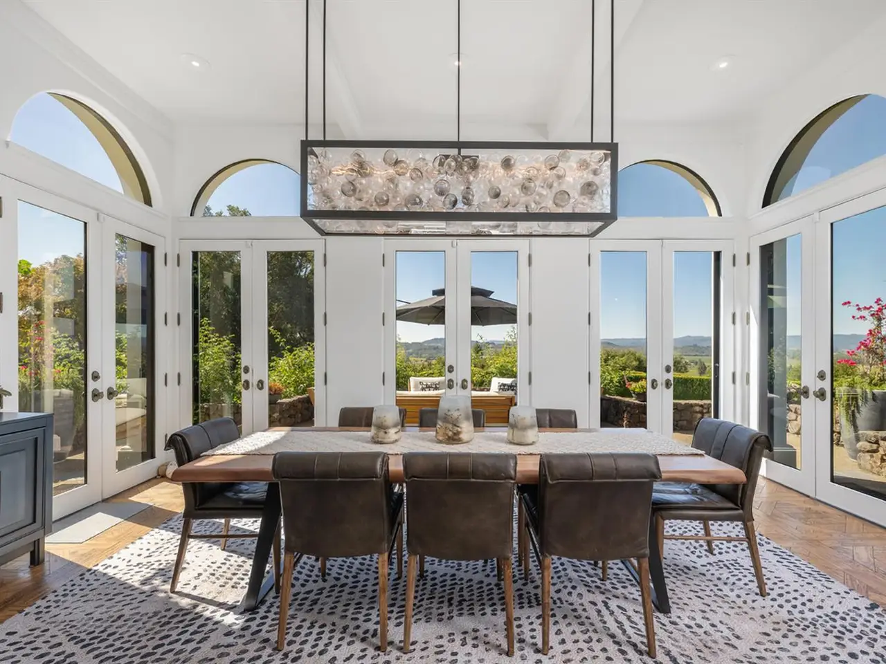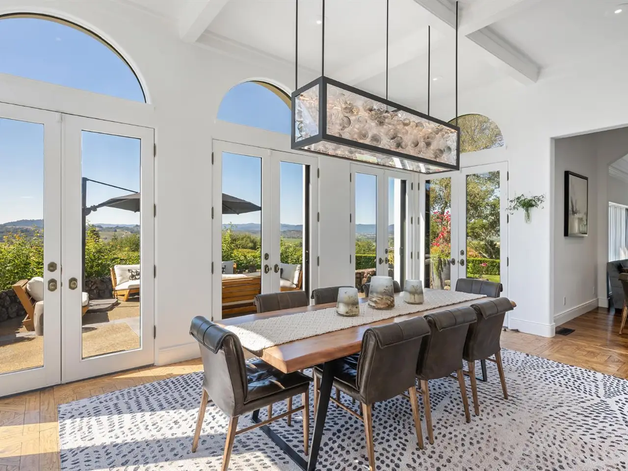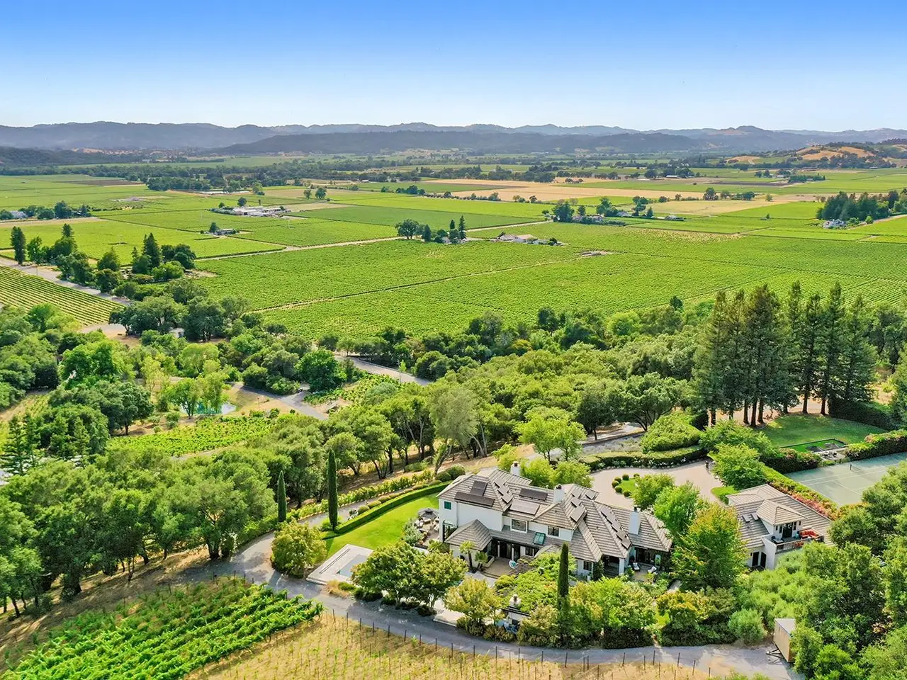 Welcome to 4395 Pine Flat Road, an elegant Healdsburg estate offering some of the most breathtaking views in Sonoma County. Just minutes from downtown yet worlds away, this extraordinary property blends luxury, comfort, and resort-style amenities on 10-plus mostly usable acres. The main residence consists of a four-bedroom, five-bathroom home is designed for both entertaining and everyday living. High ceilings, rich wood floors, and expansive windows frame vineyard and mountain vistas at every turn. Highlights include a Chef's kitchen with bar seating and seamless flow to the outdoor dining pavilion, formal dining room and multiple living spaces including a family room, library/office, gym, and wine cellar, main-level suite perfect for guests or multi-generational living, upstairs primary suite with private balcony, sitting area, and generous storage. A spacious detached studio offers flexible use for guests or extended family. Its outdoor entertainment area, complete with fireplace, is ideal for gatherings under the stars. This estate was made for relaxation and play, featuring a sparkling pool and hot tub, tennis court and bocce court, outdoor kitchen and vineyard-view dining, orchard, rose gardens, and raised garden beds, serene spots for birdwatching or simply doing nothing at all.