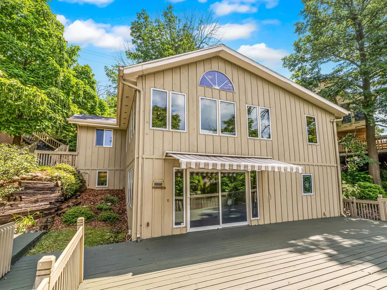 A truly exceptional offering! Featuring an impressive 145 feet of lake frontage with maximum sun exposure and beautiful eastern shoreline vistas, a residence that commands stunning water views, and a spectacular lot that invites you to expand and create a haven that reflects your style an the beauty of Okauchee Lake. Properties with this level of frontage, exposure and location are few and far between. The brilliantly bright open design offers two levels of outstanding living space. The home's open floor plan flows seamlessly from indoors to outdoors, and is designed with the extensive use of glass and grand scale windows that flood each room with brilliant sunshine and take advantage of endless sunrise-to-sunset lake views. Guests are graciously greeted through a vibrant front entry garden and into a welcoming foyer. The expansive Great Room is a centerpiece to the living space anchoring a striking floor to ceiling natural fireplace and an expanse of glass windows and doors that open to an incredible private sun deck overlooking the water - inviting the perfect space for entertaining and relaxation and front row seats for the fireworks. Culinary enthusiasts will delight in the Kitchen with abundant cabinetry and ample counter space, an ultra-spacious walk-in pantry, and a lovely dining area that's perfect for gatherings. A staircase ascends to the upper level that features a Family Room with soaring ceilings and an expanse of three walls of prominent windows that highlight more extraordinary lake views. Two generously-sized Bedrooms, a second full Bath and Laundry complete the second level. Outside, the grounds are a private sanctuary, boasting enchanting gardens, two Tennessee fieldstone patios that invite relaxation, entertaining, or simply soaking in the natural surroundings, an absolutely charming cedar-lined outbuilding, a natural stone fireplace that's perfect for roasting marshmallows or simply enjoying a fire under the stars, two piers; one new in 2021 that allows up to the docking of four boats - providing versatility and potentially a passive income source - along with family memories, fish tales, and late-night stargazing. An outstanding 2.5 car two-story Garage highlights an expansive lower level that offers versatility for water toys, a workshop, home gym, or opportunity to create guest accommodations. The long paved driveway provides ample guest parking. This property affords the perfect balance of seclusion, tranquility and accessibility to all the idyllic offerings that Lake Country provides. Whether you're looking to host, invest, or simply relax lakeside, this property offers unmatched value and flexibility.