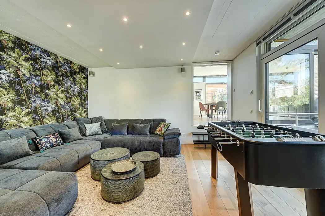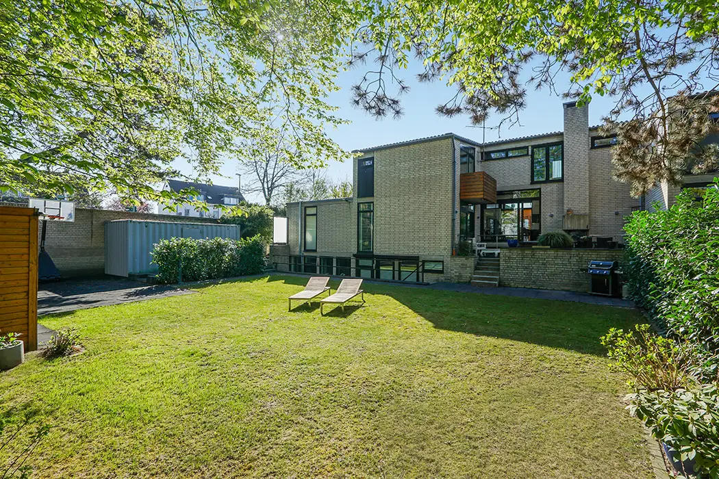 An individual and modern architect's house awaits you here, which was renovated to a very high standard and in style in 2016 and is still in excellent condition today. The property offers future residents a variety of possible uses, as there is an office area of around 137 m² directly adjacent to the main house with its approx. 225 m² of living space, both on the garden level and on the first floor. This is accessed separately via its own entrance and can continue to be used commercially in this form or serve as a granny apartment in the future, or can be connected to the main house to create a total of around 360 m² of living space without much effort, as it has already been converted into a living space. A door already connects these areas on the garden level. The split-level architecture, fantastically bright rooms, a timeless and exclusive interior design and a total of three terrace areas as well as a large garden make this property from 1972 a very special offer. The 897 m² plot is a leasehold property with an attractive and fair ground rent (currently only €3,051 p.a.). Thanks to the special layout, this property is ideal for multi-generational living, living and working next door to each other, or for merging or renting out the commercial unit. You enter the main house via the sheltered entrance area, where you will also find the front of the two terraces. A small entrance hall with guest WC and walk-in wardrobe leads to the loft-like living/dining area with open kitchen and fireplace. The modern fitted kitchen has a cooking island, which gives the room a special flair. Floor-to-ceiling window elements provide a great view and plenty of light both to the garden terrace with outdoor fireplace behind and to the front. Adjacent to this central room on the first floor is another living room, which is ideal as a cozy TV room or library. An open staircase leads from the living/dining area to the upper floor and garden level. Two bedrooms, each with an en suite bathroom, and a small study await you on the upper floor. The spacious bathroom in the master bedroom in particular leaves nothing to be desired in terms of design and function. The second bedroom also has a balcony on the garden side. On the garden level, there are two further bedrooms, a shower room, the boiler room, two cellar rooms and a hallway. One of the bedrooms also has access to the house's garden from this level. A door leads to the lower office area, where there is a room facing the garden with access to it, a staff kitchen and an interior room. A spiral staircase takes you from here to the first floor, which is bright thanks to its large windows and has three further rooms, some of which are separated by modern glass and steel structures, giving the floor a great sense of space. Another small kitchen, a shower room and a WC complete the floor plan here. The third terrace is located in front of the extension and you enter this area from the street via a separate entrance on the side of the house, so that there is a clear spatial separation of the two areas from the outside. You can reach the garden of the house via the terrace of the living area with a few steps as well as via two rooms on the garden floor or the terrace of the office area. Here, a large lawn invites you to play, as does a small outdoor sports field covered with mats. A modern garden shed and a large shipping container provide additional storage space. On the street side, the garden is protected from view thanks to a wall and dense hedge and offers plenty of space, especially for the younger residents of the house, while the large garden terrace with outdoor fireplace invites the older ones to enjoy cozy barbecue evenings. There are a total of 4 parking spaces in front of the house and a small wooden shed offers space for bicycles or motorcycles.