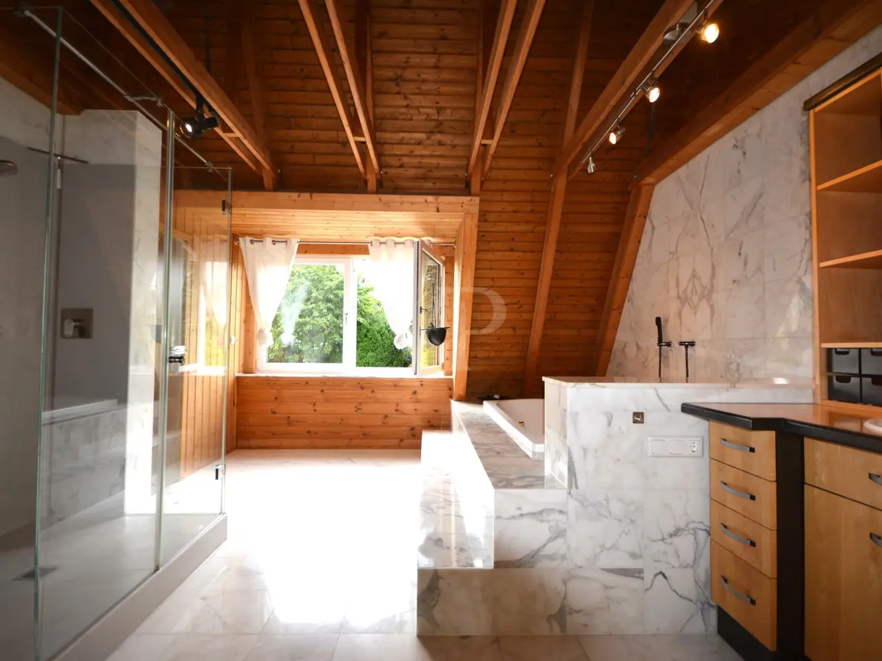 Marble-lined master bathroom