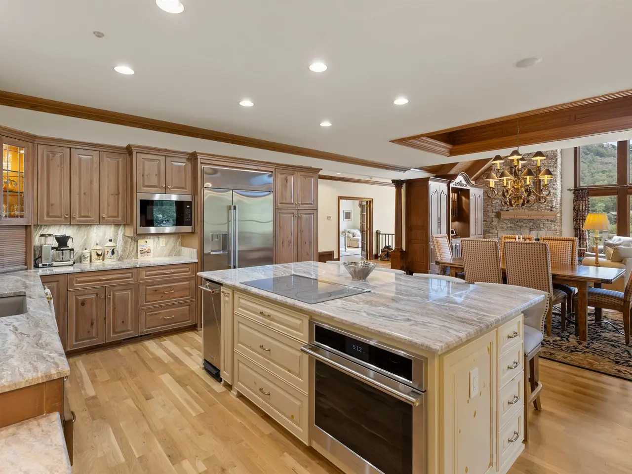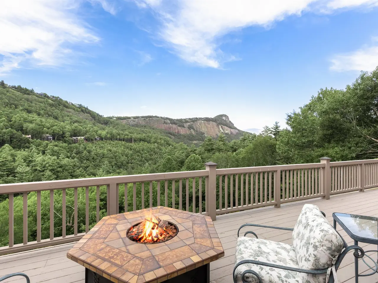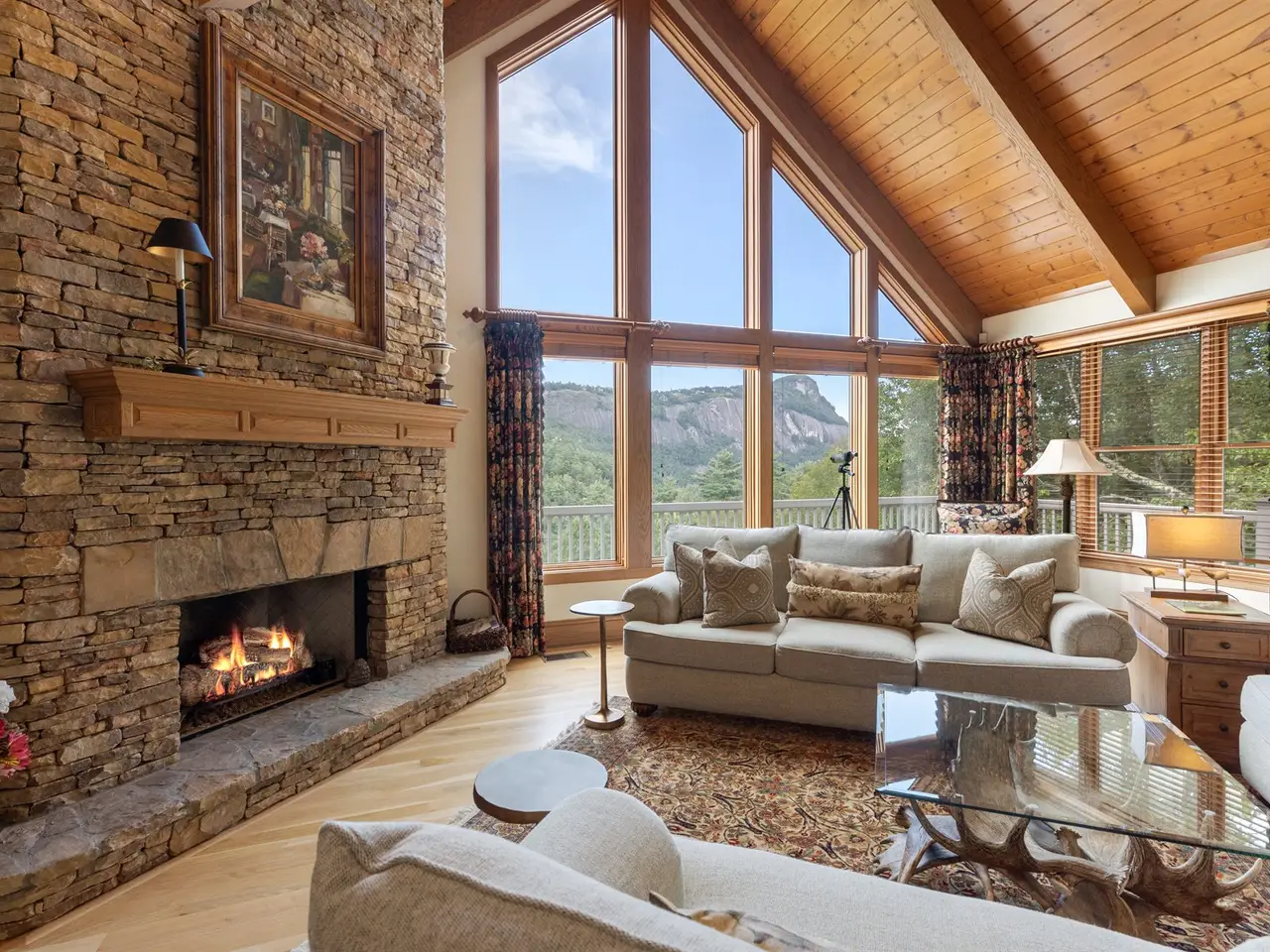 This is the panoramic BIG VIEW! Prepare to be captivated by sweeping, unobstructed views of iconic Whiteside Mountain from this stunning Highlands Falls Falcon Ridge residence, a home so remarkable it has been featured twice in Architectural Digest. Designed with generous proportions and effortless flow, the home offers main-level living with the primary suite conveniently located on the entry level. Architectural details abound, highlighted by custom wormy chestnut and oak features throughout, including an impressive 3? solid wormy chestnut entry door. The primary suite commands breathtaking mountain views and sunrises and boasts a lavish Italian marble bath with soaking tub, oversized shower, dual lighted mirrors, hidden lighted vanity, Kohler fixtures, custom walk-in closets, and a private wet bar with sink and mini-fridge. The open-concept living, dining, and kitchen spaces flow seamlessly onto a screened porch with a fully outfitted grilling station featuring a Blaze grill?an entertainer's dream with Whiteside Mountain as the backdrop. The main level also conveniently includes a guest bedroom, full bath, office/den with custom glass paned wormy chestnut and oak door, and a full laundry room with sink. The lower level provides for guest privacy with a second living area with fireplace, private deck, two spacious en-suite bedrooms, powder room, bonus/flex room with gym/playroom potential, and a secondary laundry area. Recent upgrades are extensive, including a remodeled kitchen, refinished hardwood floors, 27 new windows, new roof, gutters with guards, encapsulated crawlspace, repaved driveway with focal pavers, updated HVAC systems, new water heaters with recirculation pump, blown-in attic insulation, new gas logs in main level fireplace, and view clearing to fully showcase dramatic views of Whiteside Mountain, Wildcat Ridge, and Cullasaja Club beyond. A drainage system beneath the upper deck ensures protection for the lower-level outdoor living area. Peace of mind comes with a 500-gallon fresh water reserve tank and a whole-house generator. A two-car garage with workshop, along with a welcoming exterior accented by a serene water feature, completes this mountain sanctuary. This Highlands Falls home is more than a residence?it is a retreat of timeless architecture, meticulous updates, and awe-inspiring views. Membership to Highlands Falls CC is not mandatory but the amenities are tremendous and the club is vibrant.