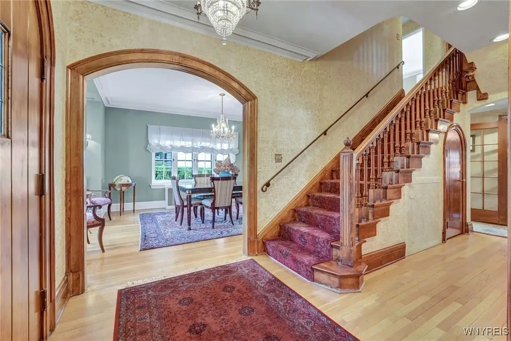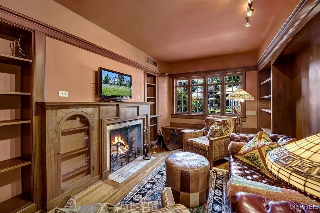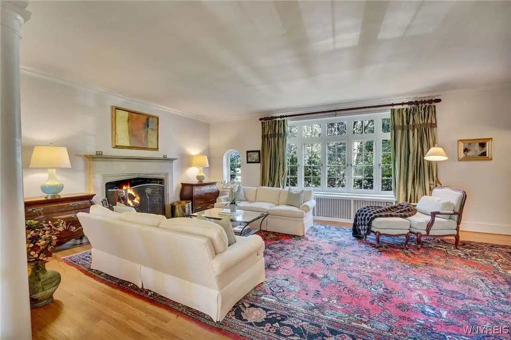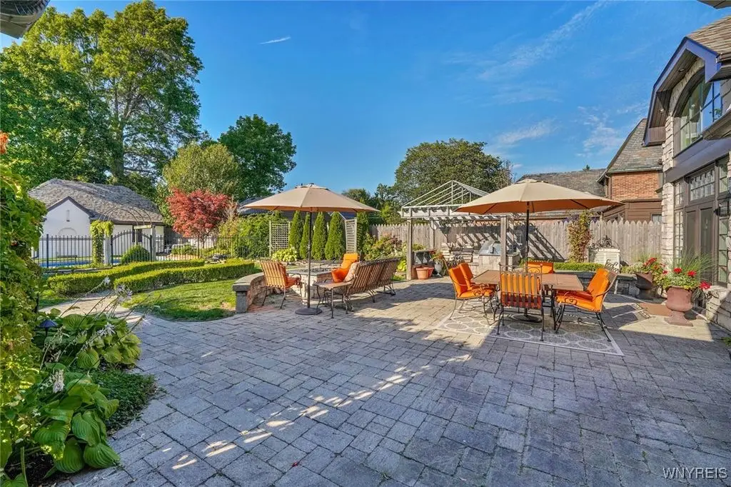 Timeless Elegance Meets Modern Luxury Across from Delaware Park at 81 Nottingham Terrace. Discover refined living in this stunning 4 bedroom, 3.5 bath Tudor estate, perfectly positioned across from Olmsted's historic Delaware Park. A seamless blend of classic architecture and contemporary upgrades, this home offers exceptional comfort and elegant style. The fully remodeled chef's kitchen is a showpiece, featuring premium appliances including a Sub-Zero refrigerator, Wolf range, Cove dishwasher, and a built-in coffee bar. Elegant Carrara marble countertops and a spacious island make it ideal for both cooking and entertaining. The kitchen opens to a bright breakfast room and offers a unique view into the climate-controlled wine cellar, which holds up to 1,000 bottles of wine. The formal dining room, adorned with its original chandelier, flows into a grand foyer. A spacious living room centers around a striking woodburning limestone fireplace, while the large modern family room features radiant heated floors and a loft above. French doors lead to a private courtyard patio, perfect for relaxing or hosting guests. The distinguished library/study offers warmth and character with a wood-burning fireplace and custom built-in bookshelves. Original hardwood floors and incredible woodwork throughout. Gorgeous staircases show the charm and character of this exquisite home. Upstairs, the luxurious primary suite includes three closets and a spa-inspired ensuite bath. The second bedroom opens to a Juliet balcony, and the third bedroom features a generous walk-in closet. The third-floor bedroom includes an additional full bathroom, ideal for guests or a private retreat. Outdoor living is equally impressive - enjoy a saltwater inground pool, a stone fire pit for cozy evenings, grilling area designed for effortless entertaining. Fully fenced electronic gated yard with sprinkler system. Updates include roof, boiler system ($30,000), Generac generator, and much more. This exceptional home combines historic charm, modern amenities, and resort-style outdoor living in one of Buffalo's most coveted neighborhoods.