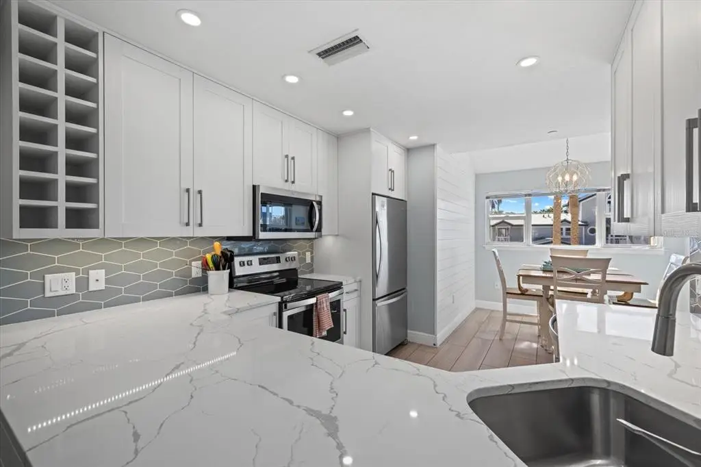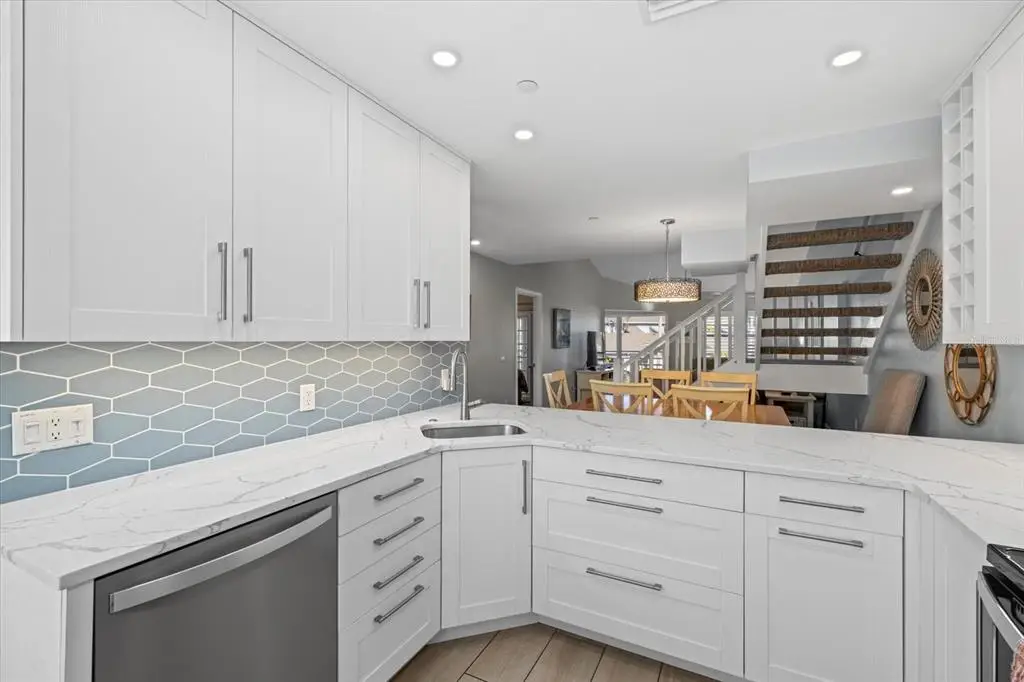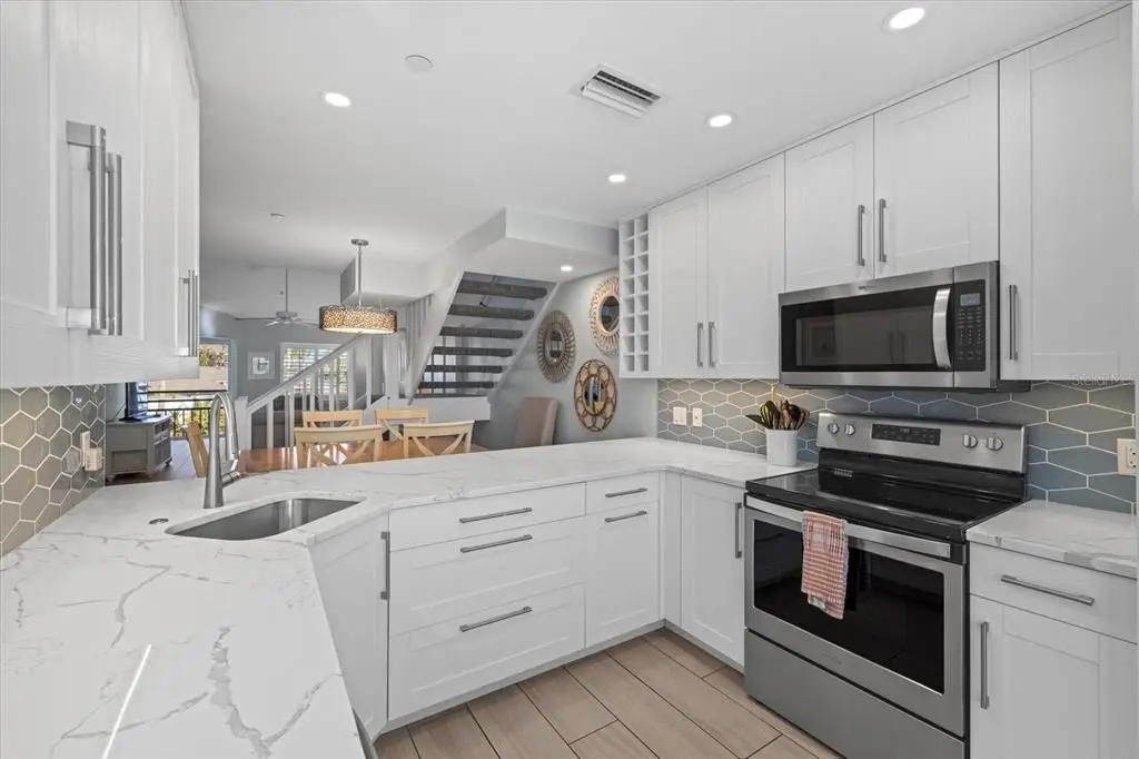 An amazing year-round residence, vacation or investment property! Don't miss this rare opportunity to own your piece of paradise. Just across the street from world renowned Siesta Beach with dedicated beach access, this 3-bedroom 2 bath unit with loft is beautifully turnkey furnished. Recently renovated, the open first floor plan includes wood-look tile throughout, shiplap walls and raised ceilings in the hallways, kitchen and dining areas. The kitchen features solid wood cabinetry, quartz countertops, stainless appliances and a windowed dining area. Ideal for entertaining, this unit features a multitude of dining options -the main dining area with seating for 6-8 is located alongside the kitchen breakfast bar and the glass enclosed lanai accommodates up to six more diners. The main floor boasts a spacious master bedroom with French doors leading to the large, enclosed Florida room, which is open to the living area, with its multiple sliding glass doors and wood cathedral ceiling - looking out to a lovely pond with abundant wildlife. The renovated primary bathroom features dual sinks, a beautifully tiled walk-in shower, abundant cabinet/drawer space and a large walk-in closet. The laundry closet with full sized washer and dryer is on the main level. The second floor houses a versatile loft, two additional bedrooms and a bath which provide comfortable space for family or guests. Inviting front porch affords views of Siesta's renowned sunrises & sunsets. The attached one car garage provides coveted storage and the dedicated driveway provides additional parking. Located in the highly sought-after Gulf & Bay Club Bayside community featuring resort-style amenities including a gated entrance, 2 heated pools, tennis and pickle ball courts, clubhouse, fitness room, sauna, walking paths, fishing pier, and picnic areas with gas BBQ grills. This attractive Key-West style complex provides on-site management to assist with your every need. A one-week minimum rental period makes this an ideal investment property. Act soon and enjoy the rental income for this season!