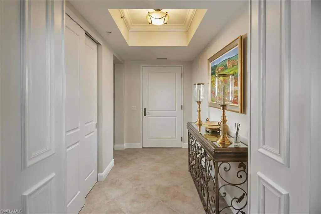 Full Colony Golf Membership available to purchase with this exquisite luxury corner residence on the 4th floor of Florencia, showcasing breathtaking panoramic views that capture the stunning sunrises and sunsets over the Gulf of Mexico, Estero Bay, and the Colony Golf Course. Spanning an impressive 2,600+ square feet, this residence is designed for both comfort and sophistication, featuring a private elevator that opens directly into your home. With three spacious bedrooms, a den, two private terraces, and a large screened lanai complete with electric shutters, this home offers an unparalleled living experience. The open layout seamlessly connects the large kitchen and great room, providing impressive opportunities for entertaining guests in style. The kitchen has a SubZero refrigerator and other updated appliances that enhance both functionality and aesthetic appeal. This residence is not just a home; it's a lifestyle that embodies the elegance and opulence that discerning buyers seek. Florencia has a striking main lobby, social room, theater, fitness facility and pool. Two guest suites. Privacy officer to greet you and your guests and live-in management. Two parking spaces in the garage. Colony residents automatically enjoy a host of amenities including The Bay Club on Estero Bay with both casual and elegant private dining with gorgeous water views, a 34-acre private island beach park, 12 tennis courts as well as a host of other court sports including pickle ball and bocce; sailing, canoe and kayaking, as well. Located 1.5 miles west of the Coconut Mall, excellent dining and a swift trip to the airport.
