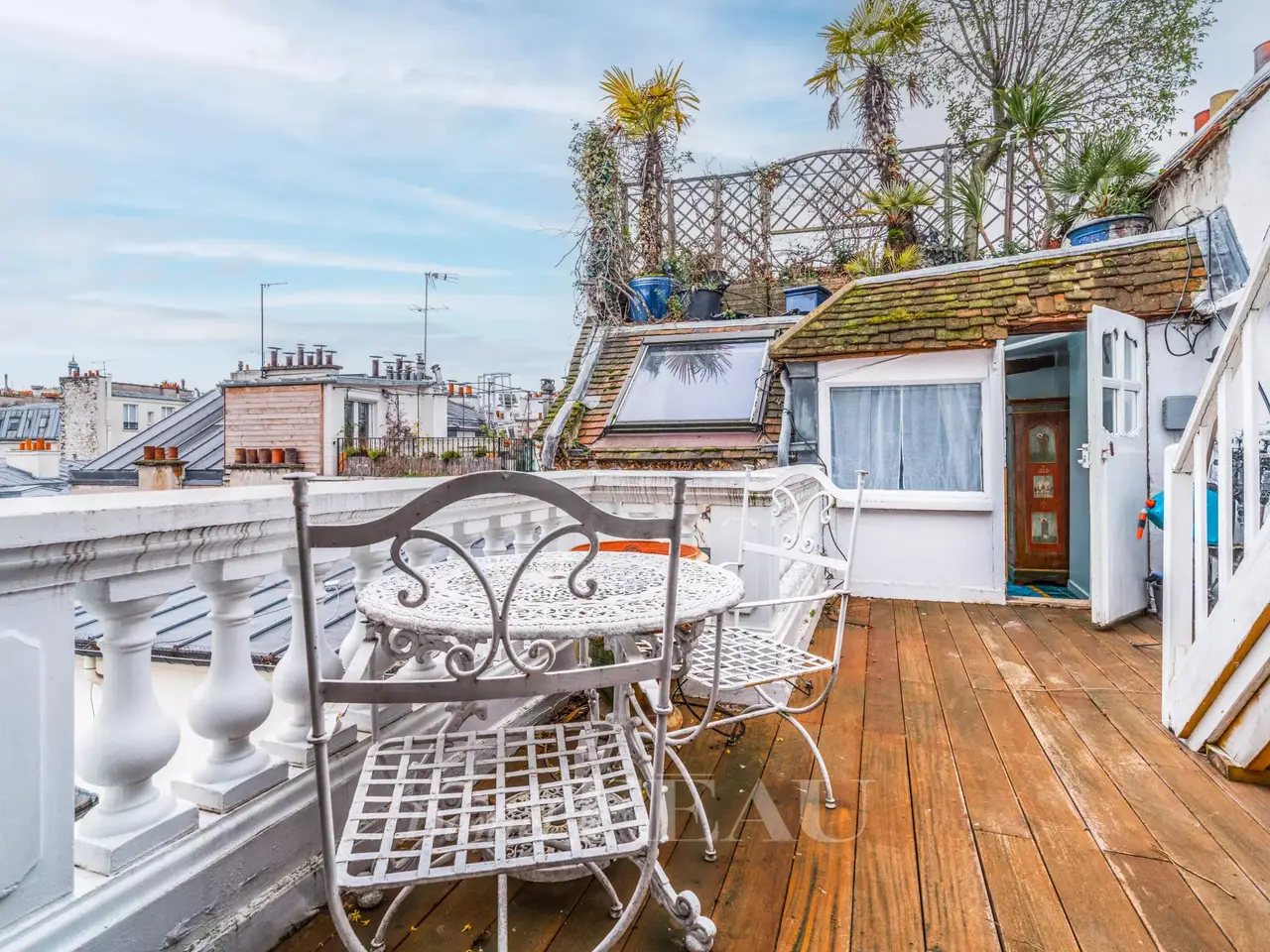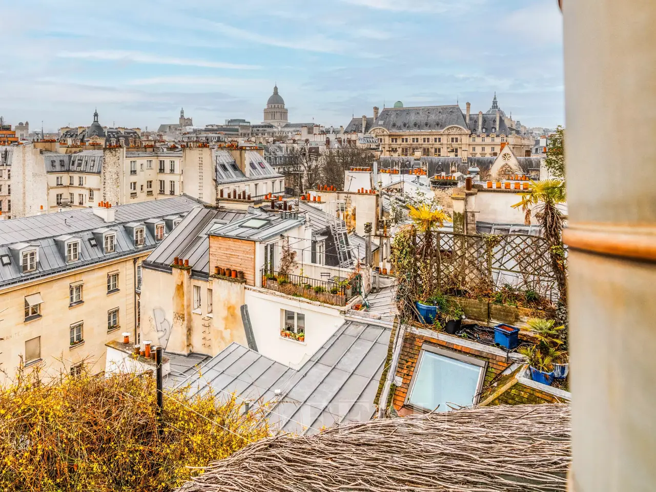 Between Notre Dame Cathedral and the Panthéon. This atypical apartment offering 118 sqm of bright and peaceful floor space and 108 sqm of living space as defined by the Carrez Law is on the 4th and top floor of a late 19th century building with a lift. Enjoying an open view over the rooftops, it includes a spacious living/reception room, a kitchen with dining facilities, a bedroom with a shower room, and a separate wc. Upstairs are two rooms including a master suite with a bathroom, both of which open onto a sunny terrace. A roof terrace commanding a panoramic view of the capital’s iconic landmarks is on the top floor. Henri IV catchment area.
