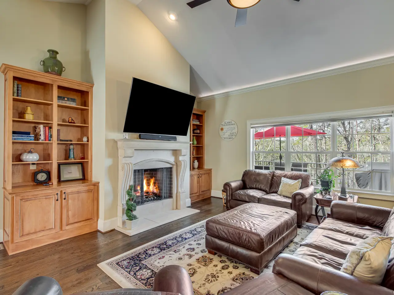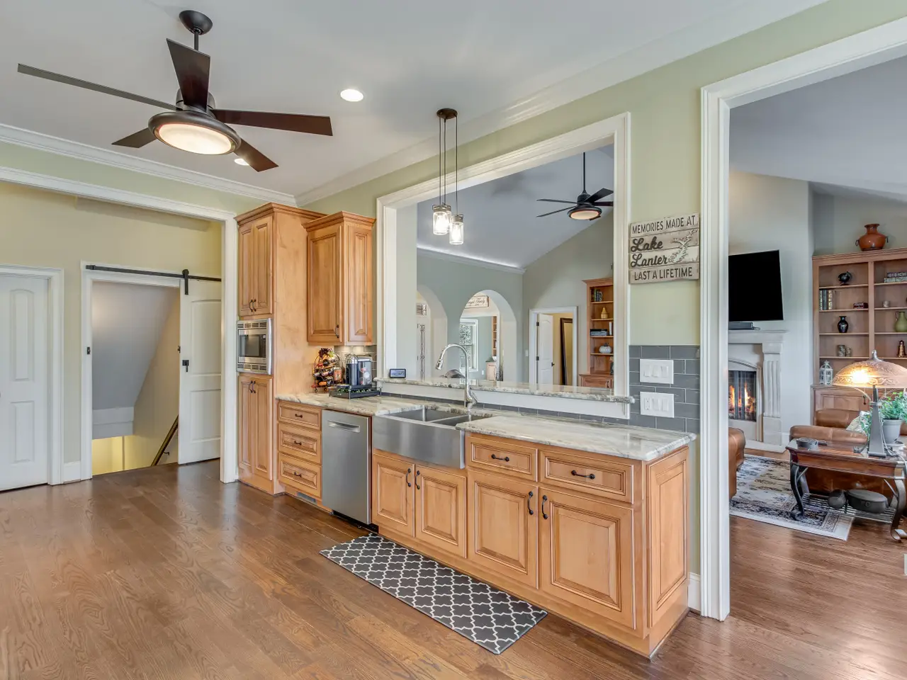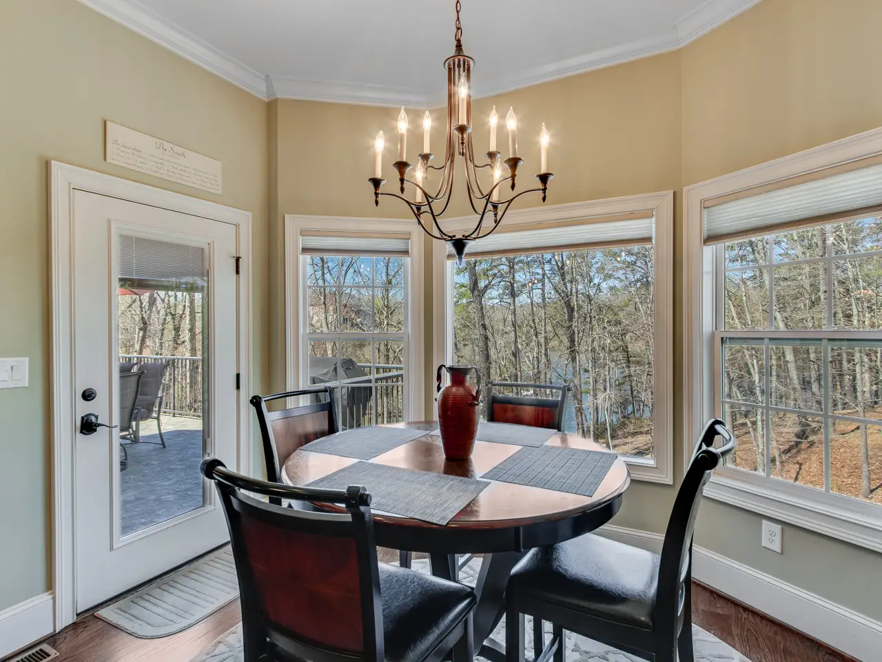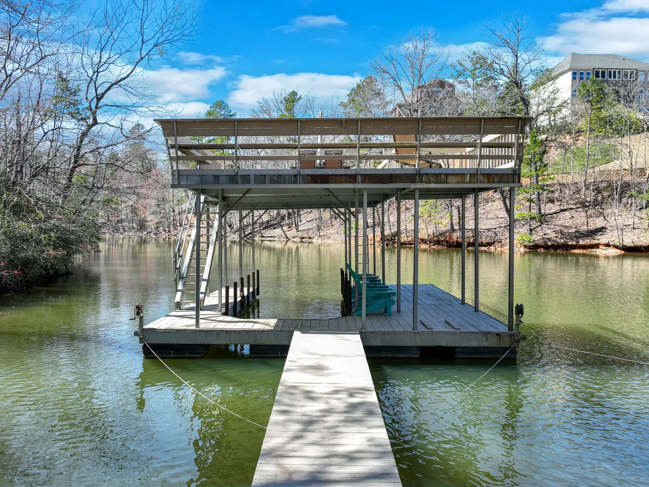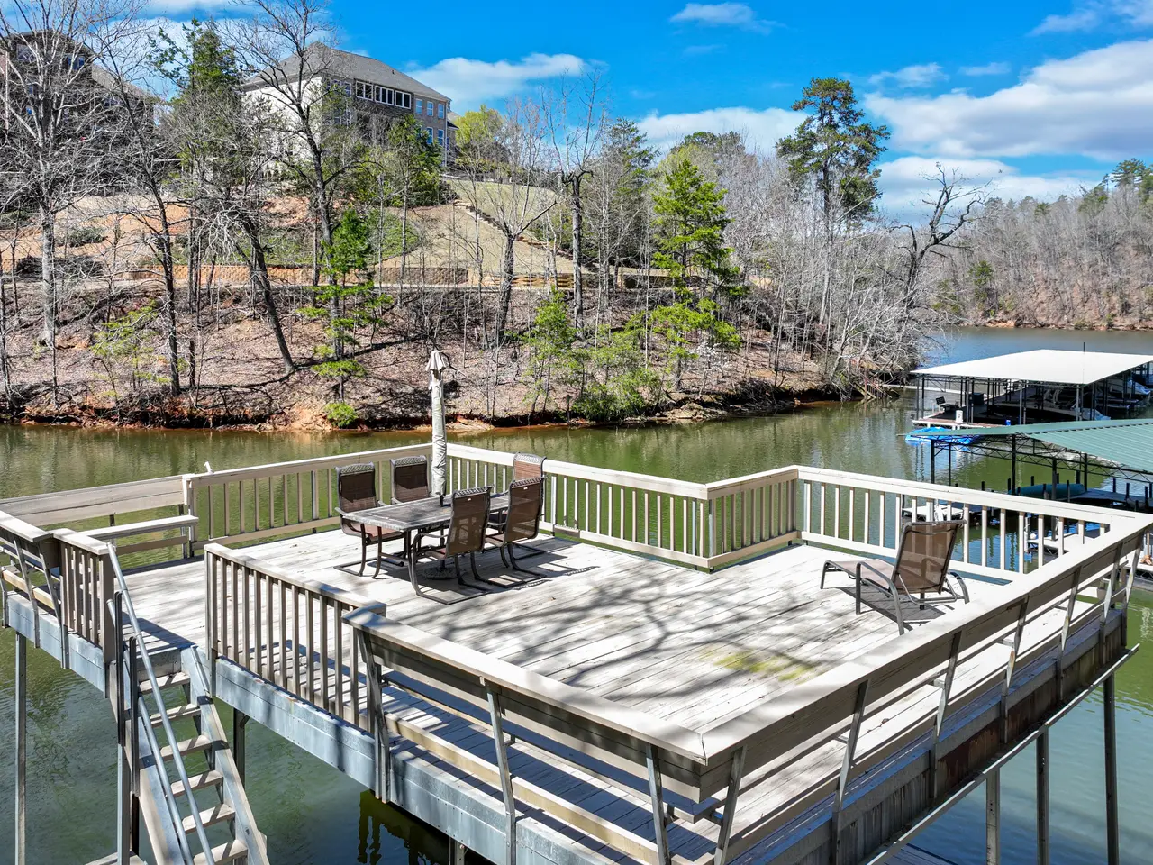 This elegant, traditional Lake Lanier home has everything you need for fine lake living! Conveniently located just 10 minutes from downtown Gainesville, The Rowing Venue, the hospital district, shopping, and restaurants, this home is designed for the ultimate lakefront lifestyle. With stunning lake views from most rooms, it also features a paved path leading to a single-slip party dock in deep, calm, no-wake waters-perfect for lounging and swimming. Situated on a double lot with a low CORPS line, the property offers a circular driveway and abundant parking, along with a drive-around access to the lower-level double garage-ideal for a golf cart, boat toys, a workshop, and extra storage. Inside, the main floor boasts an open layout with all hardwood floors. The great room, featuring a striking stone wood-burning fireplace, flows seamlessly into the kitchen, which includes granite countertops, a double gas range, and high-end Thermador appliances. A dining room and a study/office complete this space. The oversized primary suite is a true retreat, featuring a sitting area, double custom closets (one with a double-stack washer/dryer), heated travertine tile floors, a jacuzzi tub, a spacious shower, and double granite vanities. Additionally, the main level includes a second ensuite bedroom, a powder room, and a large laundry room. Upstairs, you'll find a guest bedroom, a full bath, and a large bonus room over the garage. The beautifully finished terrace level, completed in 2015, offers luxury vinyl flooring, a family room with a second stone wood-burning fireplace, a full kitchen with all appliances, a dining area, a large game room, a full guest bath, and an ensuite with its own private bath-perfect for entertaining or multi-generational living. Every bathroom is equipped with heated travertine tile floors, and the home features only hardwood and luxury vinyl flooring-no carpet. This exceptional Lake Lanier property combines elegance, functionality, and the best in lakeside living!