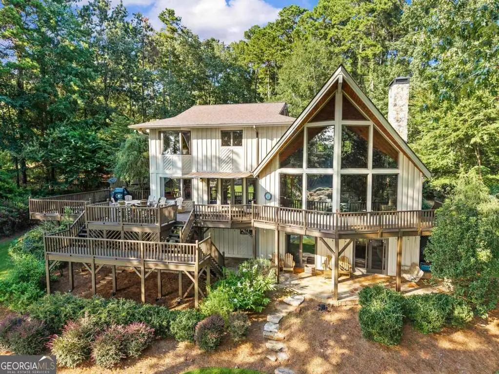 This beautifully maintained golf course home offers sweeping views of holes 2, 3 & 4 of The Landing course, a pond view, and looking down the fairway to the stunning water of Lake Oconee-views from this home are so exquisite, they have been featured in Reynolds Magazine Advertisements over the years. Designed with large, light-filled spaces and walls of windows, the open-concept layout brings the outdoors in. The main level features two bedrooms, a gourmet kitchen, and expansive living and dining areas perfect for entertaining. Enjoy peaceful mornings and breathtaking sunsets from the large multi-level wraparound deck. Ideally situated in The Landing of Reynolds Lake Oconee with access to world-class amenities, golf, lake life, and more. This is a rare opportunity to own one of the best view properties in the community. Seller makes a Club membership available for Buyer to explore how they can enjoy golf, sporting grounds, tennis, pickleball, fitness, recreational, and culinary amenities of a world-class private club.