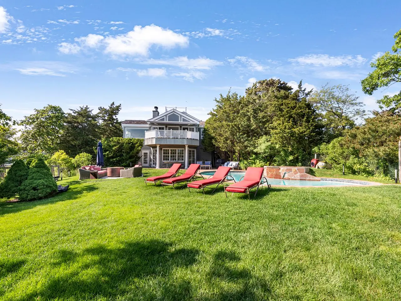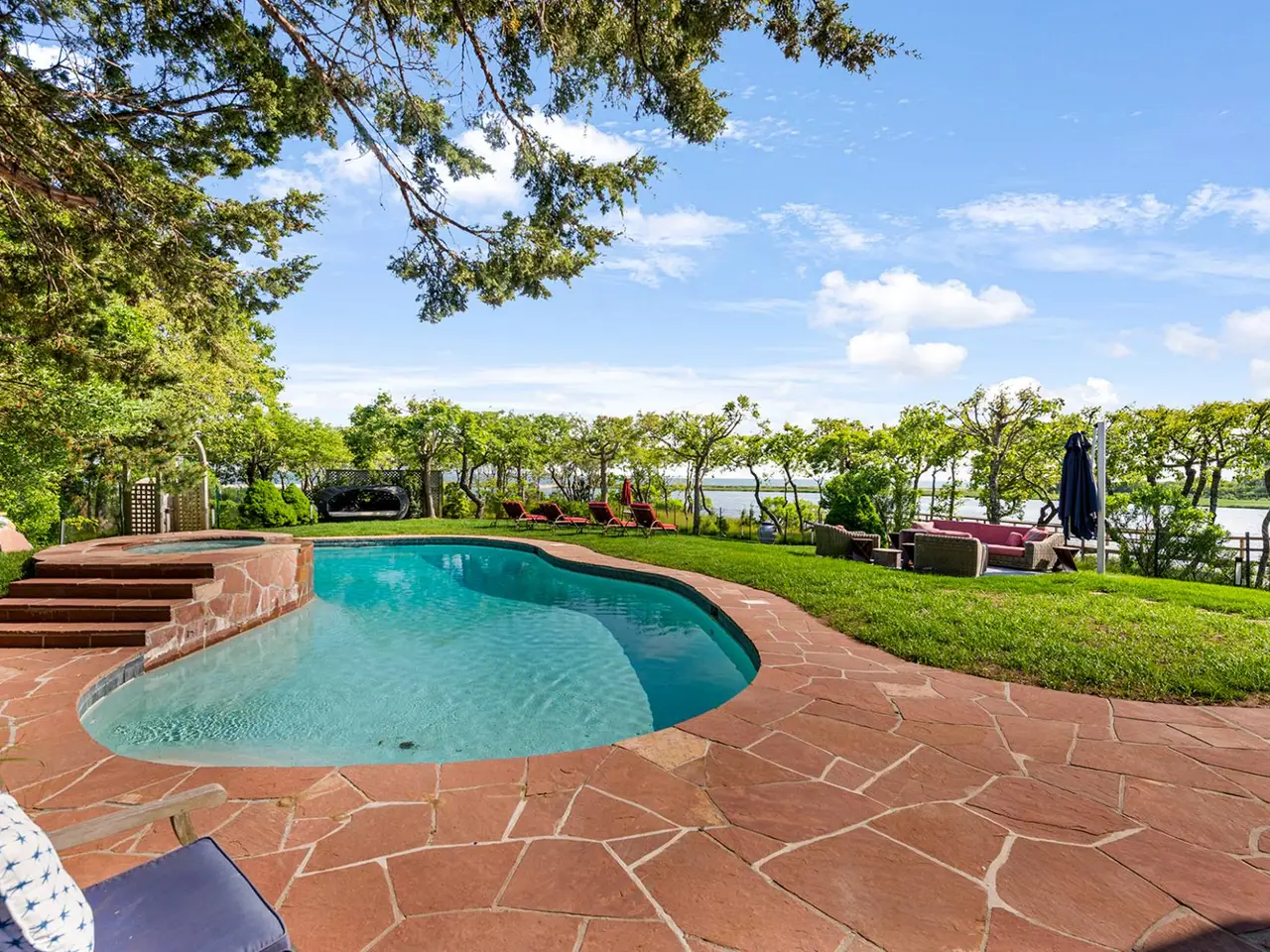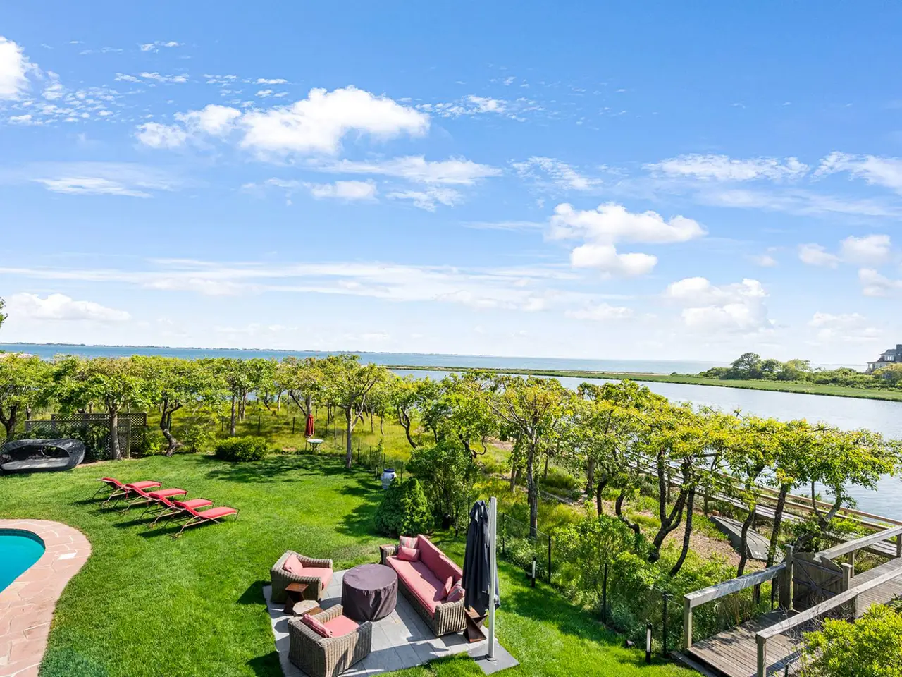 Situated on a picturesque quiet peninsula overlooking Shinnecock Bay all the way to the ocean, this unique and very private 1.6-acre property has been just upgraded and renovated, including a brand-new full Chef's kitchen on the first floor, plus a new in-suite bedroom. Spectacular Post-Modern home featuring a total of four en-suite bedrooms, 5.5 full baths, steam shower, an open floor plan, living room, enjoy a primary ensuite with a fireplace and picture windows with the most spectacular water views, top-of-the-line appliances, you get stunning water views throughout the whole house. Additional amenities include a media room and game room with a pool table. The grounds feature lush landscaping with brand new designer lights, firepit, a heated gunite pool and spa overlooking the water, a private dock and mooring rights. This property faces south offering unobstructed views with the most amazing sunrises and sunsets. Enjoy the quiet and private unique peninsula location. Just less than 2.5 miles from the center of Southampton Village.