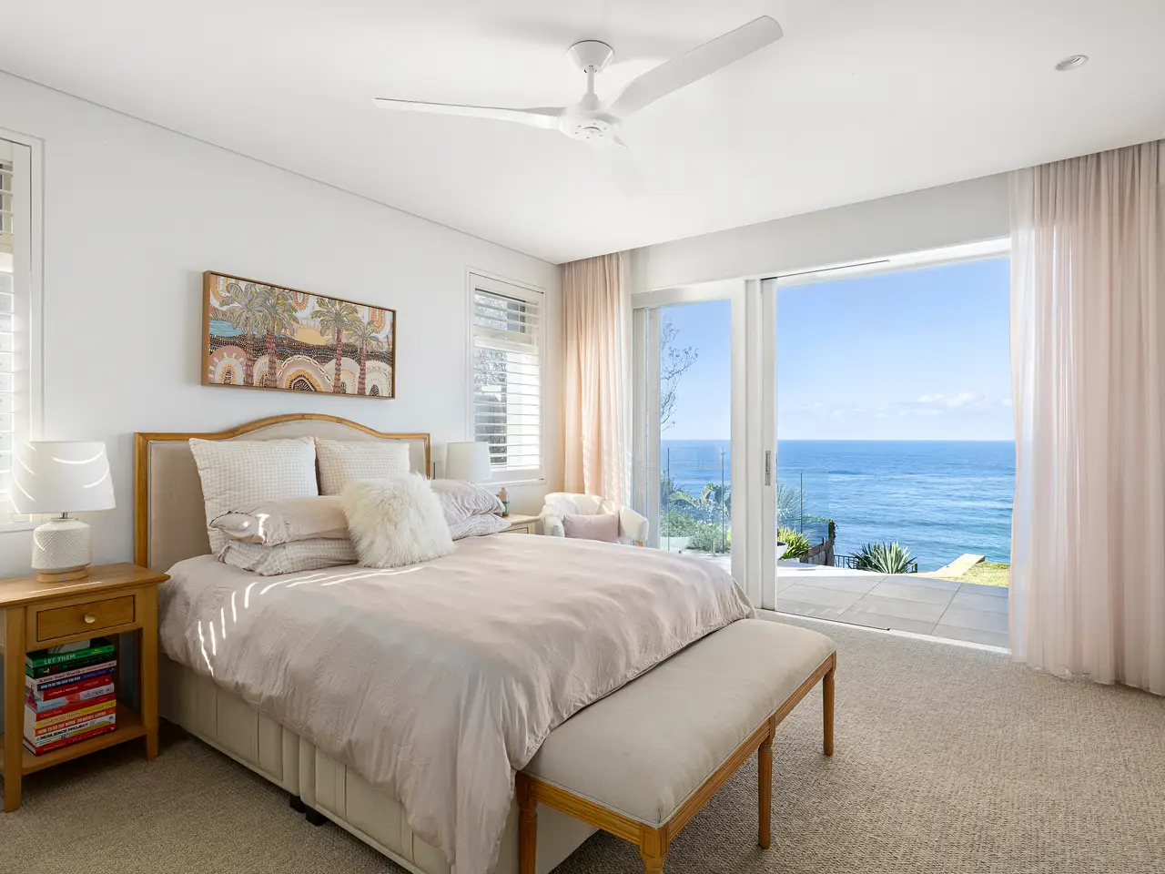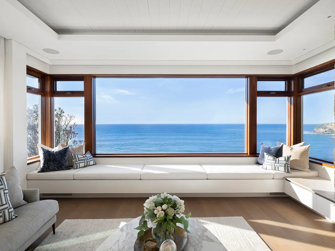 An extraordinary architectural masterpiece designed for elegant beachside living, this bespoke residence boasts uninterrupted panoramic views from Pittwater to North Head. Designed by renowned architect James de Soyres and completed in 2021, the home is a seamless fusion of sophistication and smart home innovation. - Commanding views of Mona Vale and Warriewood Beaches with regular whale and dolphin sightings - Smart home automation via CBUS and integrated app control for lighting, blinds, sound, CCTV, heating, and more - Chef's kitchen with Calacatta Oro marble, four Miele ovens, butler's pantry, and premium appliances - Living room with Jetmaster gas fireplace, sandstone surround, and full-length ocean-view window seat - Expansive north facing verandah with operable louvre windows, integrated BBQ, bar fridge, and retractable doors - Master suite with custom joinery, ocean views, luxurious ensuite, walk-in robe, and private access - Lower ground includes studio with sprung dance floor, rumpus with kitchenette, and courtyard access - Five spacious bedrooms, multiple luxe bathrooms, zoned air-conditioning, underfloor heating throughout - Resort-style heated pool, landscaped gardens, fire pit, auto gates, EV charging, solar battery and tank water system A true coastal sanctuary of timeless elegance, set directly on the coast and reserve.