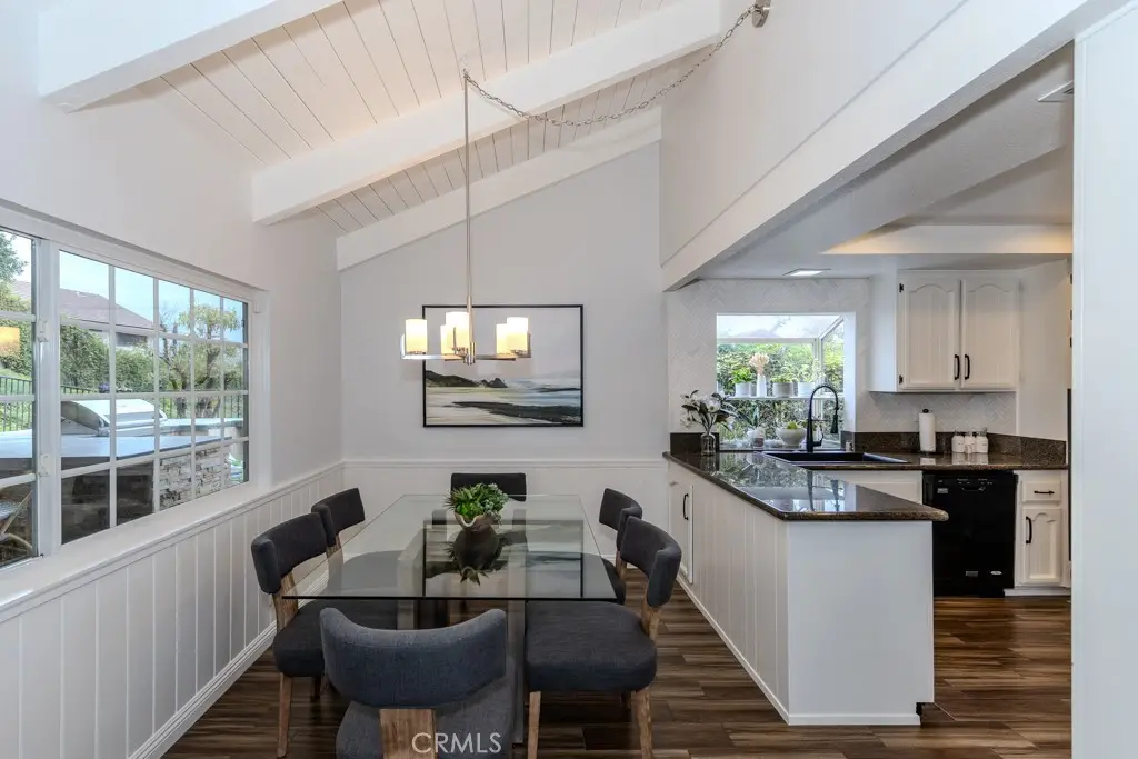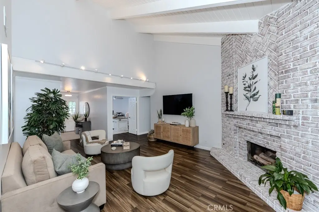 Single-story 3-bedroom 2-bath view home at 581 S Paseo Carmel in Anaheim Hills offers city lights and mountain vistas along with a spacious primary suite and a backyard retreat built for entertaining. The property begins with great curb appeal, wood siding with brick accents, and a landscaped approach. A covered entry functions as a front patio seating area and sets a welcoming tone. Inside, wood-look tile flooring runs throughout with no interior steps. The main living area opens under vaulted wood beam ceilings with abundant natural light, creating a bright and open feel that blends into the dining area. A hallway with a double-door storage closet leads toward the family room, where vaulted ceilings continue above a tall whitewashed brick fireplace wall. The family room flows into a kitchen nook finished with wainscoting and wood accents, positioned beside large windows for natural light. The kitchen is anchored by a peninsula counter and finished with granite countertops, a herringbone marble mosaic backsplash, recessed lighting, and a deep sink. A garden bay window offers extra display space. Appliances include a gas cooktop, oven, dishwasher, and trash compactor. Pull-out drawers add convenience, and the adjacent dining space accommodates a full table. The primary suite features double door entry, vaulted ceilings with a ceiling fan, dual mirrored wardrobes, and French doors with operable side windows. Its en suite bath offers dual granite vanities, a walk-in shower with seating bench, a private water closet, and large travertine tile finishes. The second bedroom, also with double-door entry, is used as an office with ceiling fan and mirrored closet, while the third bedroom includes the same. The guest bath is a full bath with granite vanity and large travertine tile shower surround. The laundry room is inside with overhead cabinetry. The attached two-car garage provides direct access, storage cabinets, and overhead racks. The backyard is designed as an entertainer's retreat, featuring a large Luminwood patio cover with recessed lighting and dual ceiling fans, paver hardscape, built-in barbecue with bar seating, a decorative glass gas fireplace, turf, and a putting green. Mature trees along the rear add privacy while framing the city lights and mountain views. Located minutes from shopping, dining, and parks with nearby access to freeways and award-winning schools, this property offers a single-level lifestyle with outdoor amenities and relaxing views
