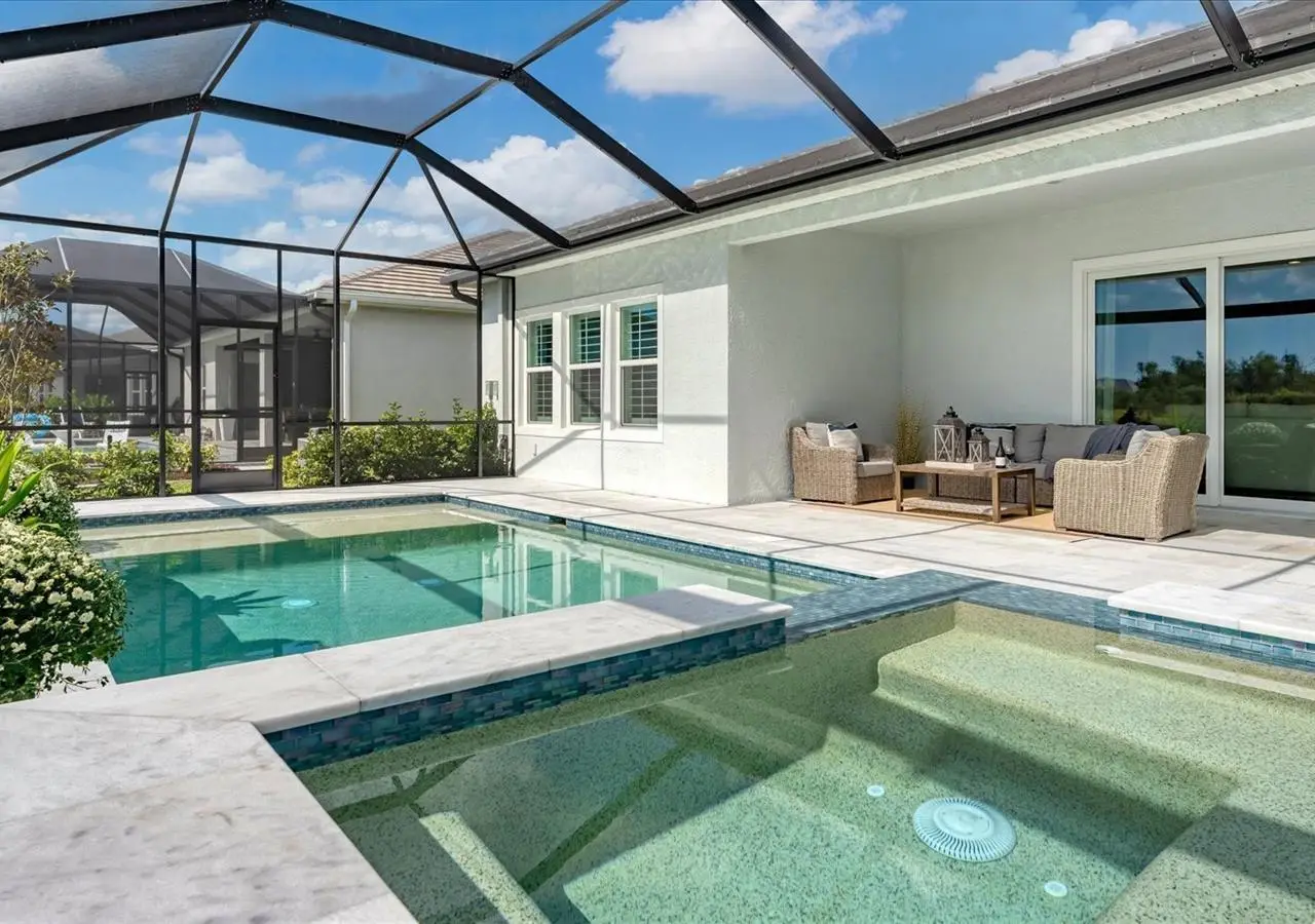 Experience luxury living within Wellen Park's Everly neighborhood, a private, amenity-rich, gated community designed for those who appreciate elegance, comfort, and connection. This exquisite residence embodies modern coastal living with over 3,600 square feet of refined interior space and an expansive outdoor entertaining retreat. Step outside to your custom-designed saltwater pool and spa, complete with a sun shelf and concrete sub-base deck - engineered to prevent settling and shifting of the main pool deck while providing easier long-term maintenance. The travertine tile lanai, generous covered spaces, and natural preserve backdrop create a peaceful and private oasis ideal for entertaining or relaxation. Inside, a soft neutral palette and designer-selected finishes create an atmosphere of warmth and sophistication. The gourmet kitchen is a chef's dream, featuring Monogram appliances, gas cooking, two spacious pantries, and a custom layout perfect for hosting and gathering. A dedicated den or office offers flexible space for working remotely or enjoying quiet retreat time. The primary suite serves as a luxurious sanctuary, with a soaking tub, rain shower, and elegant design touches throughout. Three additional bedrooms and baths provide comfort and privacy for family and guests alike. The second floor expands the home's versatility - offering a bedroom, full bath, and an open area ideal for a media room, gaming space, or children's retreat. Car enthusiasts and golf lovers will appreciate the three-car garage configuration, with a front-facing two-car garage and a side-entry single-car garage - perfect for a golf cart or extra storage. Residents of Everly enjoy access to premier community amenities, including a resort-style pool and spa, state-of-the-art fitness center, pickleball courts, and an elegant clubhouse - all designed to complement the vibrant, active lifestyle that defines Wellen Park. Conveniently located and just a golf cart ride to downtown Wellen Park, near local beaches, Venice shopping and dining, Atlanta Braves Spring Training Facility, I-75, and area airports. Every inch of this home showcases impeccable craftsmanship and bespoke design, creating a residence that is as breathtaking as it is functional. Designed for both beauty and function, the home features impact-rated windows for weather protection, energy efficiency, and peace of mind. Every detail from the coastal-inspired lighting to the thoughtful architectural flow - reflects a level of craftsmanship and design unique to Everly living. Whether entertaining by the pool, relaxing in the spa, or gathering in the heart of the home, this property offers an elevated coastal lifestyle in one of Wellen Park's most prestigious neighborhoods. No waiting to build this winter- this extraordinary home is complete and ready to welcome you home.