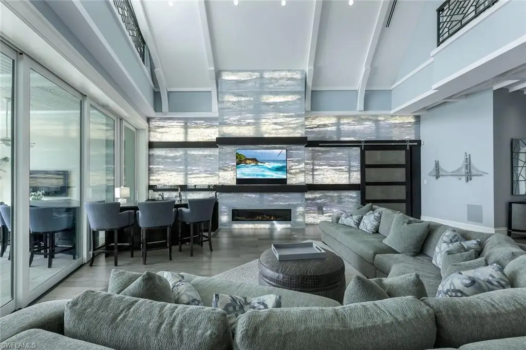Soaring backlit quartz accent wall and cathedral ceilings with intricate millwork
