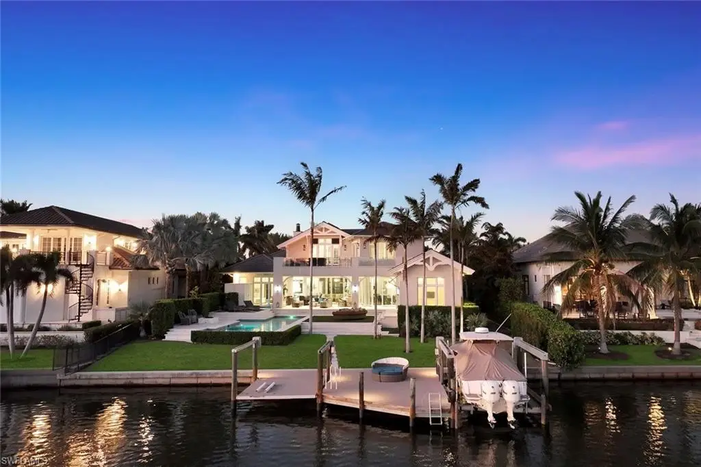 Live in casual elegance in this beautiful custom bay front home in The Moorings, timelessly designed by Harrell & Company Architects on just under a private + acre premier southern exposure lot. This private oasis has been professionally decorated with a coastal flair. Watch the dolphins and eagles on Hurricane Harbor from the great room's floor to ceiling windows with zero corner sliding doors for seamless indoor-outdoor living and entertaining. Upgrades galorea soaring back lit quartz accent wall, cathedral ceilings with beautiful mill work; each ceiling a masterpiece, an indoor/outdoor bar, perfect for entertaining. There is a private elevator, Lutron lighting, two laundry rooms, two powder rooms and three car garages. The kitchen will delight your inner chef with professional grade appliances, gas six burner range, two dishwashers, walk in pantry and Miele built-in coffee machine. The first-floor master suite features a large walk-in closet with a dressing area and laundry room, private outdoor shower and a lovely view of the bay and the spa with waterfall. The study doubles as a guest bedroom, two queen-size Murphy beds, the second-floor hosts 2 additional bedrooms and baths, wet bar, family room loft and bayfront deck with a firepit. Overlooking the pool and bay you will find the cabana with bedroom and bath. The travertine lanai features a covered dining and living areas with wet bar, TV, grilling area, retractable screens, and shutters. The sparkling pool and spa are located on the terraced lawn featuring a firepit, several seating areas leading to the bay front deck with boat and jet ski lifts. Built in 2016 using the highest quality materials by D. Garrett Construction at a high elevation, this home has never been damaged by hurricane or storm surge. For your peace of mind there is a security system with cameras, high impact glass windows & doors, all at a high and dry elevation. This house is a true showplace. The Moorings is conveniently located west of 41 in the City of Naples and features a private residence Beach Club. Two miles from 5th Avenue and all that Naples has to offer. Location, Luxury and Beauty!
