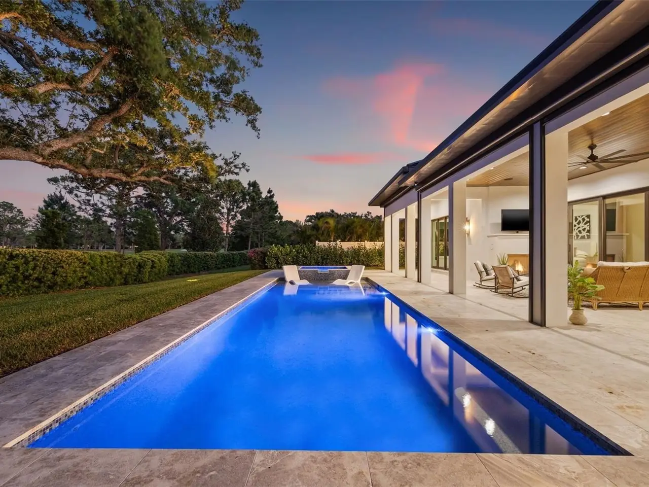 Attention all Annika LPGA tournament attendees! Be among the first to step inside this brand new, never lived-in home with golf course views, just in time for all the LPGA action. Move straight into an untouched masterpiece overlooking the 5th fairway of the prestigious Pelican Golf Club, widely regarded as Pinellas County’s finest private course. Completed in 2025 and never occupied, this executive residence pairs crisp modern architecture with warm, livable spaces, creating an ideal setting for everyday comfort, grand entertaining, and multigenerational living. A dramatic great room welcomes you with oak floors, 14-foot coffered ceilings, and an entire wall of glass that frames manicured fairways and bathes the interior in natural light. The adjacent chef’s kitchen is a true showpiece, anchored by dual center islands, bespoke cabinetry, dramatic marble countertops, Kraus workstation sinks, Waterworks fixtures, and professional-grade appliances that are equally suited to casual breakfasts or catered soirées, while the open dining and living areas flow seamlessly to the outdoors through hurricane-rated sliders. The primary suite is a private sanctuary with two generous walk-in closets and a spa-inspired bath featuring dual oversized rain shower heads, a deep soaking tub, and dual vanities with a dedicated cosmetics station. A split-bedroom layout ensures privacy for family and guests, and a versatile bonus room can serve as an executive study, formal dining room, or fifth bedroom. Everyday convenience is elevated by two full sets of washers and dryers in the interior laundry room, and climate-controlled storage in the oversized two-car garage; a separate air-conditioned single garage, about 375 square feet, that can easily accommodate a third vehicle or golf cart. Outback, resort living awaits: a salt-water pool and spa, motorized retractable screens, and a gas fireplace create an effortless venue for sunset cocktails beside the fairway. A 26kW whole-house generator, concrete-block construction, impact glass, and high-efficiency HVAC deliver peace of mind and low operating costs. Minutes from Clearwater’s beaches, marinas, and dining—yet worlds away in privacy and prestige, this brand-new residence offers flawless finishes, cutting-edge systems, and an unrivaled golf-course backdrop. Virtual tour and floor plans are available upon request. Private showings available by appointment only.