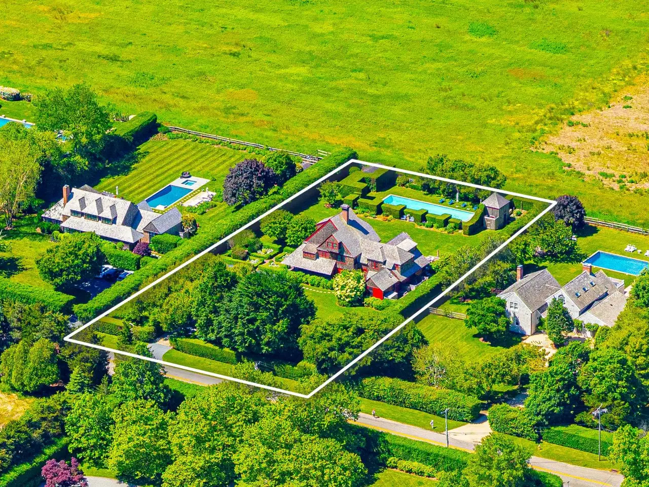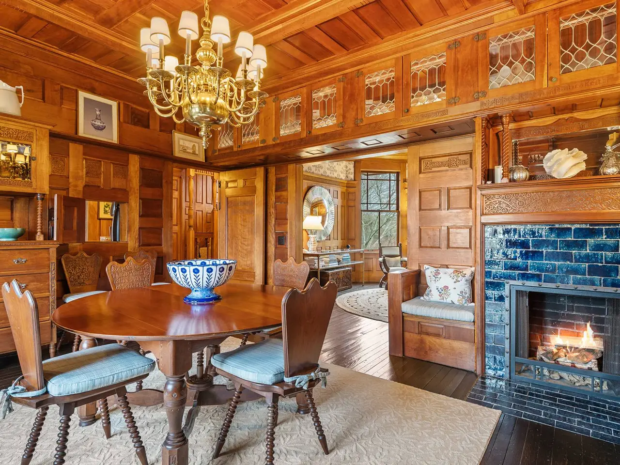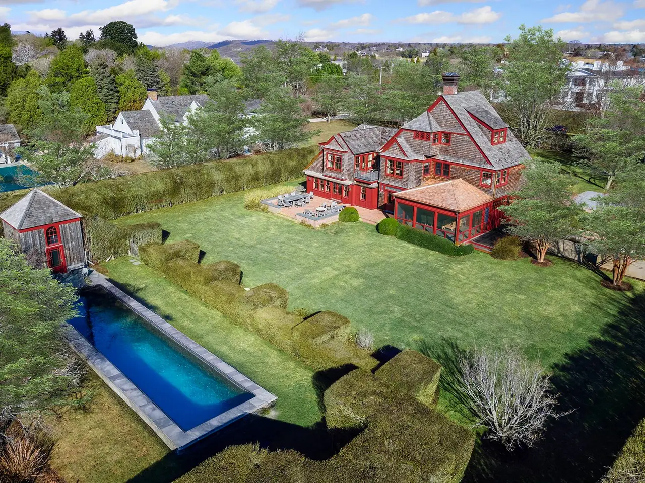 Nestled in the heart of Water Mill South, this historic luxury estate is a rare opportunity to own a masterpiece of Shingle Style architecture. Renovated in 2007 and conceived and built in 1884 by Henry Turbell Rose, Rosemary Lodge stands as a testament to exceptional craftsmanship and enduring elegance. Just minutes from the ocean, 0.93-acre grounds featuring a 4,110-square-foot residence, pool house, and a pool. This beautifully designed home boasts 5 bedrooms, 4 bathrooms, and 1 half bathroom. Impeccably preserved, the home retains its museum-quality original paneling, hand-carved woodwork, stained glass windows, and intricate moldings. Each of the five bedrooms was individually crafted. The central living hall, paneled in ash, sets the tone for this architectural gem, while four working fireplaces feature hand-carved mantels, hidden cupboards, hand-painted designs, and custom tile inserts. Throughout the home, delicate floral motifs, ships, butterflies, and birds are carefully etched into the wood, along with the initials 'RL,' a homage to its storied past. The grand master suite is a private sanctuary, complete with a spa-like ensuite bath, a spacious walk-in closet, and a romantic terrace overlooking serene Hamptons farmland. A second-floor media room with a big-screen TV and fireplace offers the perfect retreat for gatherings. Designed for elegant entertaining, the chef's eat-in kitchen features a massive center island, professional gas stove with broiler, and seamless access to the outdoor lounge and dining area. Outside, a meticulously maintained rose garden greets visitors at the entrance, while the lush backyard oasis boasts a heated pool, pool house with a full bath and outdoor shower, and an alfresco cooking station with a large refrigerator and vegetable garden. Additional modern amenities include a state-of-the-art darkroom for film and photographic development, a dedicated exercise and bicycle shed, ample storage, and a newly installed electric vehicle charging station. Recognized in Houses of the Hamptons, Rosemary Lodge is listed on both the State and National Register of Historic Places for its exceptional integrity and preservation. This architectural treasure offers the rare chance to own a piece of Hamptons history, blending timeless elegance with modern luxury.