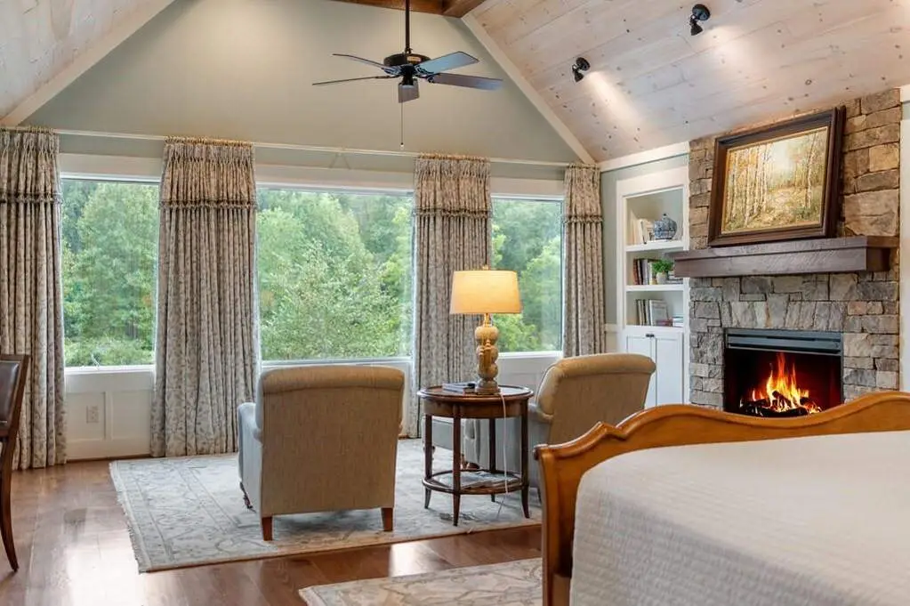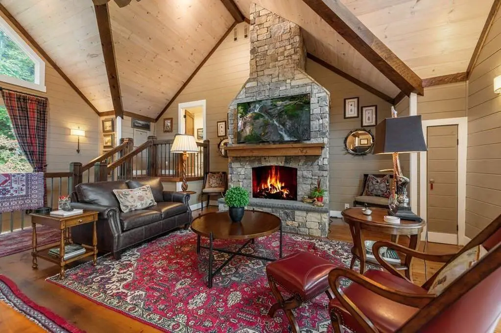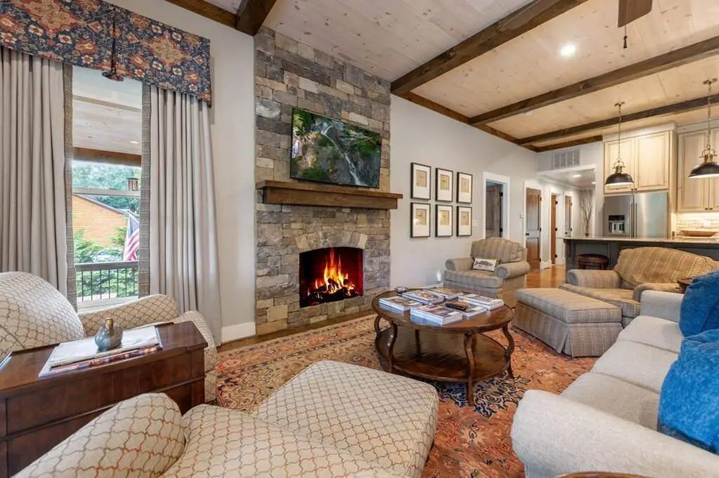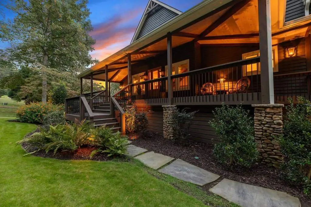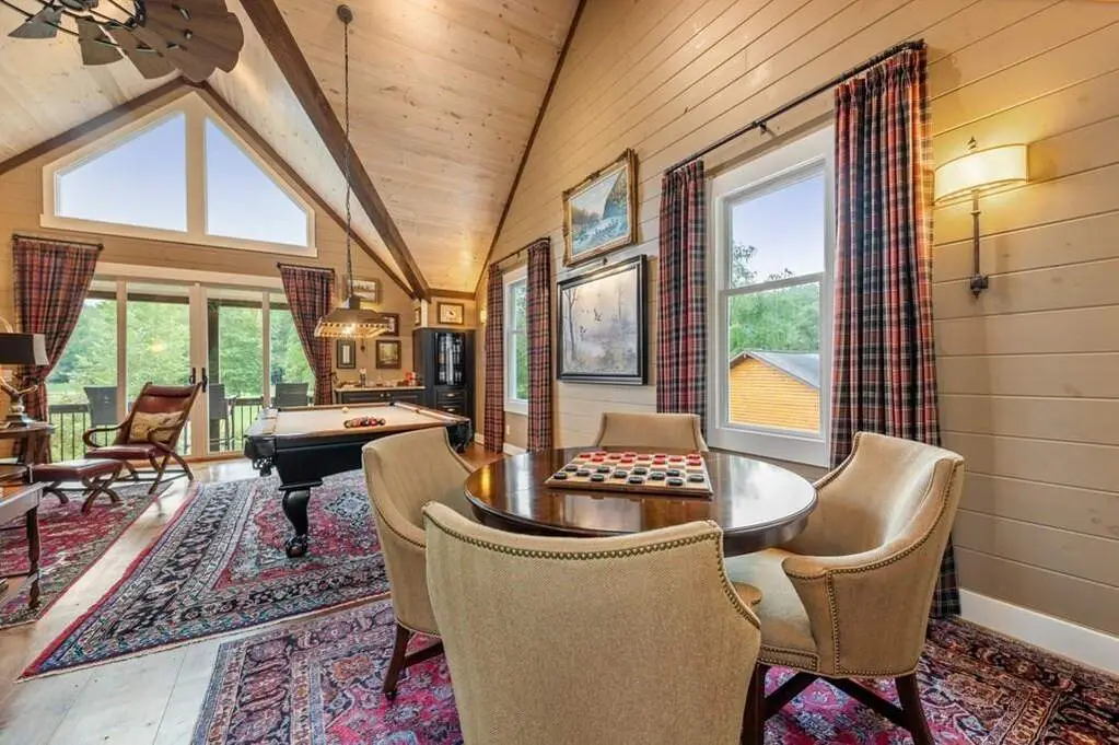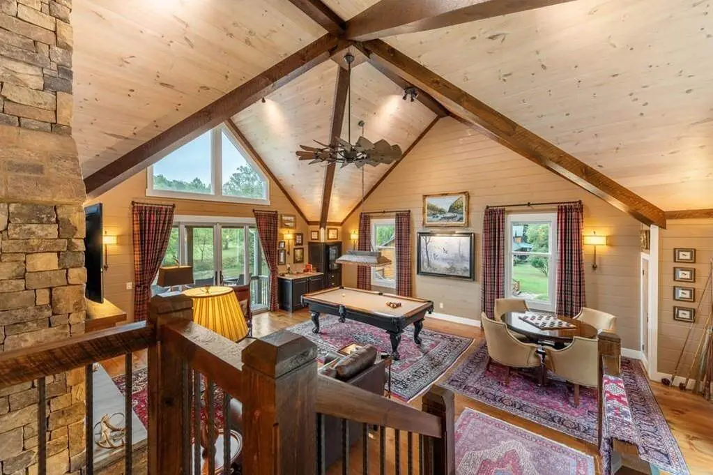 River's Edge is a 6-bedroom, 5-bathroom, fully furnished home with 114' of Toccoa River frontage. It underwent a complete remodel and landscape transformation in 2020, interior designed by Cindy Trimble of Studio Trimble Design of Blue Ridge, GA. The home has 5643 (+/-) heated and cooled sq. ft., 1,400 sq. ft. of front porch, 1,600 sq. ft. of porch facing the river, 16x16 deck extending over the river, a hot tub, and rock firepit with two sets of rock steps leading to the river. The kitchen, living, and dining areas are all open with lots of counter space for cooking and entertaining. Beautiful wide-plank eastern pine floors are featured throughout, with Persian rugs and tasteful dcor that provide a sophisticated lodge feel. The home has three master suites, two on the main floor and one on the second floor. The second-floor master suite features three closets, double vanity sinks, large walk-in shower with separate soaker tub, and heated floors. The second floor also has a bedroom with three single beds and one double bed, plus a full bathroom. The basement has a large living area; two bedrooms, one with a queen bed, and one with four full beds; a full bathroom with double sinks, and walk-in shower. There are four Tennessee fieldstone fireplaces in the home. Located above the garage is a bonus/billiards room with vaulted ceiling, bar, and private balcony. The back porch overlooking the river features a cooking area with a built-in grill and bar fridge along with a sitting area and custom-made dining table that seats eight. The professionally landscaped yard features Zeon Zosia grass, underground drainage, irrigation system, outdoor accent lighting, and camera system. With access to two fish weirs, and a fish feeder that feeds trout daily, it offers some of the best fishing on the tailwater! The attention to detail in this home is something to see and appreciate.