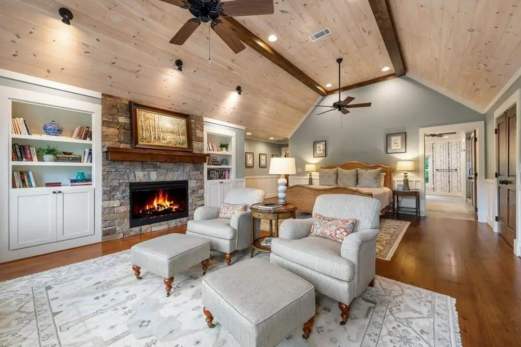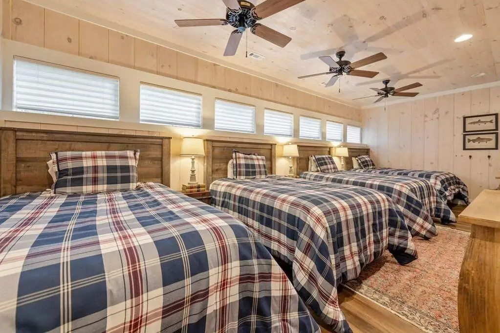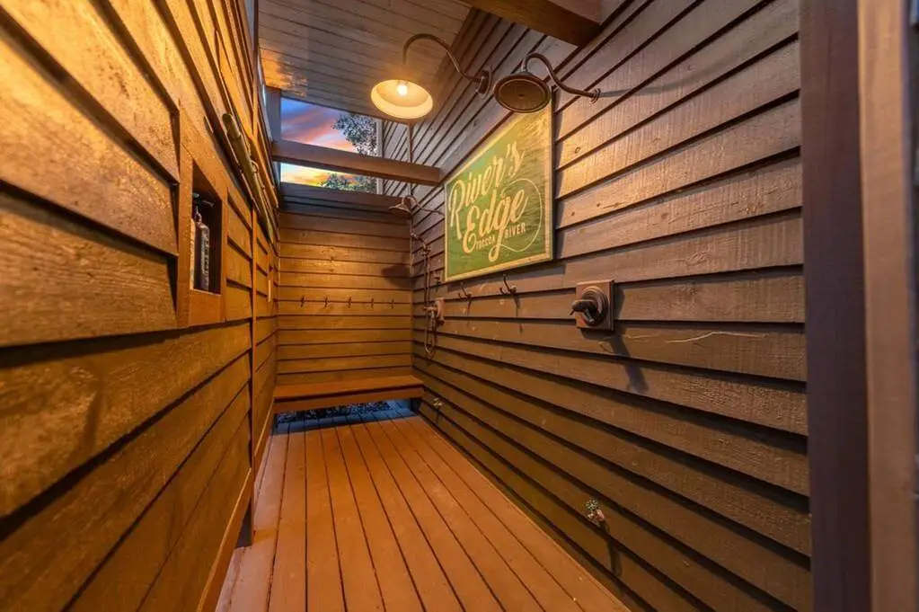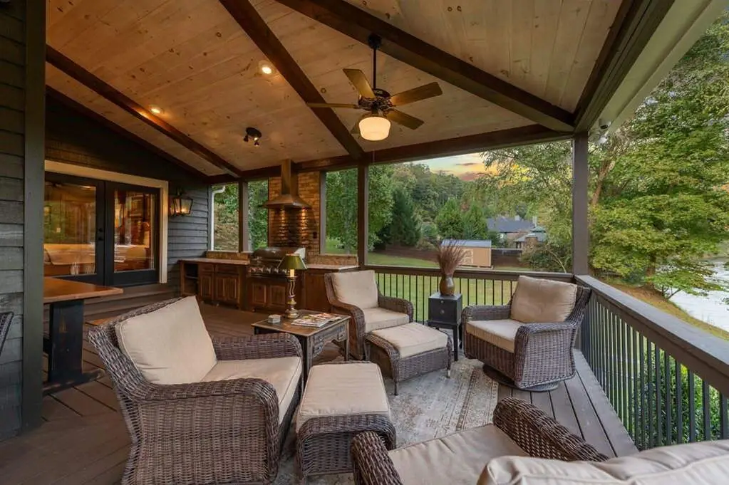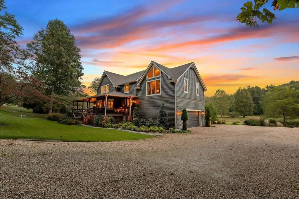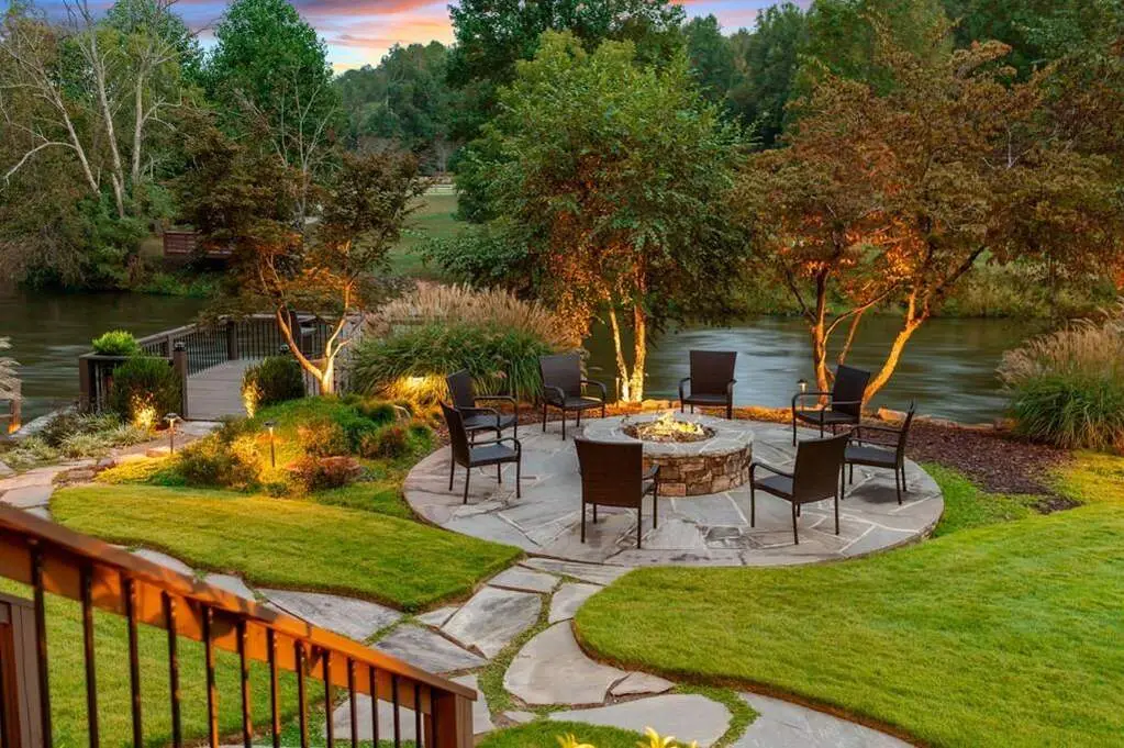 River's Edge is a 6-bedroom, 5-bathroom, fully furnished home with 114' of Toccoa River frontage. It underwent a complete remodel and landscape transformation in 2020, interior designed by Cindy Trimble of Studio Trimble Design of Blue Ridge, GA. The home has 5643 (+/-) heated and cooled sq. ft., 1,400 sq. ft. of front porch, 1,600 sq. ft. of porch facing the river, 16x16 deck extending over the river, a hot tub, and rock firepit with two sets of rock steps leading to the river. The kitchen, living, and dining areas are all open with lots of counter space for cooking and entertaining. Beautiful wide-plank eastern pine floors are featured throughout, with Persian rugs and tasteful dcor that provide a sophisticated lodge feel. The home has three master suites, two on the main floor and one on the second floor. The second-floor master suite features three closets, double vanity sinks, large walk-in shower with separate soaker tub, and heated floors. The second floor also has a bedroom with three single beds and one double bed, plus a full bathroom. The basement has a large living area; two bedrooms, one with a queen bed, and one with four full beds; a full bathroom with double sinks, and walk-in shower. There are four Tennessee fieldstone fireplaces in the home. Located above the garage is a bonus/billiards room with vaulted ceiling, bar, and private balcony. The back porch overlooking the river features a cooking area with a built-in grill and bar fridge along with a sitting area and custom-made dining table that seats eight. The professionally landscaped yard features Zeon Zosia grass, underground drainage, irrigation system, outdoor accent lighting, and camera system. With access to two fish weirs, and a fish feeder that feeds trout daily, it offers some of the best fishing on the tailwater! The attention to detail in this home is something to see and appreciate.
