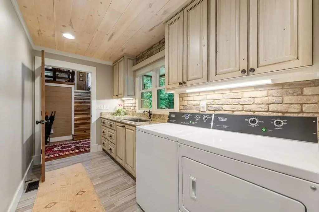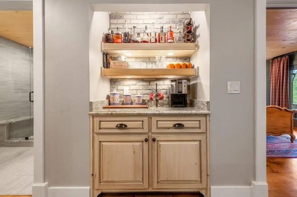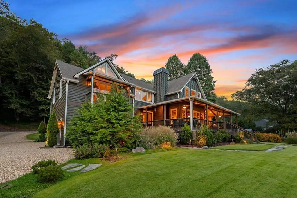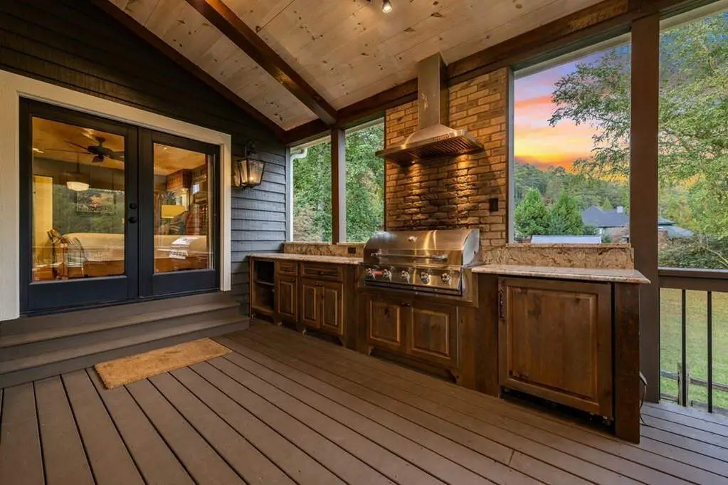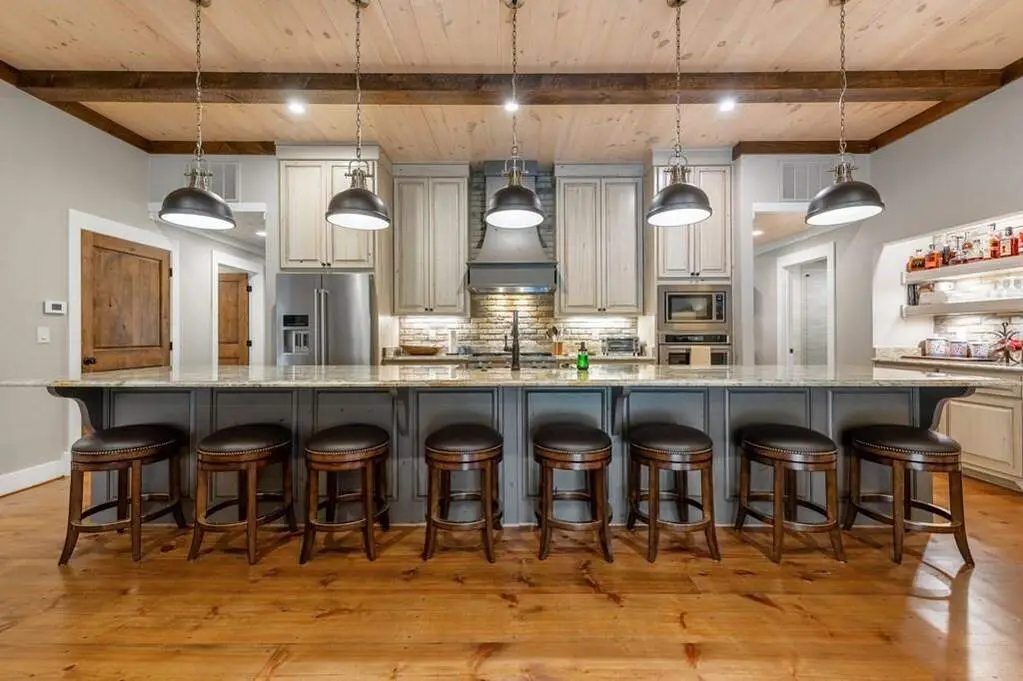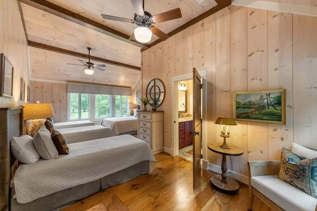 River's Edge is a 6-bedroom, 5-bathroom, fully furnished home with 114' of Toccoa River frontage. It underwent a complete remodel and landscape transformation in 2020, interior designed by Cindy Trimble of Studio Trimble Design of Blue Ridge, GA. The home has 5643 (+/-) heated and cooled sq. ft., 1,400 sq. ft. of front porch, 1,600 sq. ft. of porch facing the river, 16x16 deck extending over the river, a hot tub, and rock firepit with two sets of rock steps leading to the river. The kitchen, living, and dining areas are all open with lots of counter space for cooking and entertaining. Beautiful wide-plank eastern pine floors are featured throughout, with Persian rugs and tasteful dcor that provide a sophisticated lodge feel. The home has three master suites, two on the main floor and one on the second floor. The second-floor master suite features three closets, double vanity sinks, large walk-in shower with separate soaker tub, and heated floors. The second floor also has a bedroom with three single beds and one double bed, plus a full bathroom. The basement has a large living area; two bedrooms, one with a queen bed, and one with four full beds; a full bathroom with double sinks, and walk-in shower. There are four Tennessee fieldstone fireplaces in the home. Located above the garage is a bonus/billiards room with vaulted ceiling, bar, and private balcony. The back porch overlooking the river features a cooking area with a built-in grill and bar fridge along with a sitting area and custom-made dining table that seats eight. The professionally landscaped yard features Zeon Zosia grass, underground drainage, irrigation system, outdoor accent lighting, and camera system. With access to two fish weirs, and a fish feeder that feeds trout daily, it offers some of the best fishing on the tailwater! The attention to detail in this home is something to see and appreciate.
