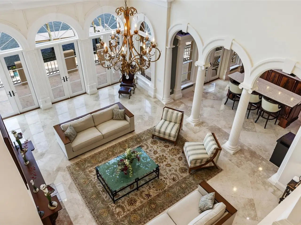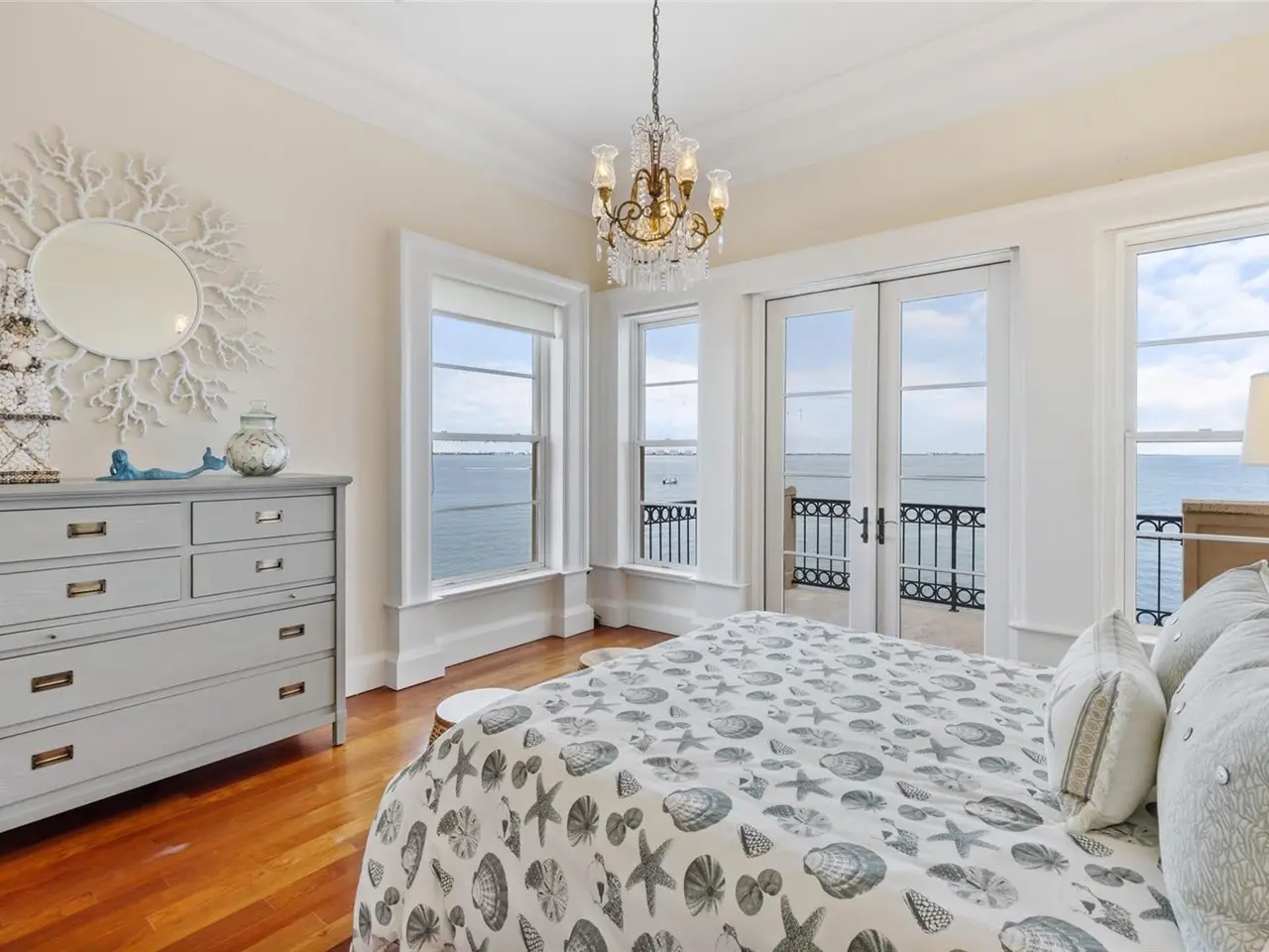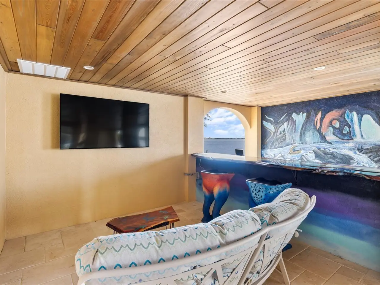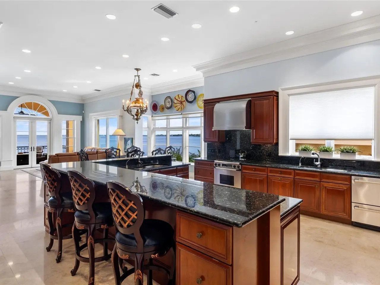 The very best value for open bayfront living near downtown Sarasota. Experience sweeping 270-degree views of Sarasota Bay from this stunning waterfront property. Perfectly positioned to capture iconic vistas of CadZan, the former estate of John Ringling, plus the coastline of Longboat Key and spectacular sunsets. This 7, 000 sq. ft. residence offers exceptional privacy and direct access to deep sailboat water. With a 17 foot elevation, this incredible home has many quality features that you must see to appreciate. Located in Ringling Point, a private cul-de-sac of just 11 homes within the sought-after community of Sapphire Shores, this property is minutes from downtown Sarasota, yet feels worlds away. The home features 5 bedrooms, 3 full bathrooms and 2 half baths, multiple living areas, an elevator serving all floors, and a flexible layout ideal for families, entertaining, or multi-generational living. The main living level includes a formal living room with soaring 24-foot ceilings. Walls of windows fill the space with natural light and frame breathtaking views from every angle. A gas and wood-burning fireplace adds warmth and character, while a full-service bar with a tap dispenser, beverage coolers, and custom cabinetry is perfect for entertaining. The chefs kitchen is outfitted with custom wood cabinetry, granite countertops, dual Dacor gas ranges with stainless hoods, Sub-Zero refrigeration, double ovens, warming drawers, and two dishwashers. A spacious island with seating provides ample space for casual dining or large gatherings. An expansive terrace overlooking the bay runs the width of the main level and is accessible from the living room, bar area, family room off of the kitchen and the guest bedroom. The owner's retreat spans the entire second-floor right wing and features a private sitting area with fireplace, a full-length terrace overlooking the bay, an oversize dressing room with double walk-through closets, and a spa-style bath with a walk-in rain shower and pedestal tub. Just outside the suite is a temperature-controlled wine room. There are two large guest bedrooms on the left wing. Additional features include a 4-car garage, recording studio, hobby and flex rooms, and abundant storage throughout. The home also includes a clay tile roof (2019) and cement block construction built on pilings. Outdoor living is equally impressive. The newer lagoon-style pool features a grotto lounge shelf and gas-heated spa, surrounded by expansive covered terraces with tongue-and-groove ceilings and multiple seating areas to enjoy spectacular sunsets. The private dock extends into the bay, offering deep water access ideal for sailboats and larger vessels, with no fixed bridges to the Gulf. This prime location offers convenient access to downtown Sarasota, Gulf beaches, the Ringling Museum, IMG Academy, University Town Center, and Sarasota-Bradenton International Airport. A rare opportunity to own a legacy estate with unmatched views, quality, and location in one of Sarasota's most desirable bayfront communities.