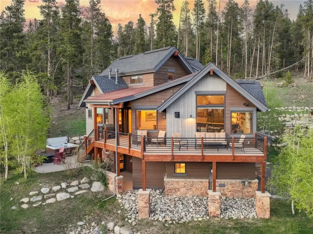 Welcome to your dream mountain escape in the exclusive Columbia Lode neighborhood—just steps from Main Street, the BreckConnect Gondola, hiking trails, fine dining, and boutique shopping. This 4-bed, 4-bath single-family home blends timeless design with mountain-modern elegance. Built in 2015 by Westridge Development and Colvin Construction, the home features rich hardwood flooring, custom alder cabinetry, and oversized windows showcasing panoramic ski area views and tons of natural sunlight. Enjoy a proper chef’s kitchen with Viking appliances, slab granite countertops, and farmhouse sink. Multiple living areas include a great room, private sitting loft, and a cozy family room with wet bar. Three stone fireplaces add warmth and charm throughout. The luxurious primary suite offers a spa-like bath and walk-in closet. Perched within mature Aspens and beautifully landscaped grounds, step outside to your private outdoor oasis featuring an oversized patio, hot tub, fire pit, and ample deck space—perfect for entertaining or unwinding under the stars. Sold fully furnished with high-end appointments, this home invites you to settle in immediately and enjoy everything Breck has to offer. Park your ride on the newly epoxy-sealed garage floor and never have to drive it again. Live your best life with low-maintenance living in a residence where craftsmanship, comfort, and unbeatable access to this iconic ski town and adventure come together perfectly. With ski lifts, trails, and town just steps away, this home embodies the best of Breckenridge living—luxury, location, and lifestyle.
