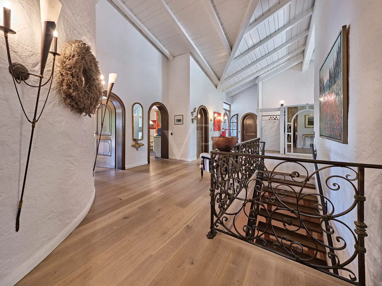 This spacious bungalow-style villa with room heights of up to 5 meters is located on a spacious 3,159 m² plot and offers a living space of around 330 m². The rooms are furnished to a high standard throughout and offer superior living comfort. Upon entering the house, you are greeted by a bright and spacious entrance area with a checkroom and access to the double garage. Numerous windows, some of which are floor-to-ceiling, provide plenty of natural light and an inviting atmosphere. The spacious living/dining room has a water-bearing tiled stove and large panoramic windows that lead onto the terrace and into the garden on the south side. The dining area forms a successful transition from the open-plan living area to the kitchen, which can be closed off. The fireplace room with indoor and outdoor fireplace is also ideal as a visitor or guest room. The kitchen, with high-quality slate flooring, has exclusive furnishings and brand-name electrical appliances. The master bedroom has a separate dressing room. The adjoining hallway is designed as a closet room and leads to two further bedrooms or children's rooms, each of which has its own conservatory. The daylight bathroom impresses with its comfortable fittings. A separate WC is available for guests. A particularly practical feature is that all rooms on the ground floor have their own terrace or garden access. The almost all-round natural stone terrace is partially covered and offers a variety of uses in almost any weather. The floors on the first floor are laid with very high-quality solid floorboards and parquet flooring. The doors are made of solid wood in an elegant arched style. The predominantly newly glazed wooden windows are fitted with custom-made fly screens. The basement offers additional comfort with a large spa area, including a swimming pool with counter-current system, a shower room, a sauna for 6-8 people, lounging areas and daylight windows. Four further basement rooms offer space for fitness/yoga, laundry, hobbies and a workshop. The fitness/yoga room has its own shower and WC. The heating is provided by district heating (wood chips). A photovoltaic system with an output of 10 kW and a Tesla buffer battery of the same size as well as a solar thermal system with a 750-liter buffer storage tank ensure an environmentally friendly energy supply. The outdoor area includes a tiled outdoor pool with a roll-down cover, a pavilion with thermal insulation glazing and a copper roof as well as two garden sheds. There is also a double garage with electric doors and 2-3 outdoor parking spaces. An alarm system for the house and garden provides additional security. This villa offers a wide range of possible uses and a high level of living comfort. As it was built in a mixed area as a former business villa, commercial use can also be considered here. If required, a commercial space of up to approx. 700 m² can be leased in the neighboring commercial hall. The location is very quiet despite the proximity to the commercial enterprises. The south-facing garden in particular offers unparalleled privacy and an unobstructed view of meadows and fields. As the businesses close at 6 p.m. at the latest and there is generally no work at all at weekends, the villa on offer is virtually a quiet, secluded location during these periods. You will receive further information with our detailed exposé.