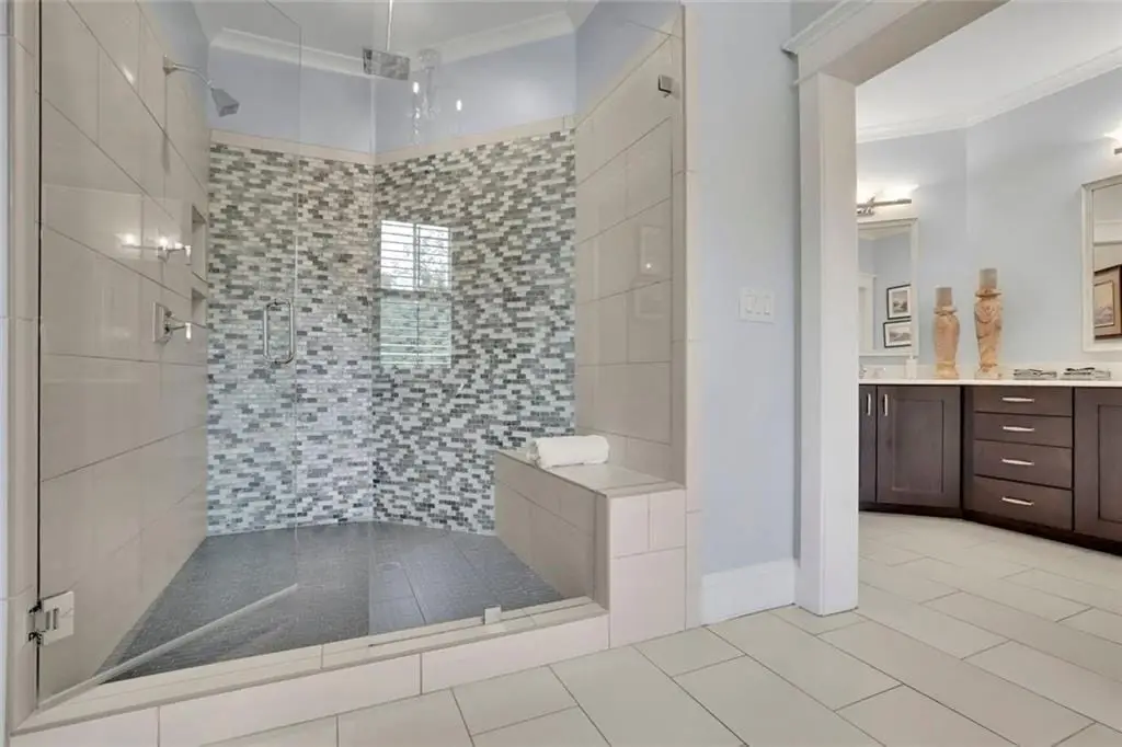 • Soaking tub and frameless shower in spa bath