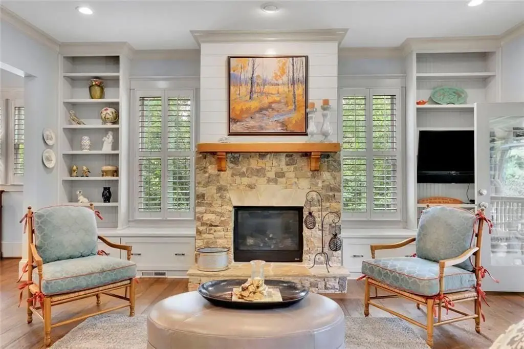 • Stone gas fireplace with wood mantle