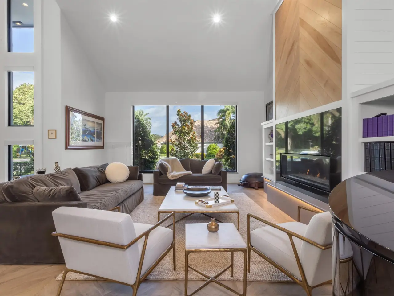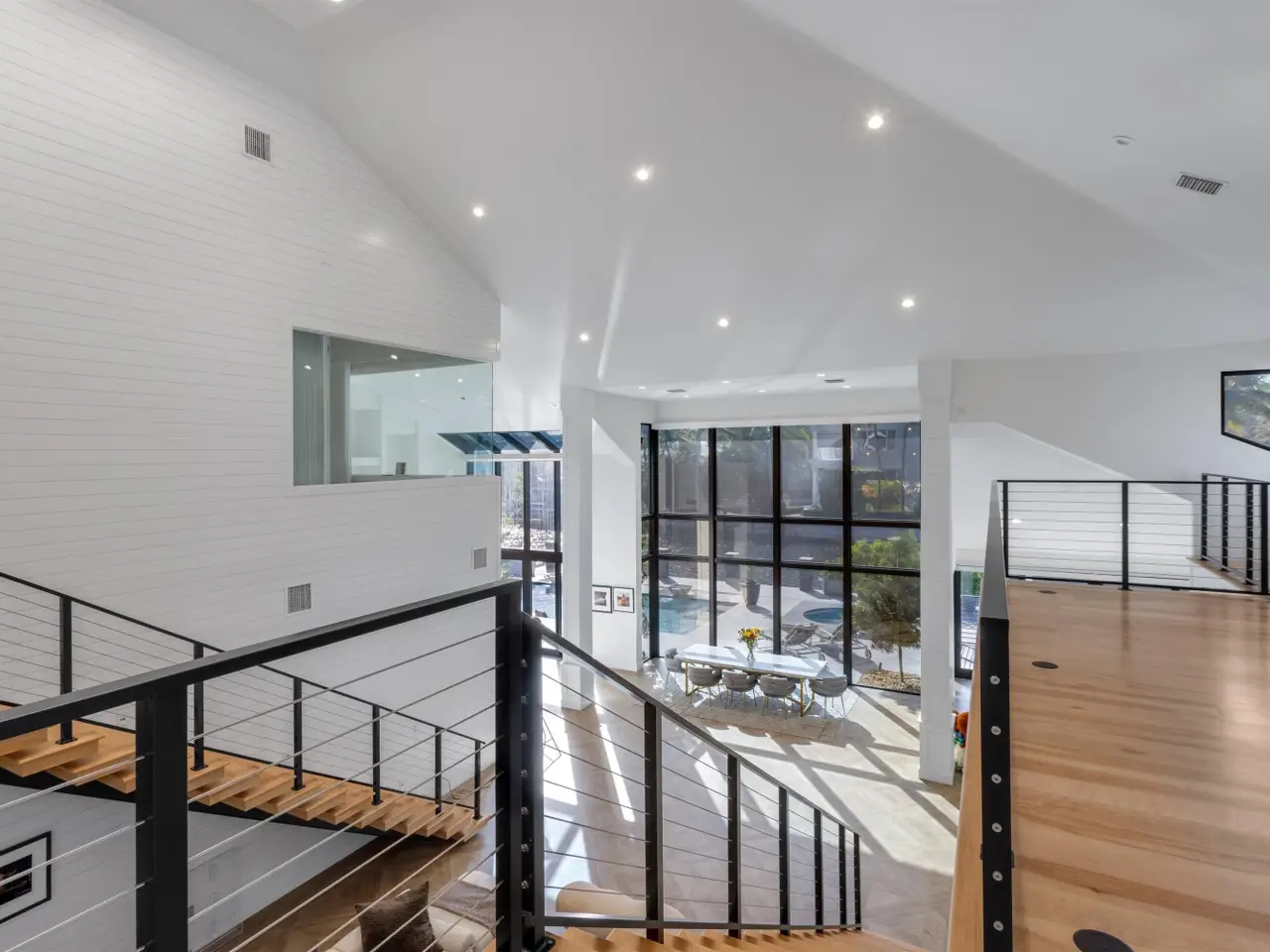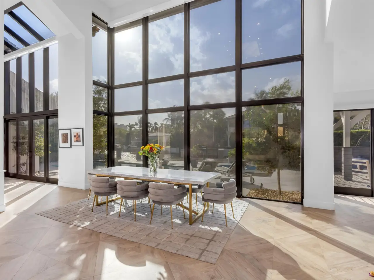 Blending contemporary architecture with lofty urban chic, this dramatic yachting estate offers a voluminous open floor plan with stunning interiors, serene water views, and direct ocean access. A massive glass grid entry with oversized custom double doors reveals a towering 30-foot foyer, which is a prelude to the voluminous expanse of this open-plan design. A skylit gallery sitting area is framed by twin suspended staircases with open cable rails and recessed stair lights. The dining area offers a floor-to-ceiling expansive grid window wall view of the sun-drenched pool and waterway. Soaring shiplap walls and bleached oak designed porcelain floors provide a modern farmhouse ambience.