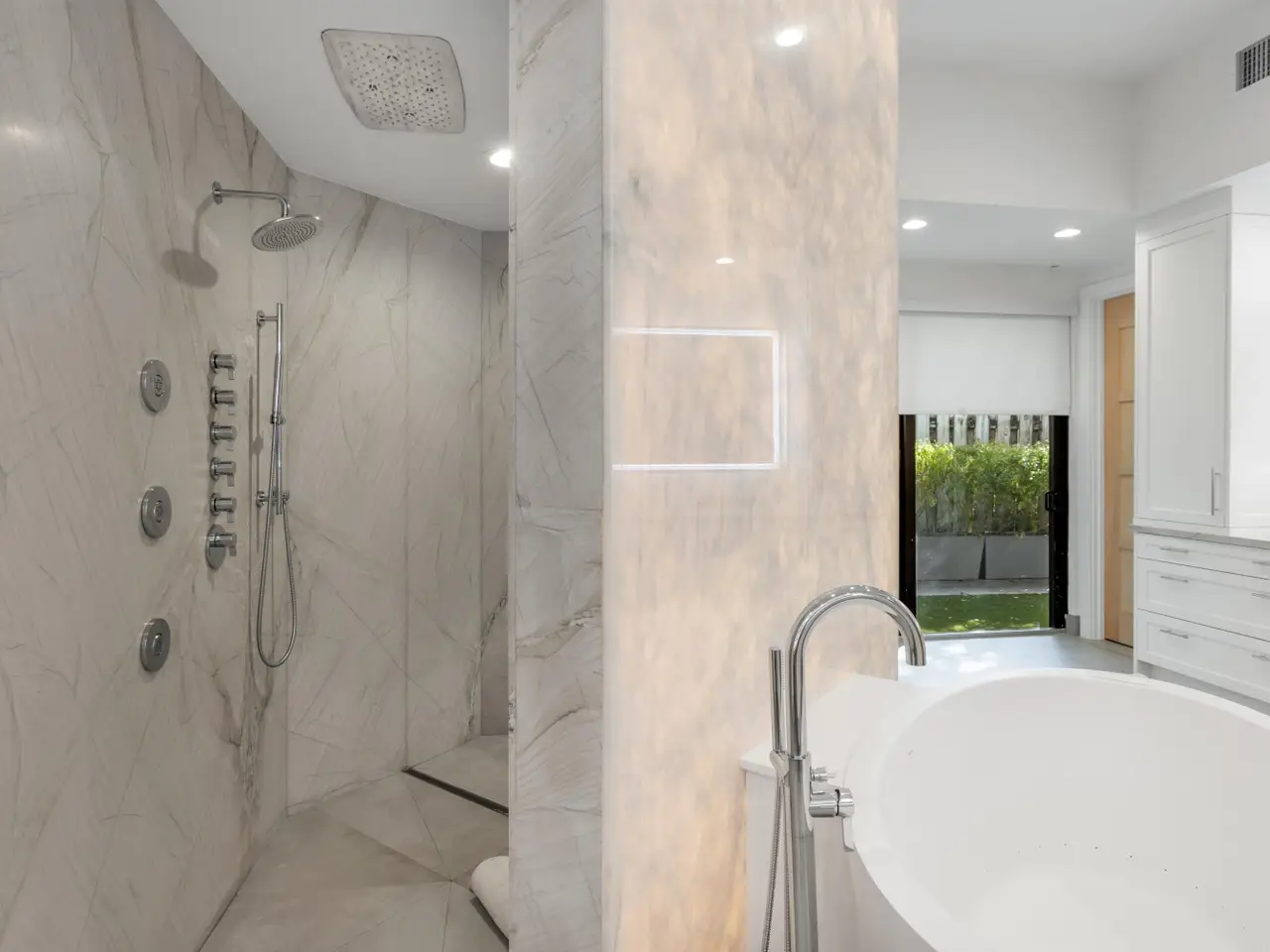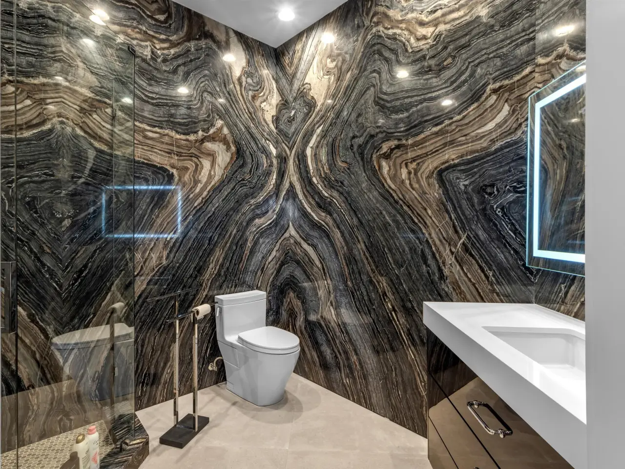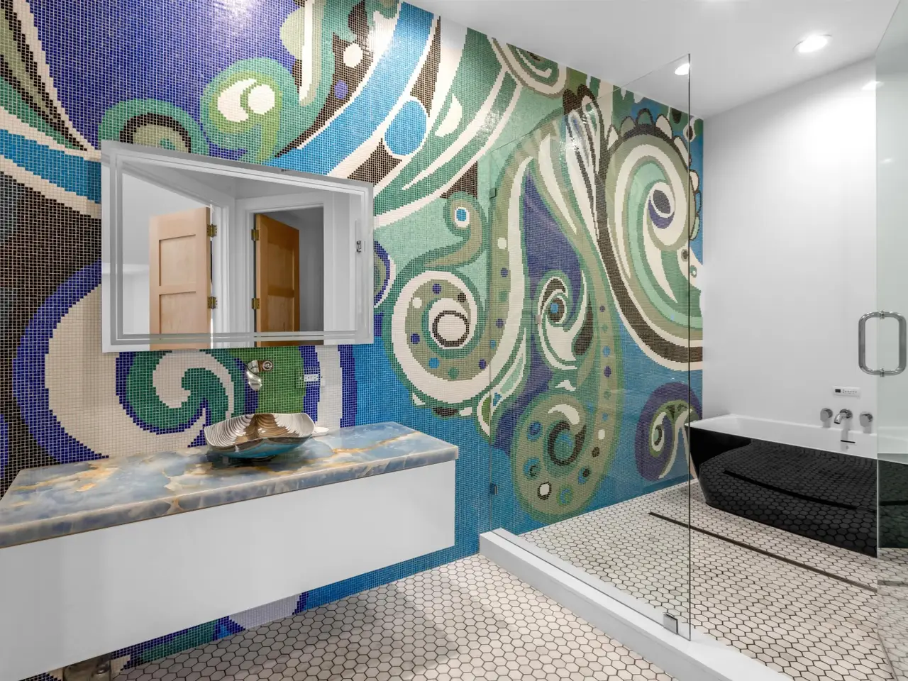 Blending contemporary architecture with lofty urban chic, this dramatic yachting estate offers a voluminous open floor plan with stunning interiors, serene water views, and direct ocean access. A massive glass grid entry with oversized custom double doors reveals a towering 30-foot foyer, which is a prelude to the voluminous expanse of this open-plan design. A skylit gallery sitting area is framed by twin suspended staircases with open cable rails and recessed stair lights. The dining area offers a floor-to-ceiling expansive grid window wall view of the sun-drenched pool and waterway. Soaring shiplap walls and bleached oak designed porcelain floors provide a modern farmhouse ambience.