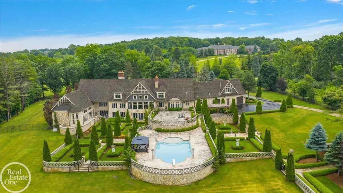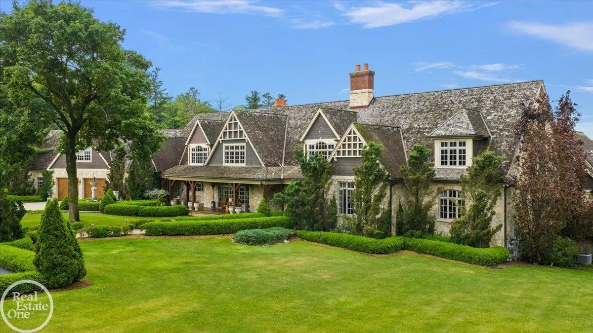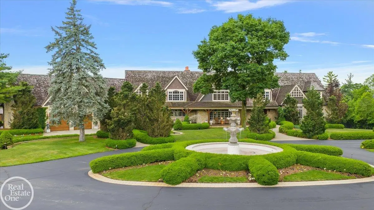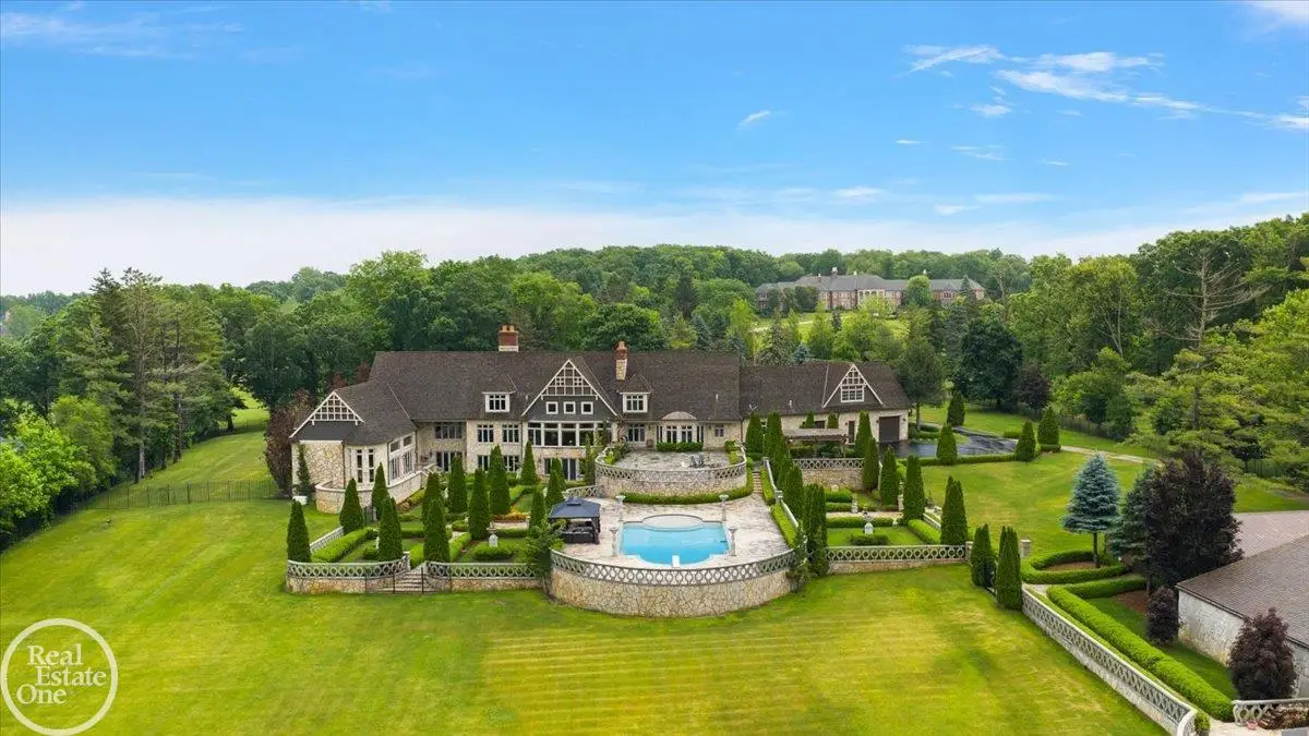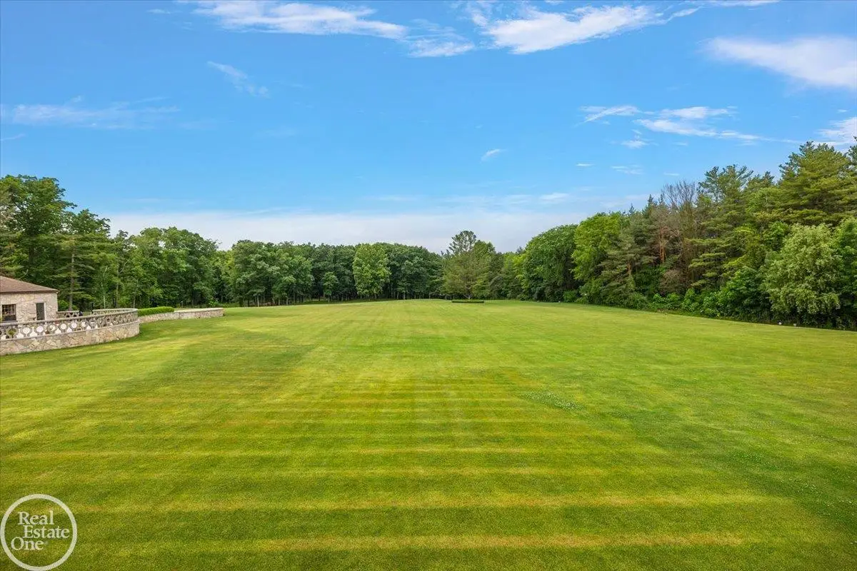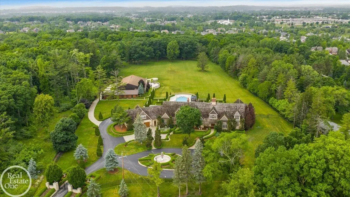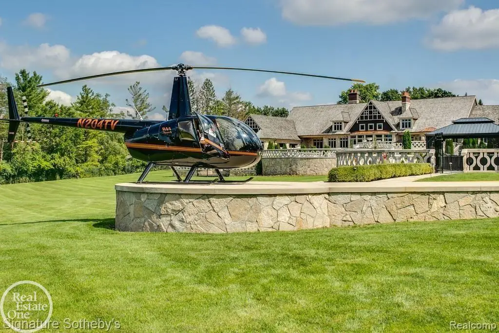 Discover an exceptional opportunity with this private 12-acre French Country Manor Estate in Oakland Township, offering over 12,000 square feet of stunning living space. Enjoy expansive terraced patios leading to beautifully designed Parterre Gardens and a built-in swimming pool measuring 25 feet by 55 feet. A helipad adds convenience for helicopter access right in your backyard, along with a state-of-the-art helicopter hangar. The property features extensive landscaping and an irrigation system covering all 12 acres, a 6-car garage, ample hangar storage for car enthusiasts, and a horse barn equipped with 6 stalls. The gourmet kitchen is a chef's dream, complete with a separate pizza oven and commercial-grade appliances. The spacious great room boasts beamed ceilings and large windows that offer views of the grounds. The estate includes 6 fireplaces, 6 bedrooms, a private loft area, maple-planked flooring, and a finished walk-out lower level with a 15-foot by 10-foot indoor lap pool and gaming spaces.
