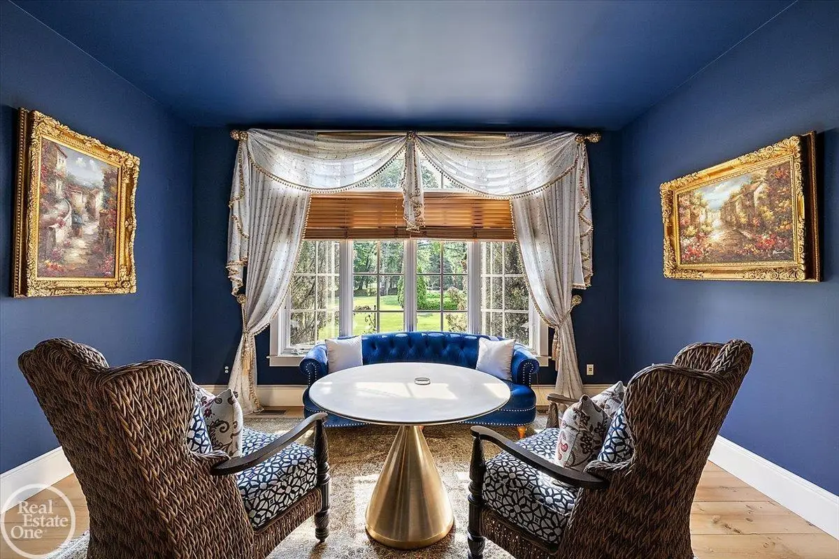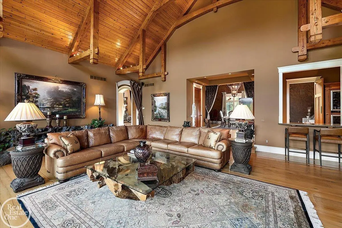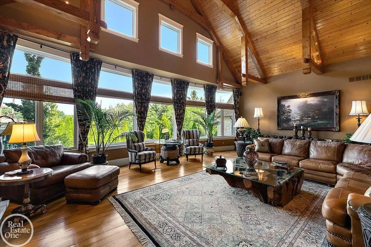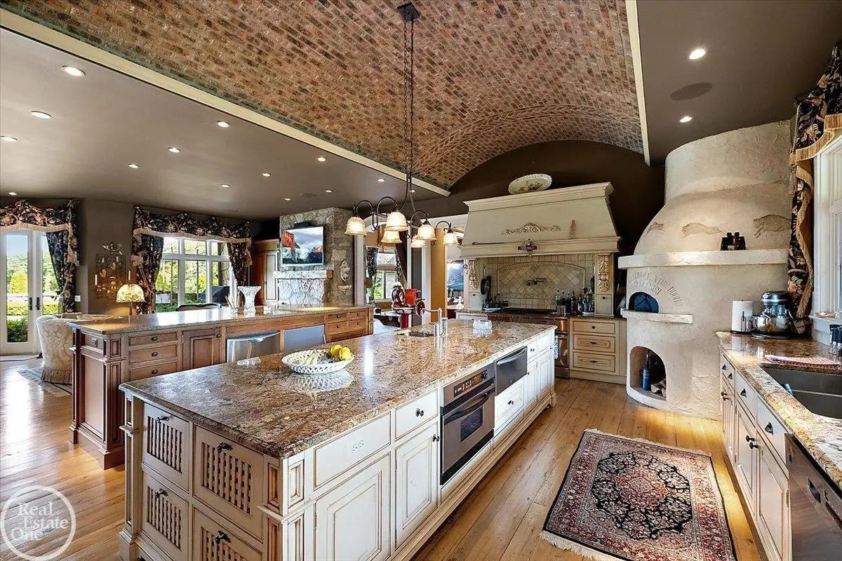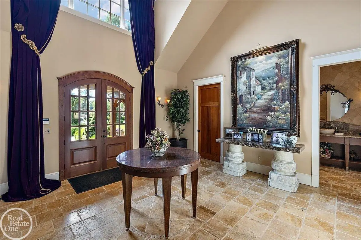 Discover an exceptional opportunity with this private 12-acre French Country Manor Estate in Oakland Township, offering over 12,000 square feet of stunning living space. Enjoy expansive terraced patios leading to beautifully designed Parterre Gardens and a built-in swimming pool measuring 25 feet by 55 feet. A helipad adds convenience for helicopter access right in your backyard, along with a state-of-the-art helicopter hangar. The property features extensive landscaping and an irrigation system covering all 12 acres, a 6-car garage, ample hangar storage for car enthusiasts, and a horse barn equipped with 6 stalls. The gourmet kitchen is a chef's dream, complete with a separate pizza oven and commercial-grade appliances. The spacious great room boasts beamed ceilings and large windows that offer views of the grounds. The estate includes 6 fireplaces, 6 bedrooms, a private loft area, maple-planked flooring, and a finished walk-out lower level with a 15-foot by 10-foot indoor lap pool and gaming spaces.