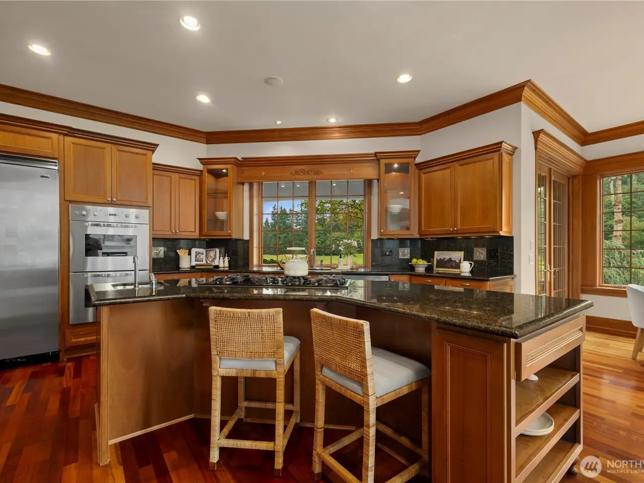 Behind the gates of Washington National Golf Club, a treelined drive leads to this former Street of Dreams home on a private half-acre overlooking the 17th fairway and reflective ponds. Beyond the patio, manicured fairways unfold against a quiet backdrop of evergreens. Inside, cherry hardwoods and crisp millwork lend warmth and elegance, while the Viking-appointed kitchen with double ovens, prep sink and wine cooler anchors gatherings. The main-floor primary suite offers a cozy fireplace, coffered ceilings and a spa-inspired bath. Upstairs, 3 en-suite bedrooms, a large bonus room, and dual staircases add versatility, complemented by a 3-car garage with golf cart bay. Here, craftsmanship and setting define a lifestyle both rare and refined.